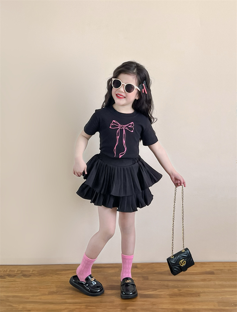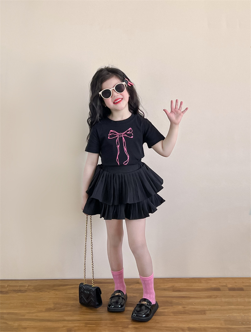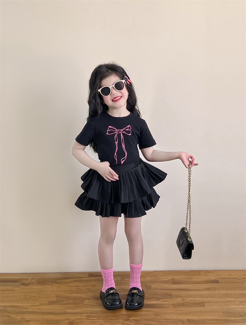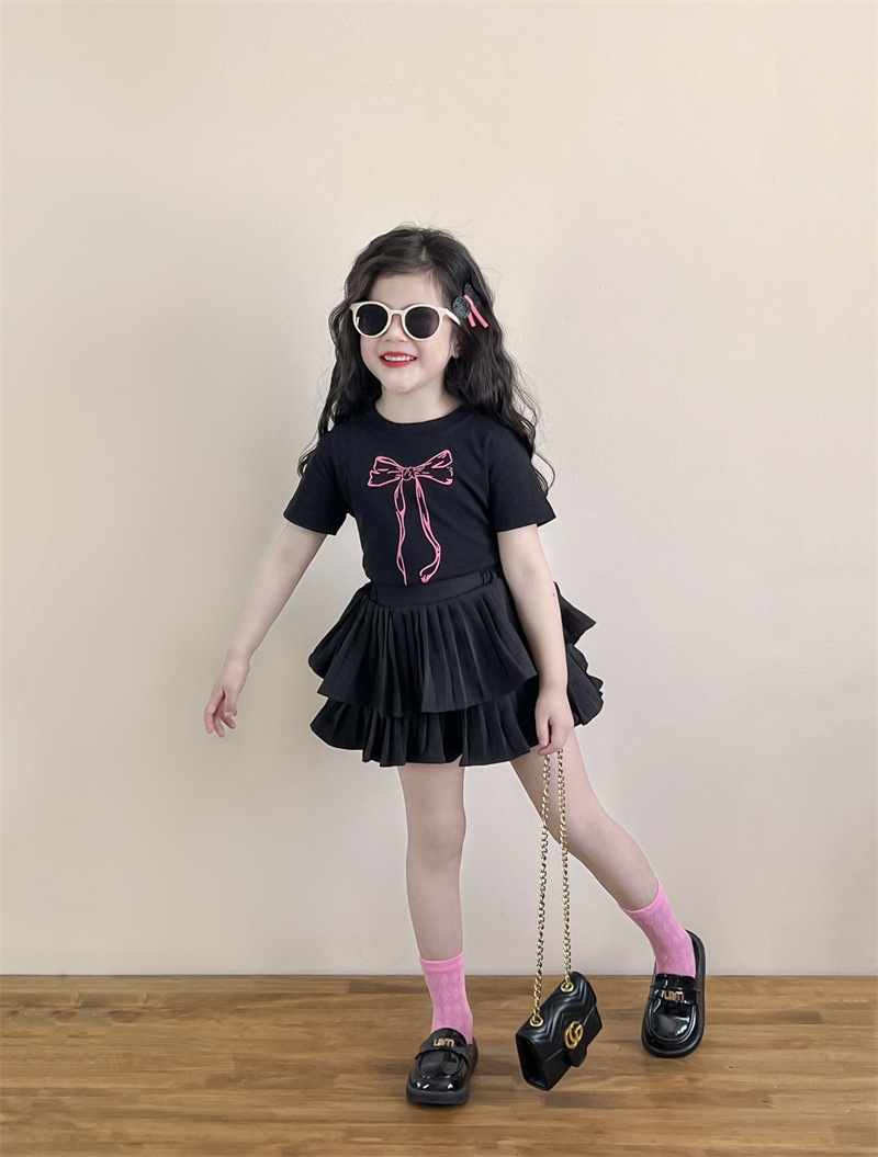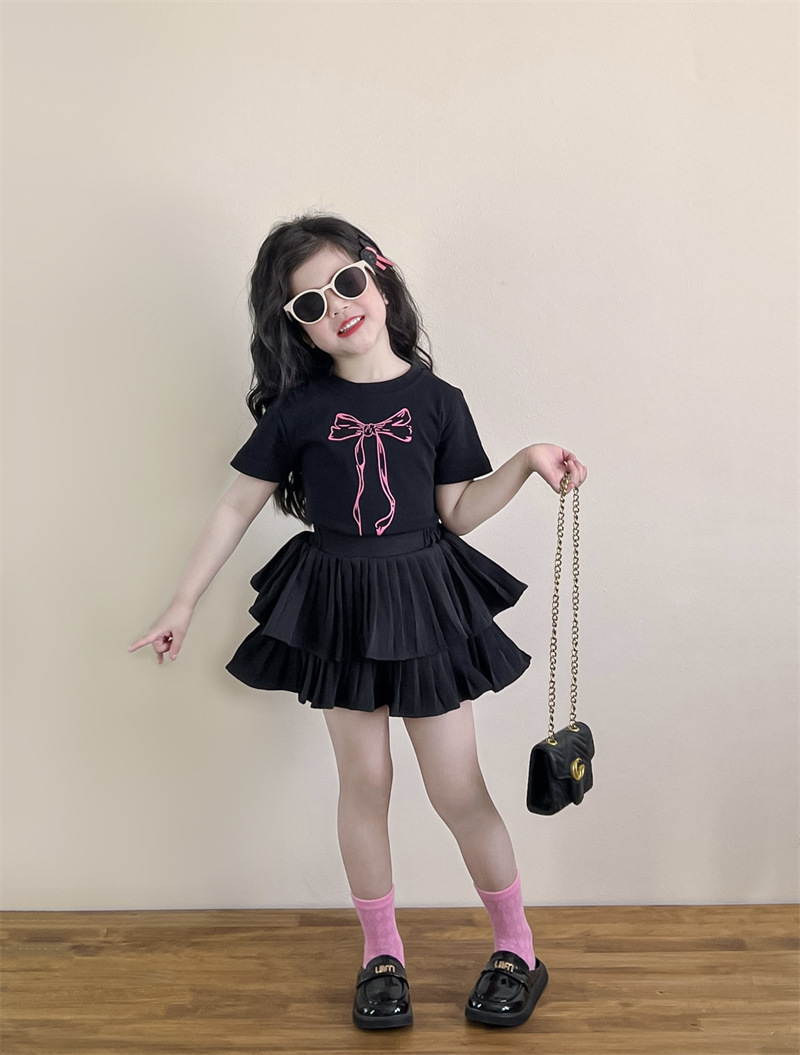 소녀 여름 달콤한 블랙 반팔 활 티셔츠 블랙 하이 허리 퍼프 케이크 스커트 트렌디 스커트