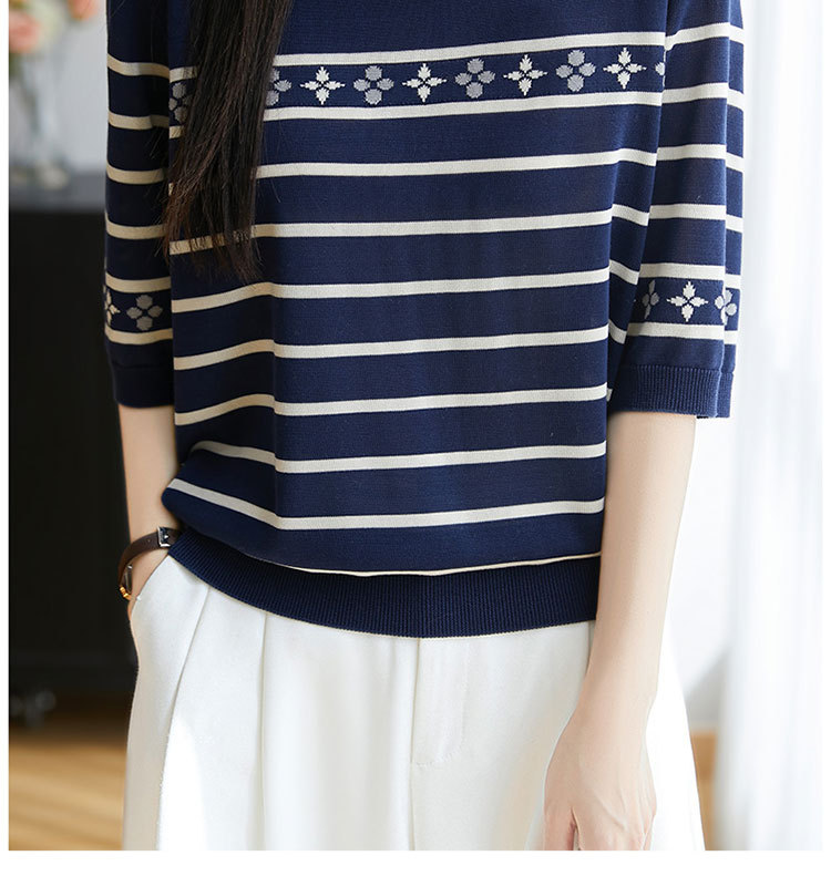 [공장 직접 공급] 자카드 스트라이프 크루 넥 텐셀 반팔 티셔츠 여성 여름 얇은 느슨한 나이 감소 아이스 실크 셔츠스토어 가기