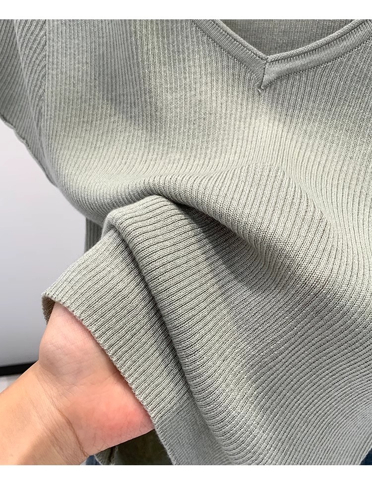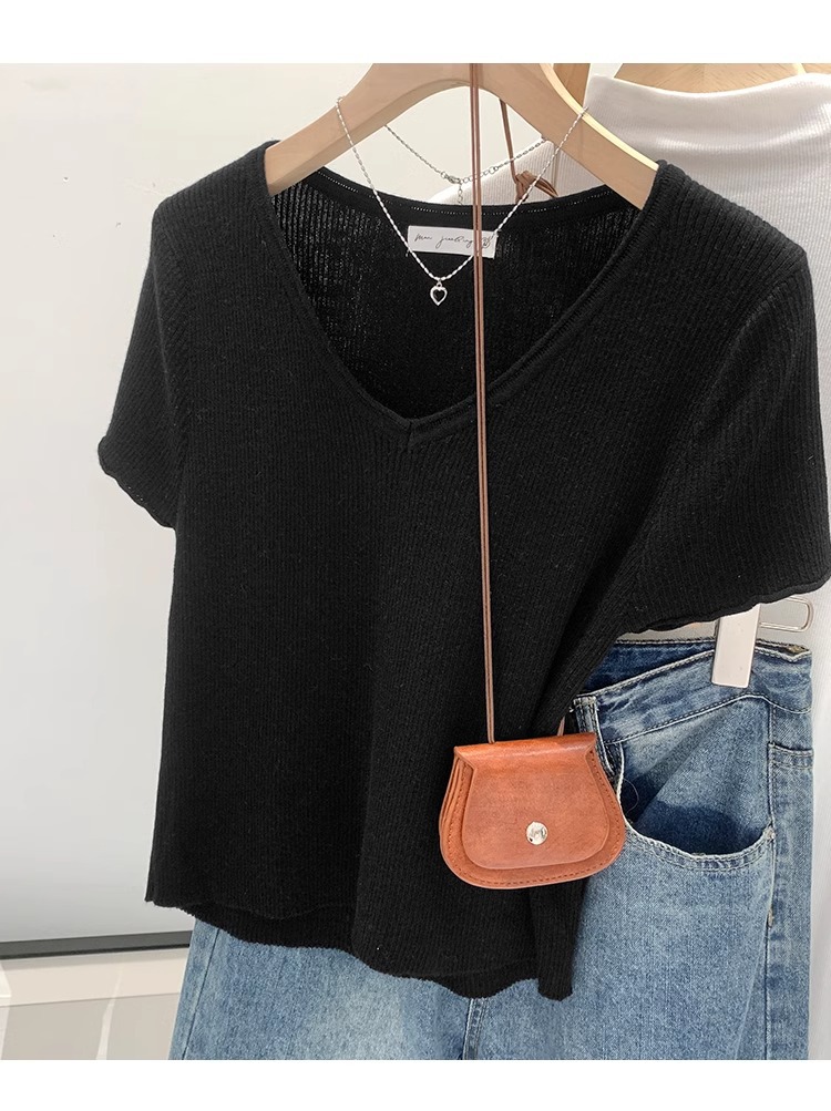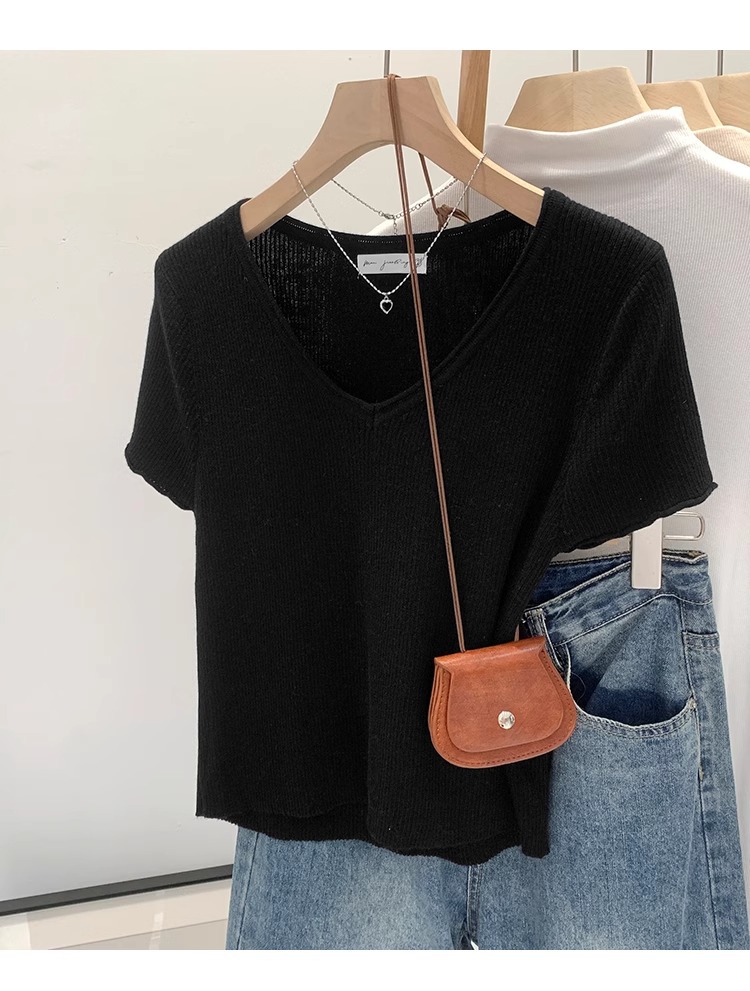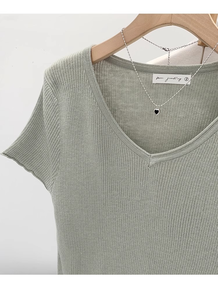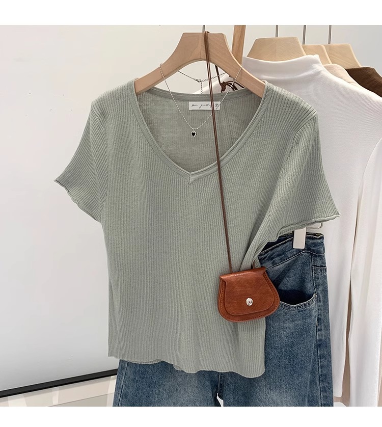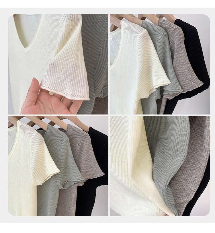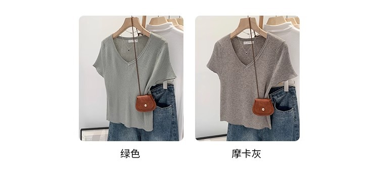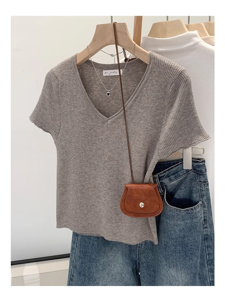 그레이 V 넥 반팔 스웨터 여성 여름 2025 새로운 독특한 아름다운 하이 엔드 느낌 짧은 티셔츠 탑스토어 가기