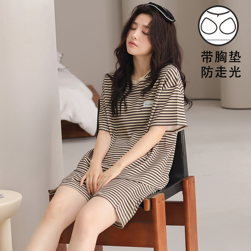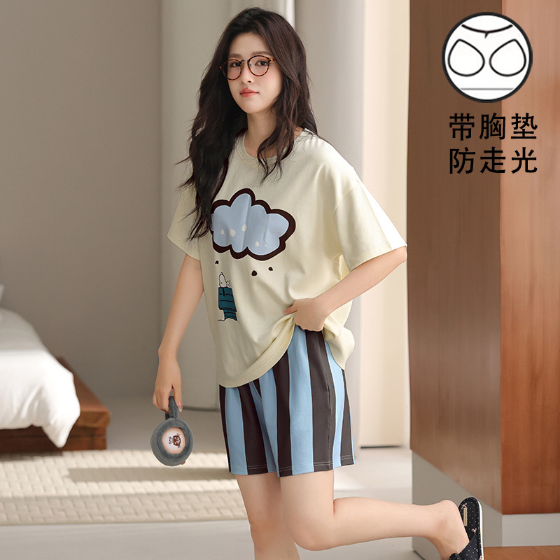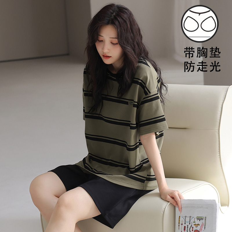 2025 새로운 도착 파자마 여성의 여름 짧은 소매 가슴 패드 외부 얇은 둥근 목 세트 달콤한 느슨한 홈 옷스토어 가기