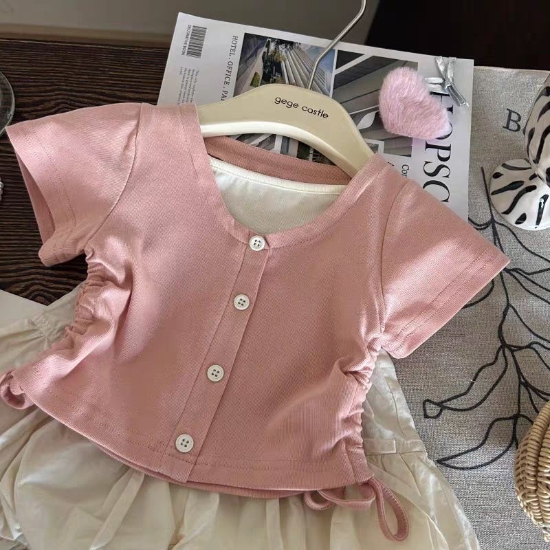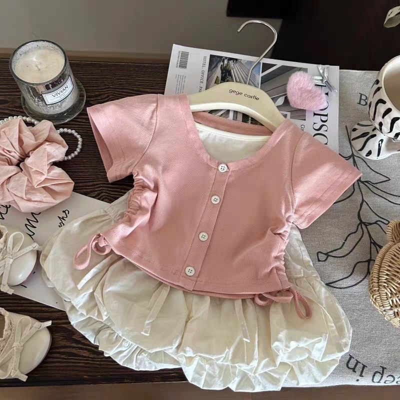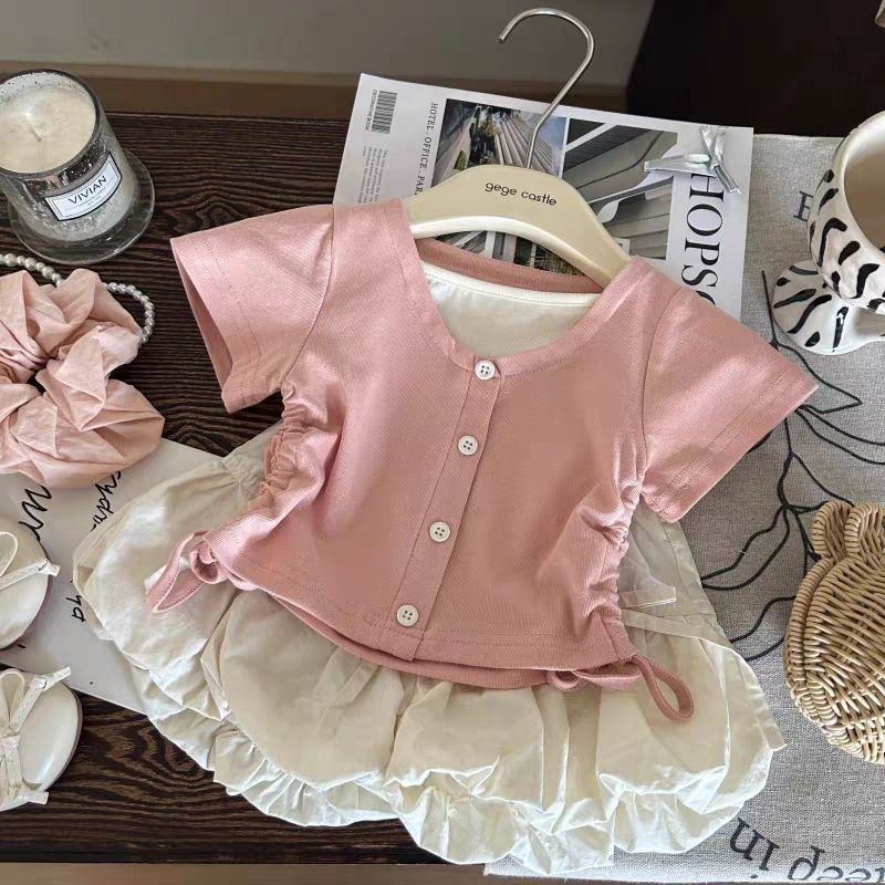 한국식 아동복 2025 여름 새 여아 가짜 투피스 드로우 반팔 티셔츠 보우 플라워 버드 바지 투피스 세트