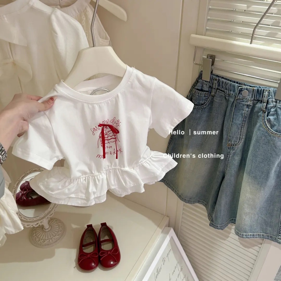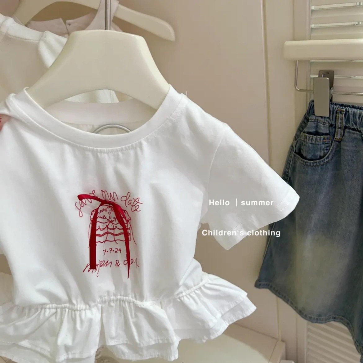 아동복 소녀 2025 새 여름 티셔츠 반팔 유행 서양식 아기 소녀 한국 스타일 활 탑