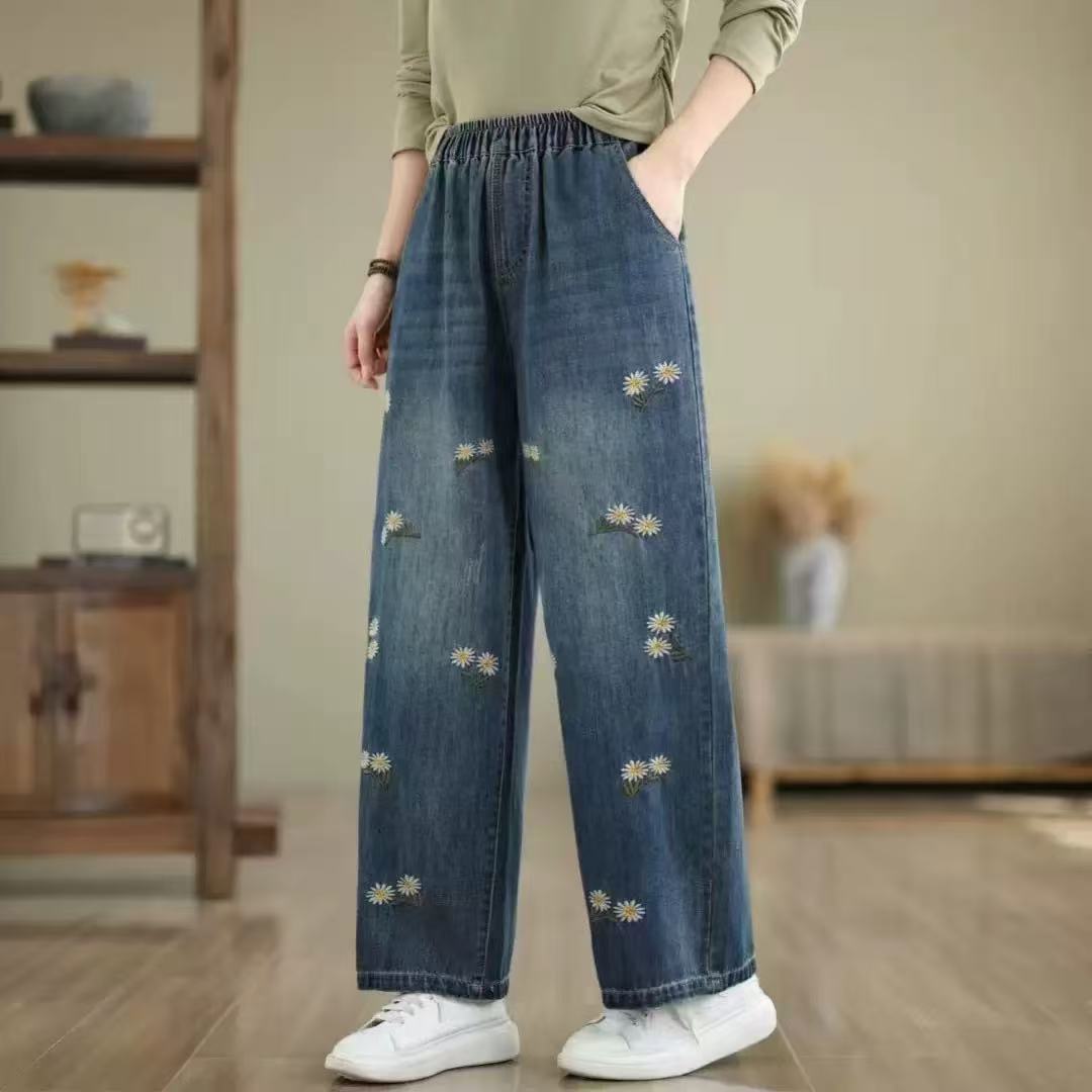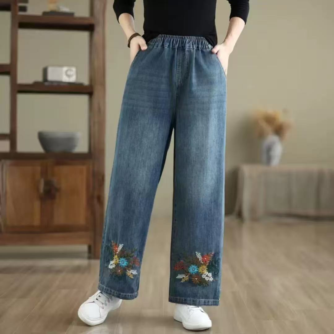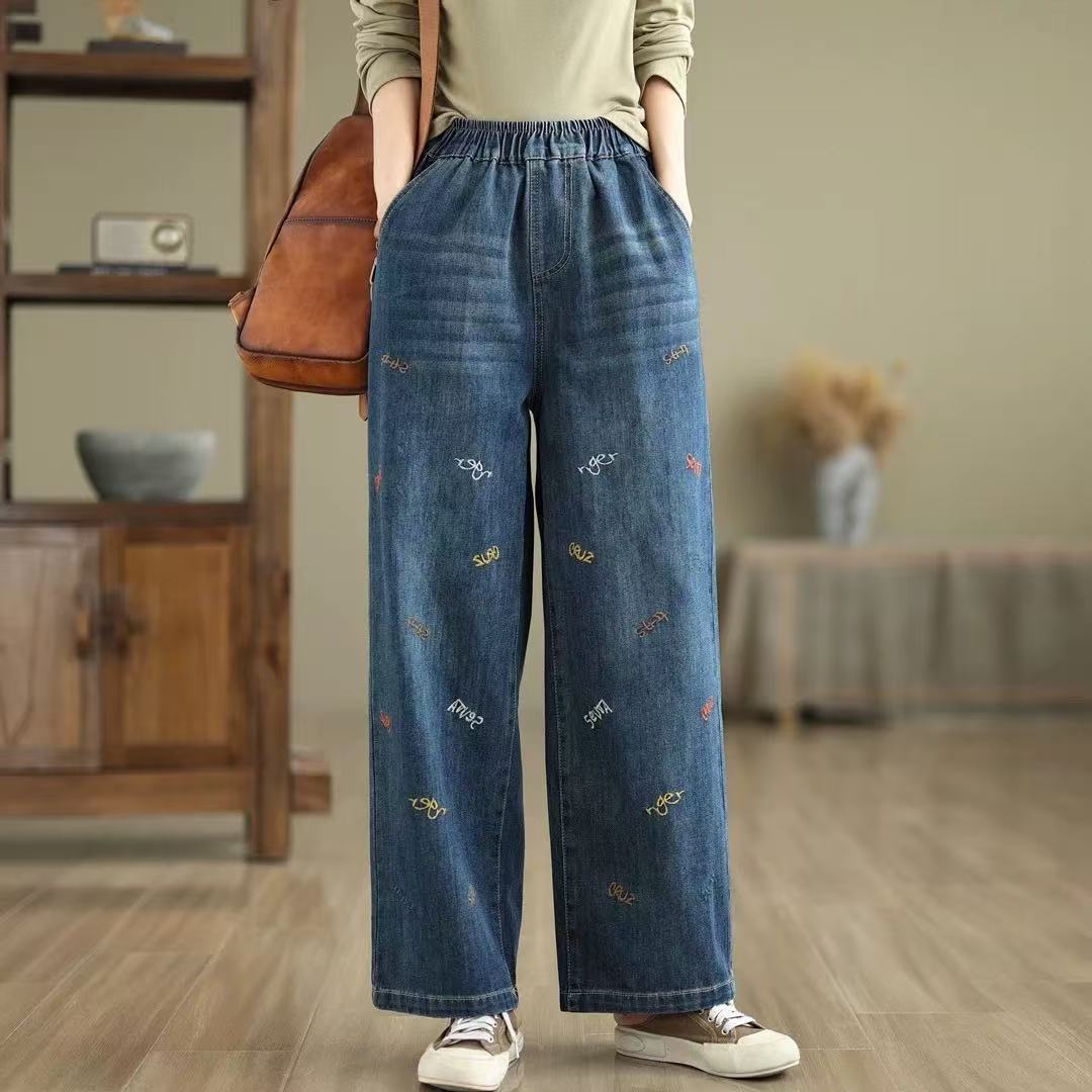 빈티지 자수 스트레이트 청바지 여성의 봄 새로운 도착 플러스 사이즈 캐주얼 대형 바지 넓은 다리 청바지스토어 가기