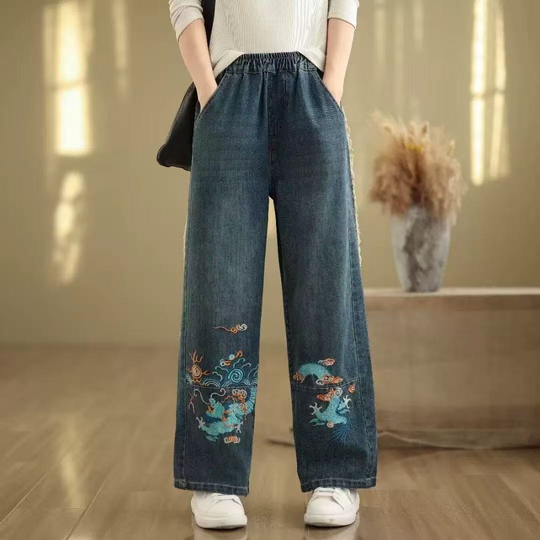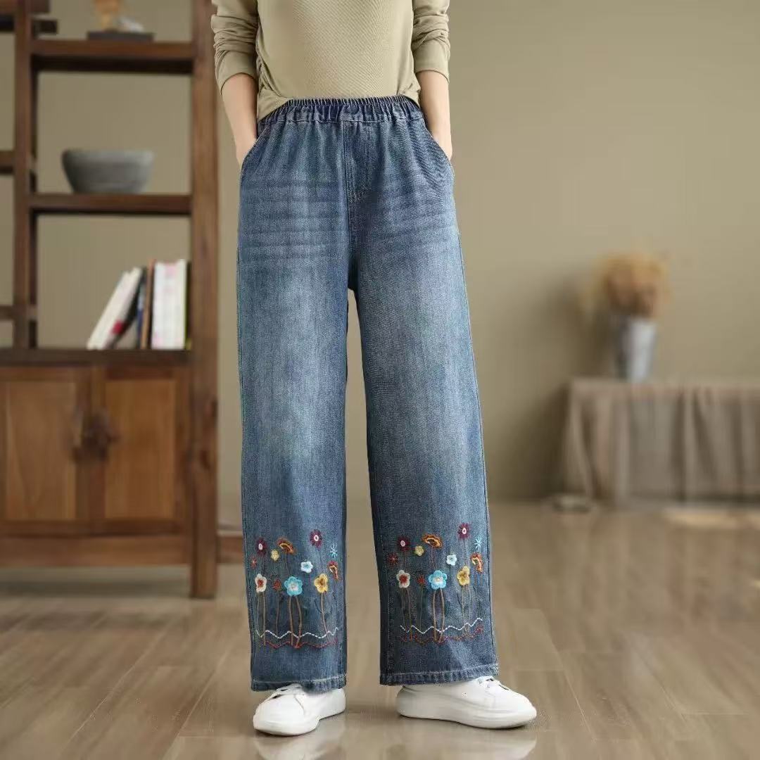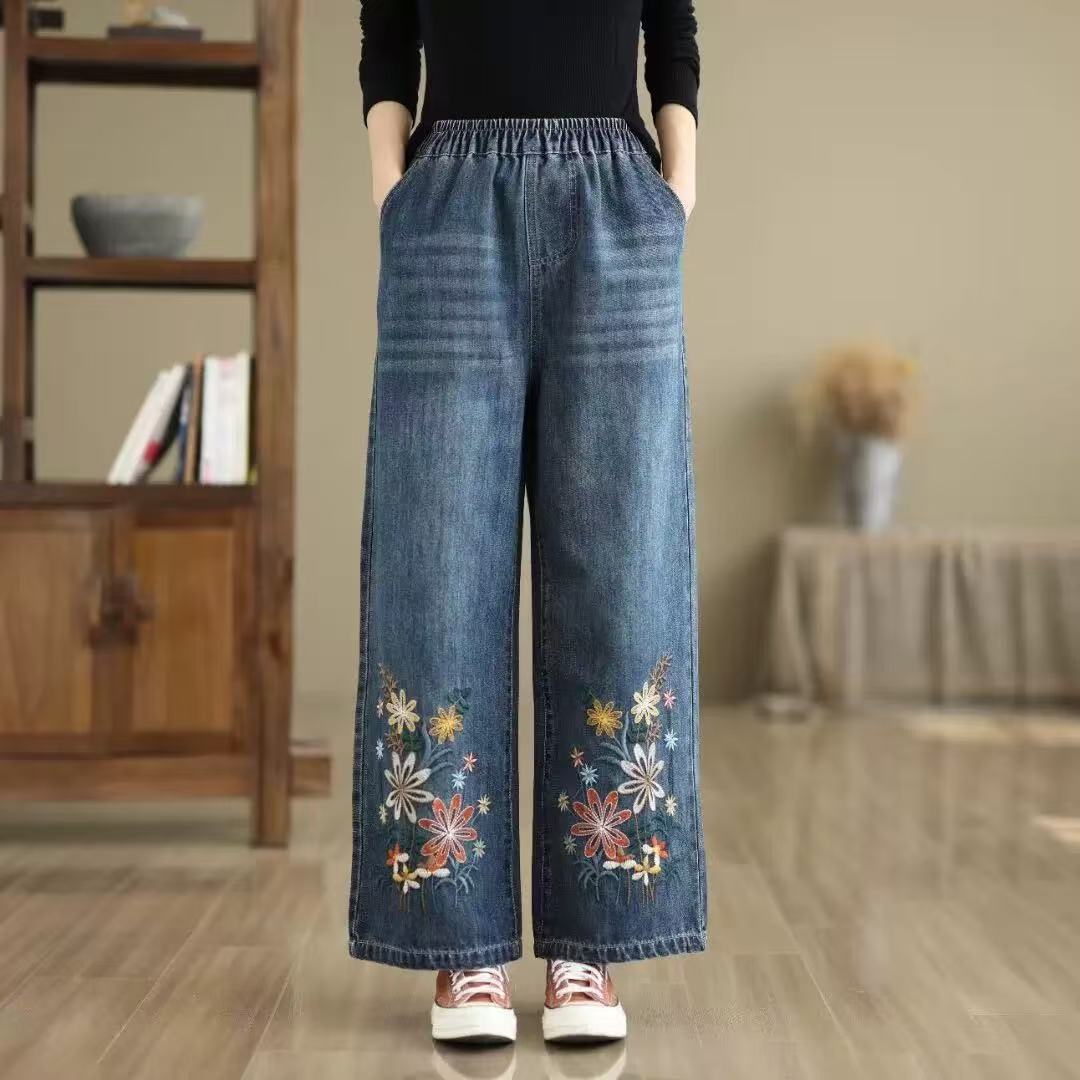 빈티지 자수 스트레이트 청바지 여성의 봄 새로운 도착 플러스 사이즈 캐주얼 대형 바지 넓은 다리 청바지스토어 가기