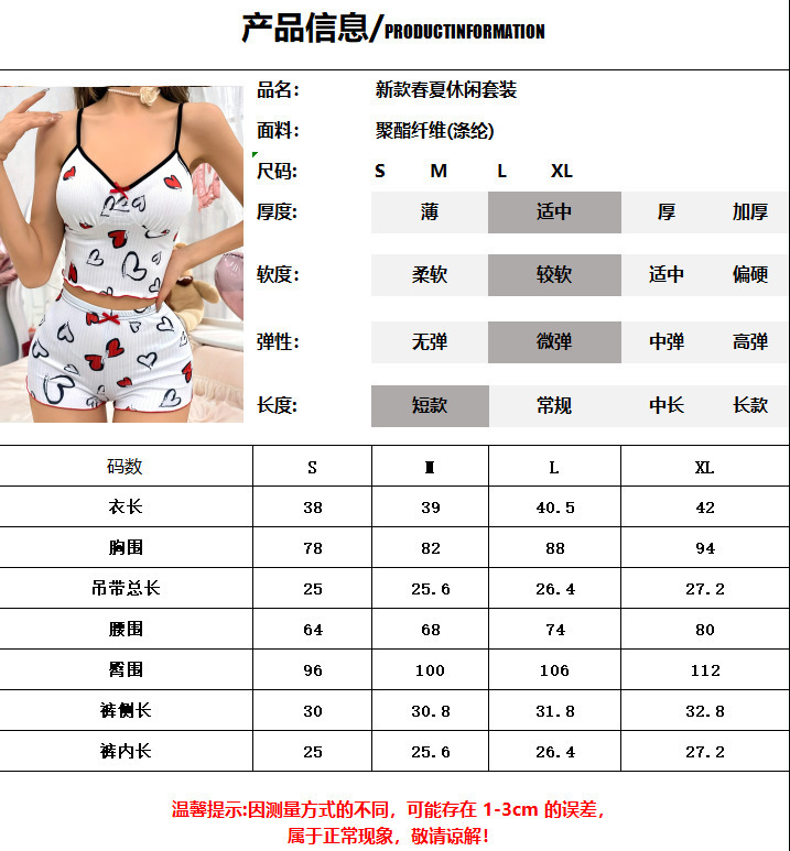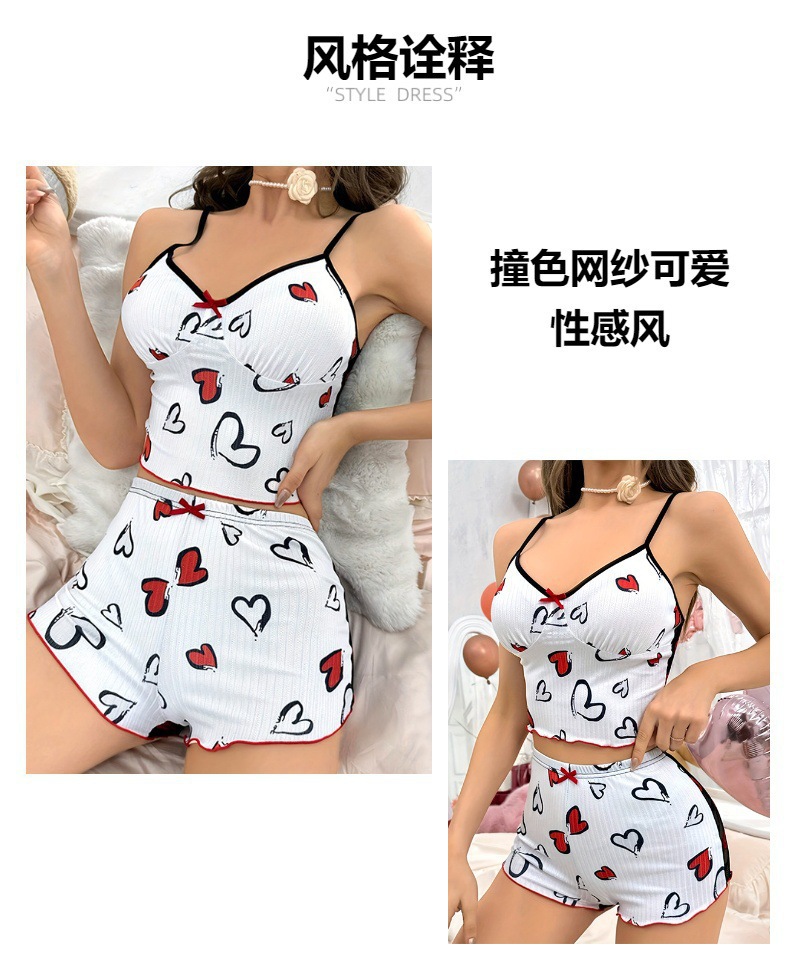 유럽과 미국의 대외 무역 여름 신제품 여성용 하트 모양의 인쇄 대비 색상 홈웨어 투피스 섹시한 서스펜더 잠옷 세트