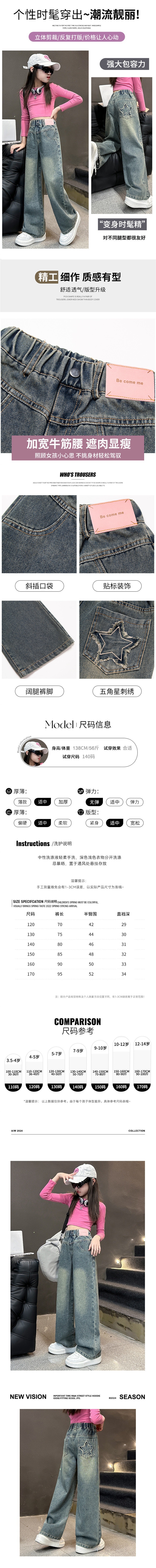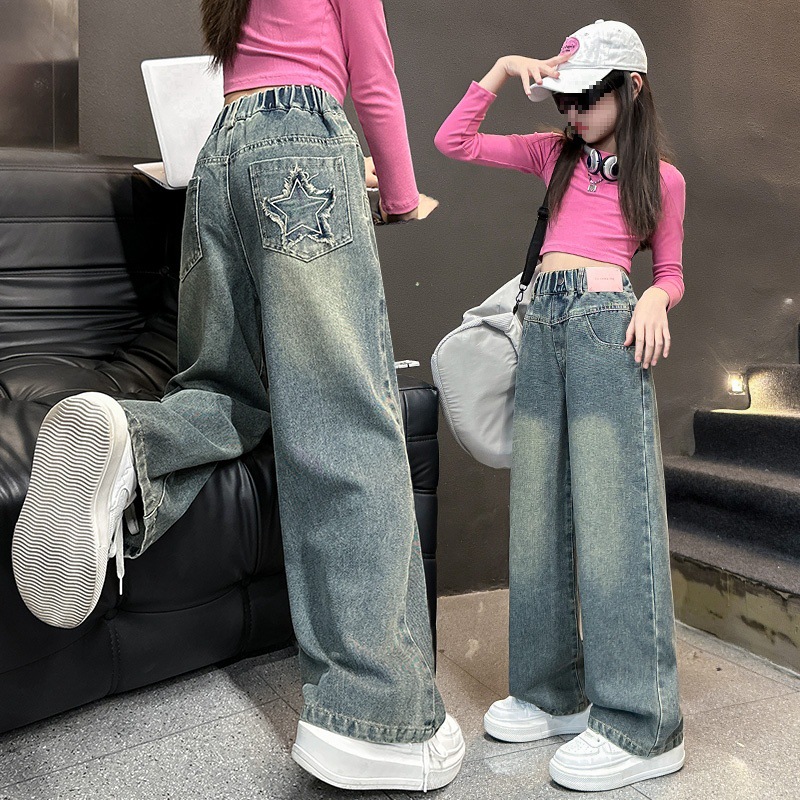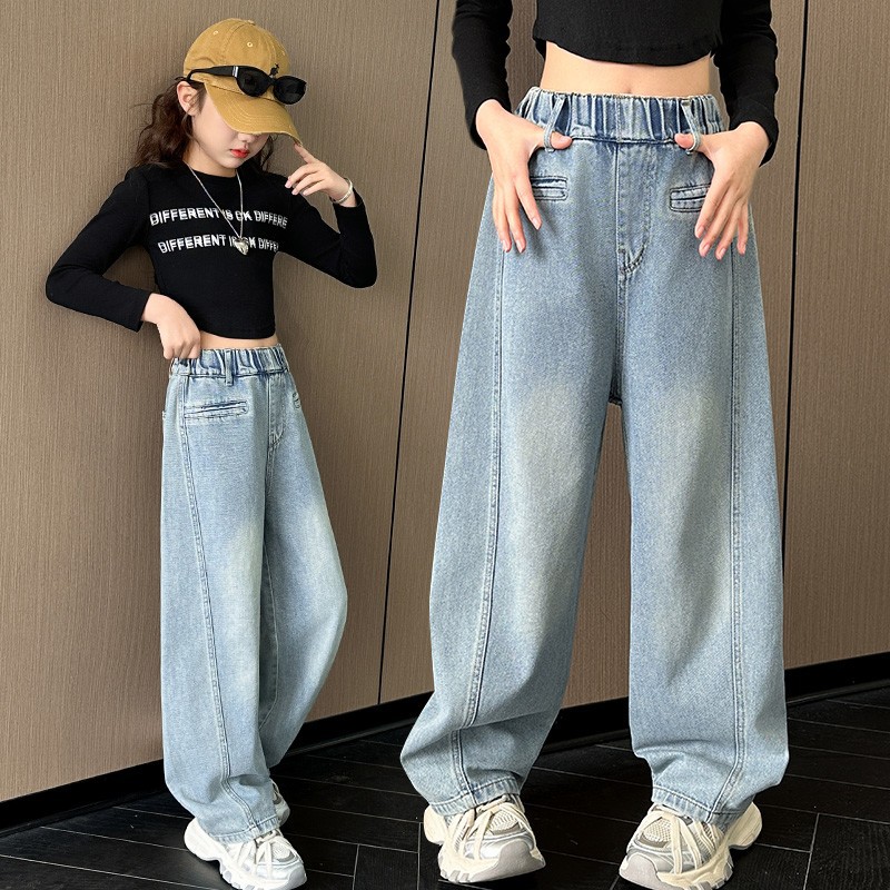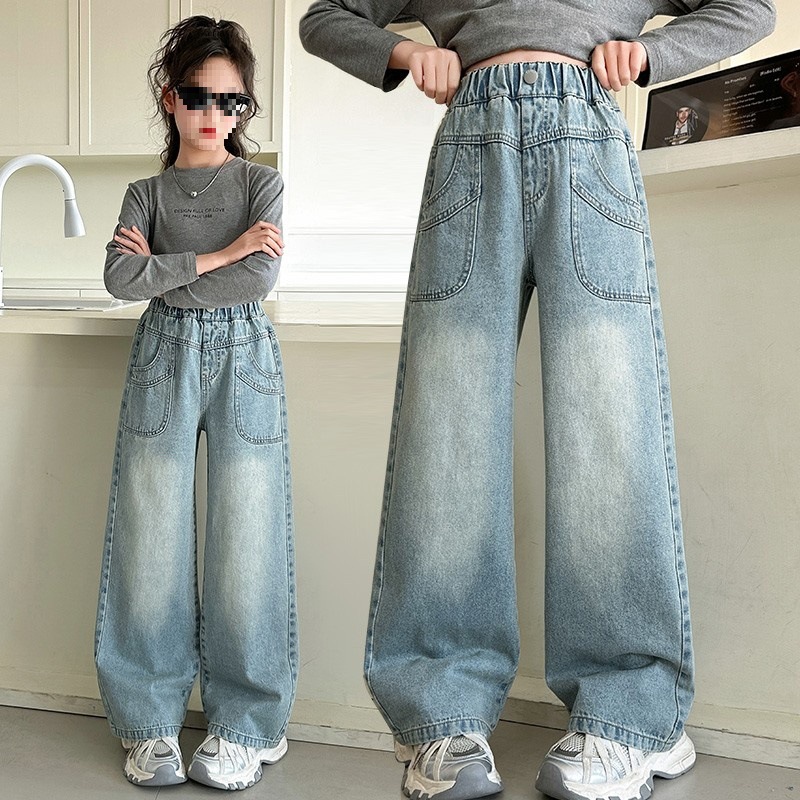 여아 바지, 봄, 가을 패셔너블하고 스타일리쉬한 봄 스타일, 큰 아동용 와이드 팬츠, 인터넷 연예인 스트리트 스타일 봄 루즈한 아동용 청바지스토어 가기