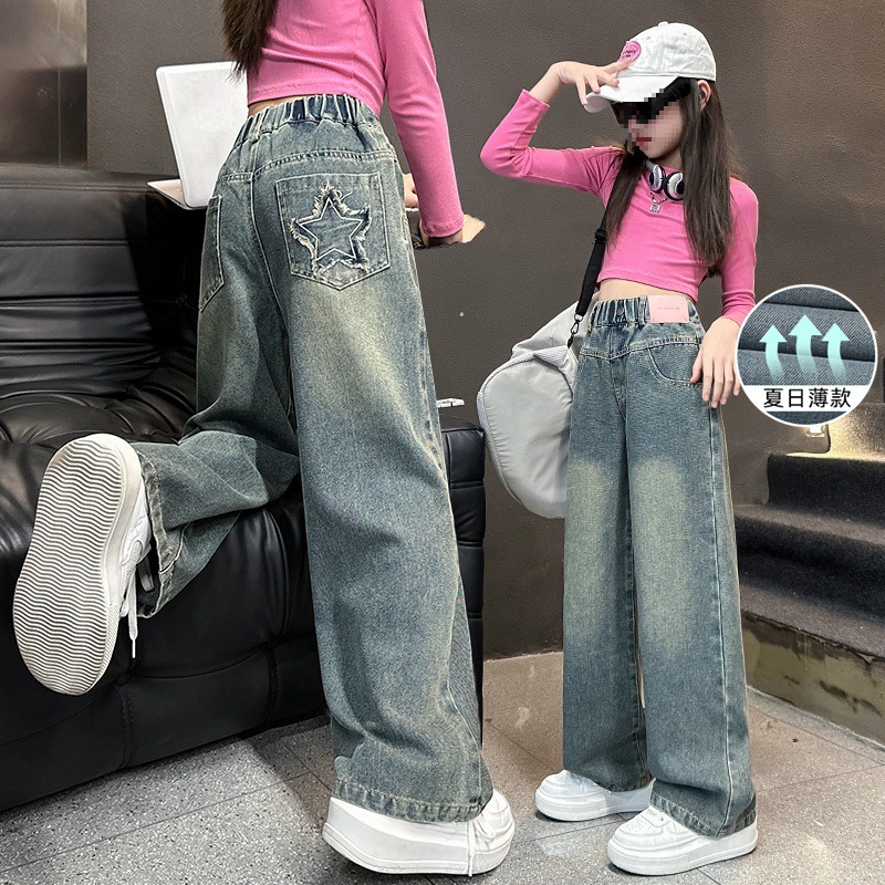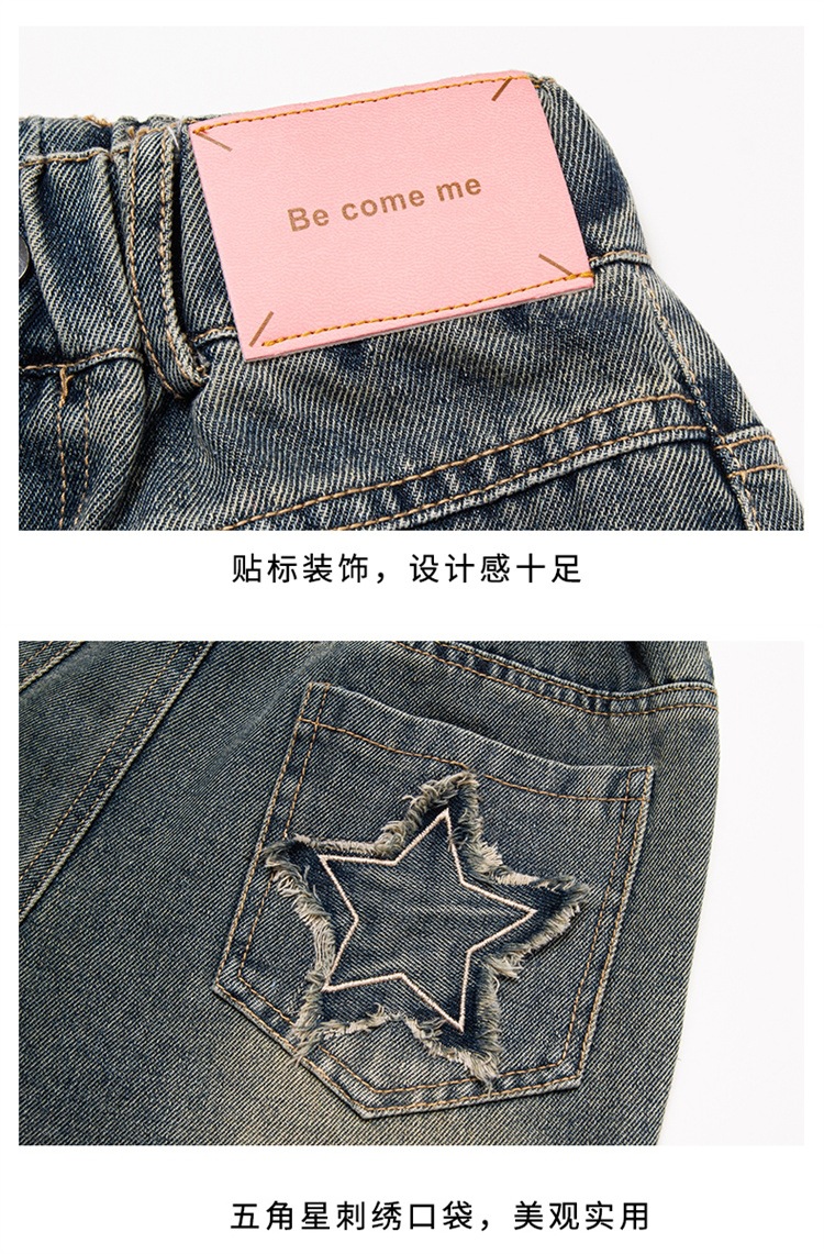 여아 바지, 봄, 가을 패셔너블하고 스타일리쉬한 봄 스타일, 큰 아동용 와이드 팬츠, 인터넷 연예인 스트리트 스타일 봄 루즈한 아동용 청바지