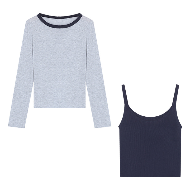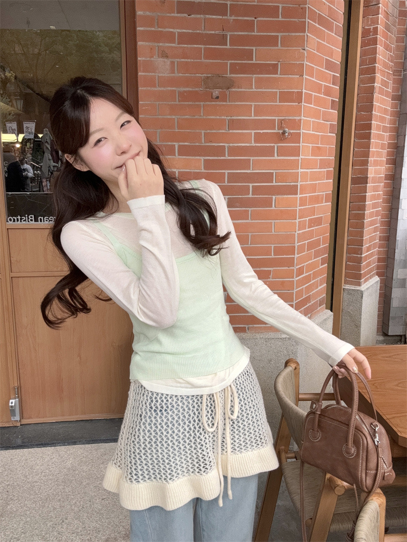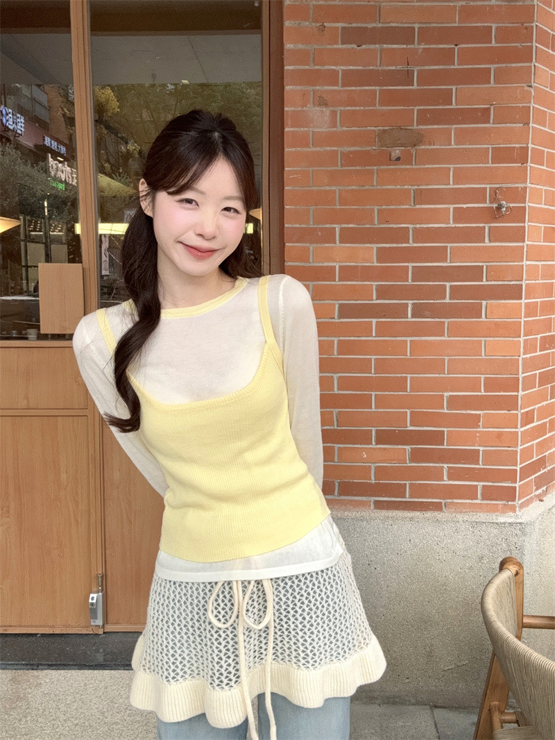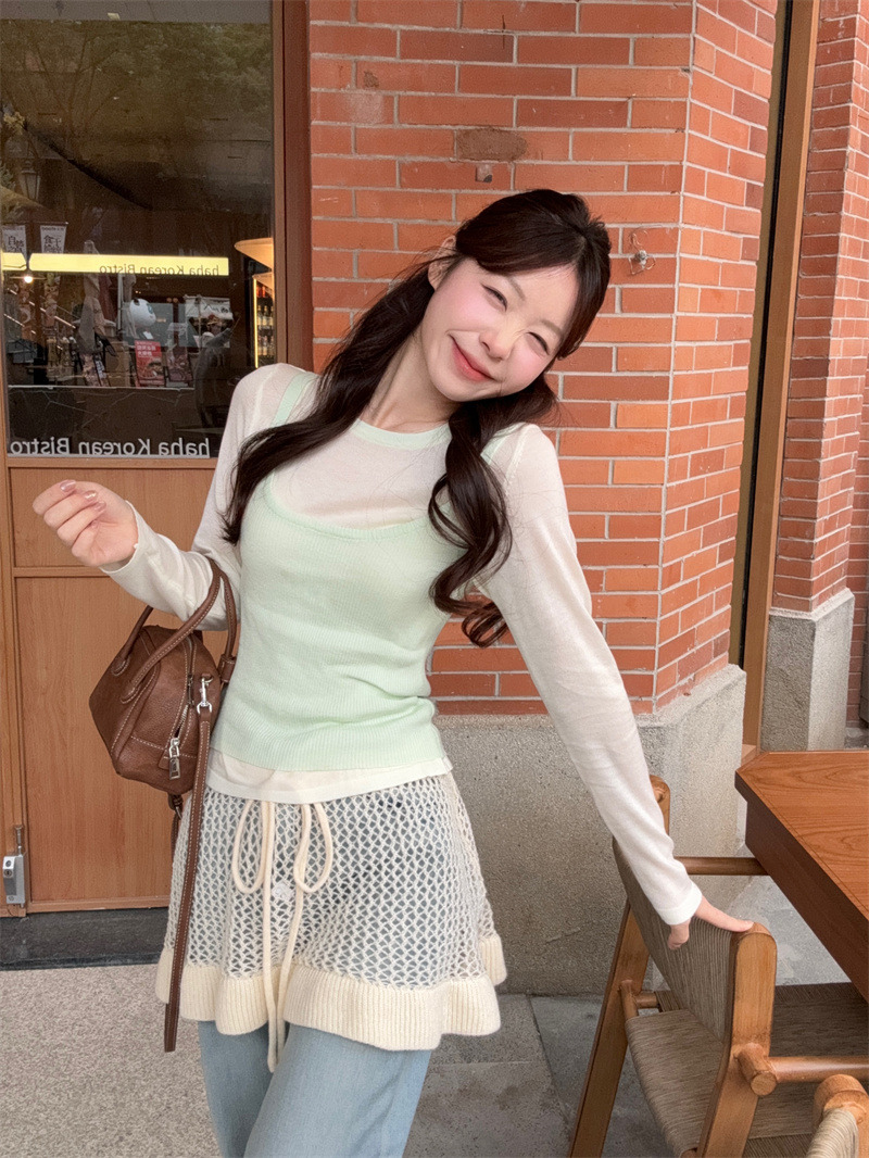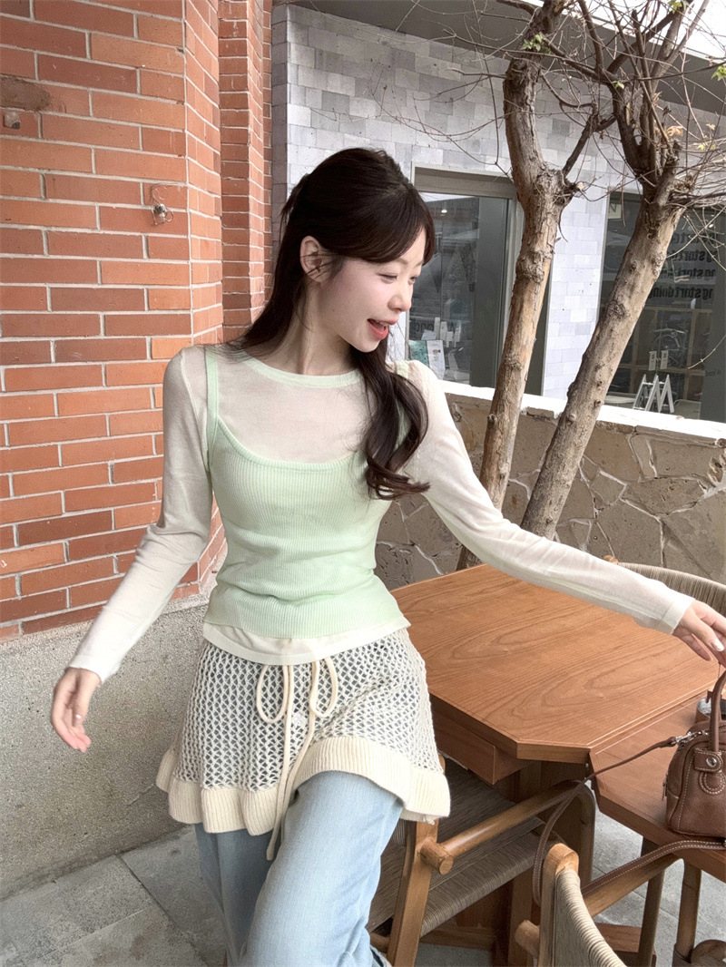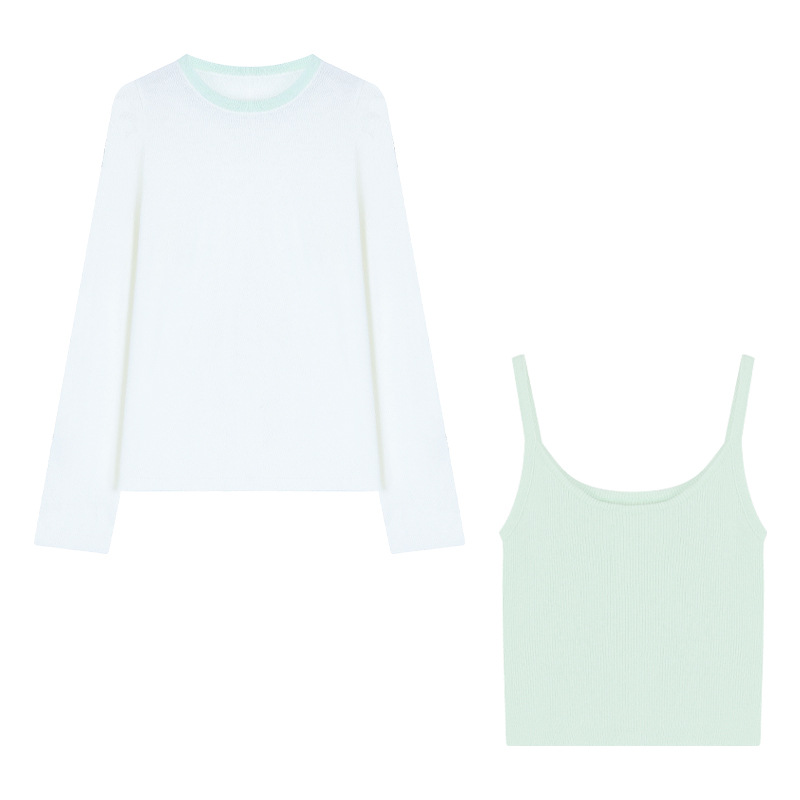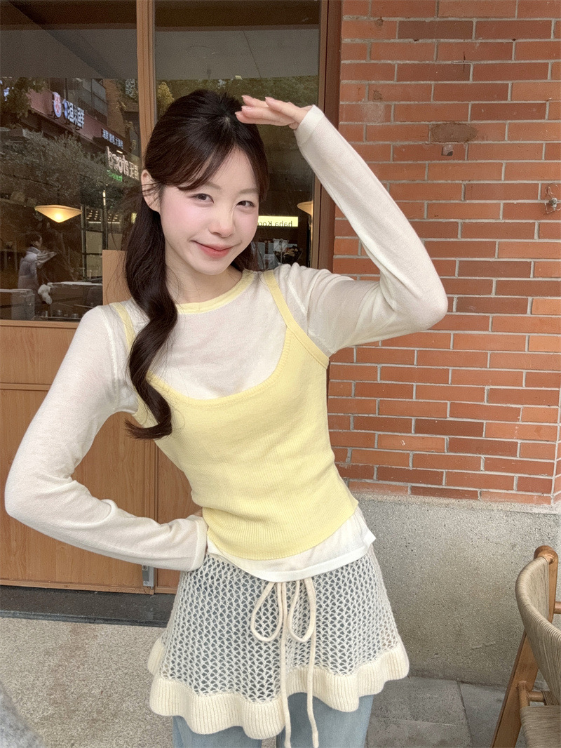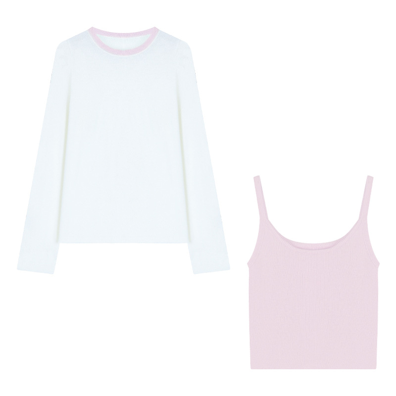 스위트 스타일 슈트 캐미솔 레이어드 라운드 넥 얇은 긴팔 티셔츠 자외선 차단 블라우스 여성 봄 투피스 세트