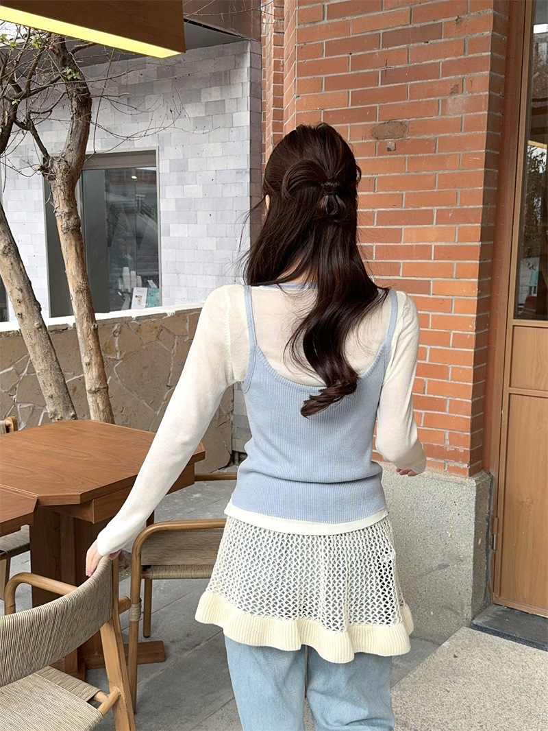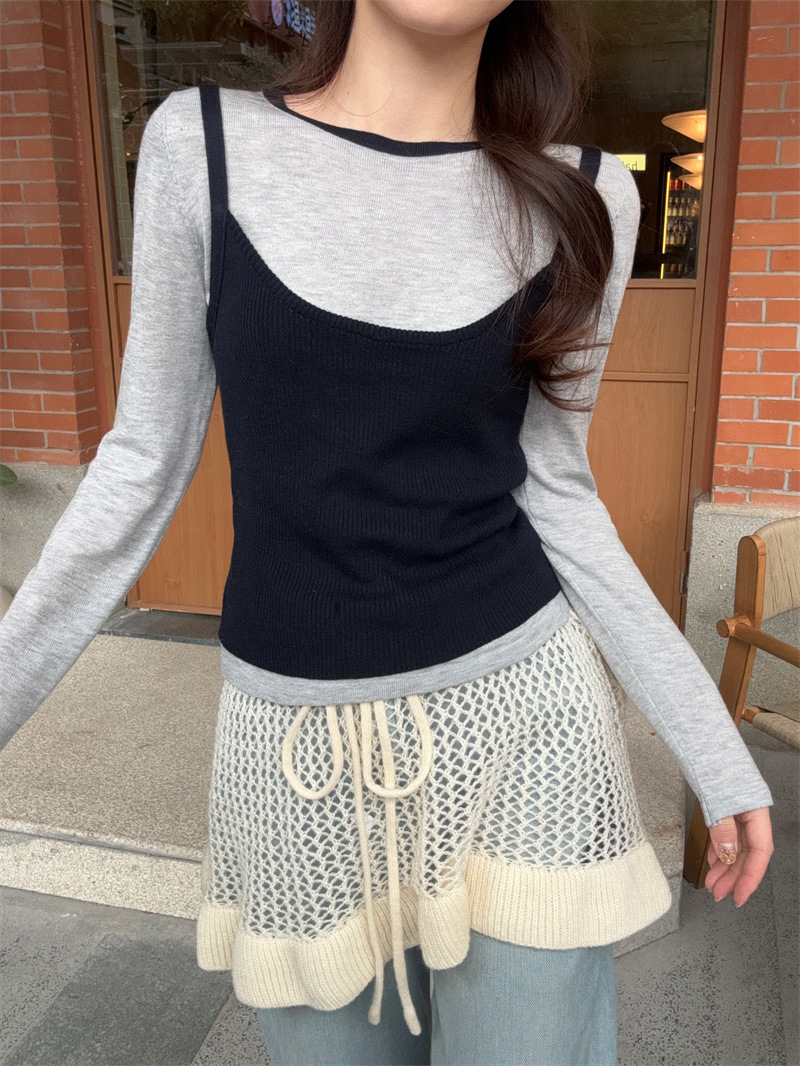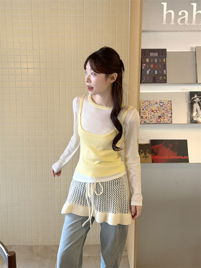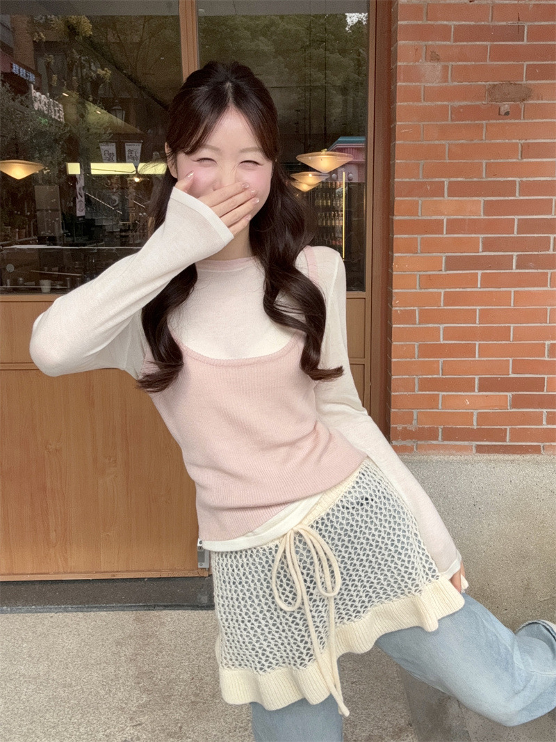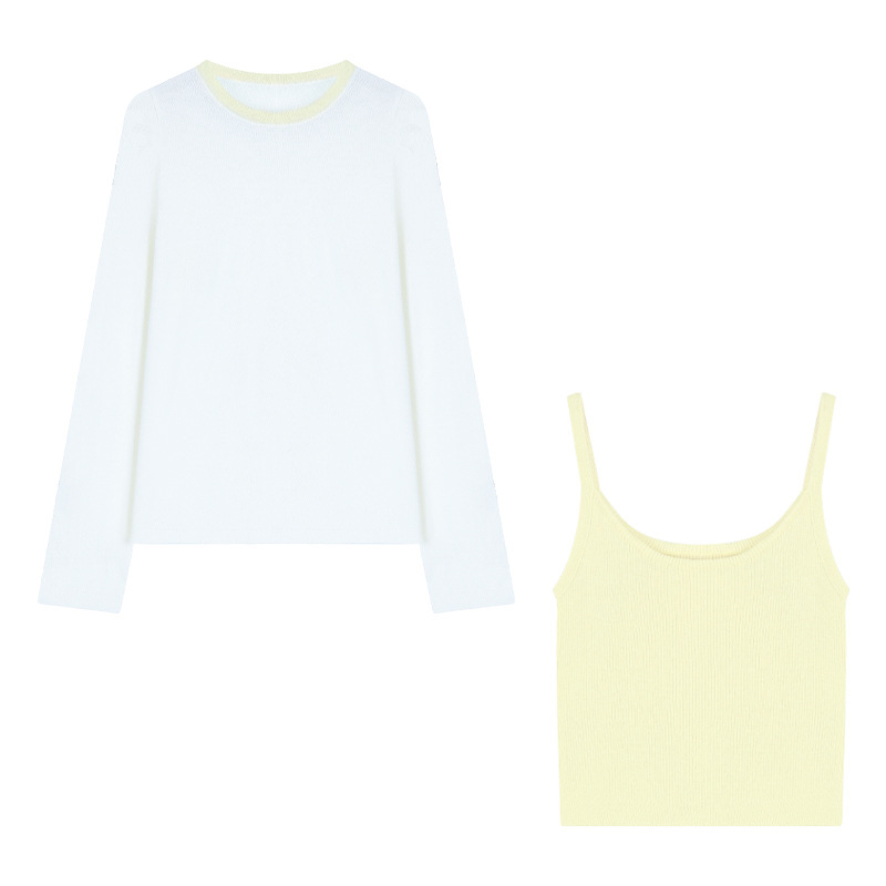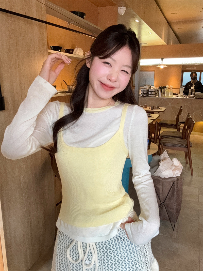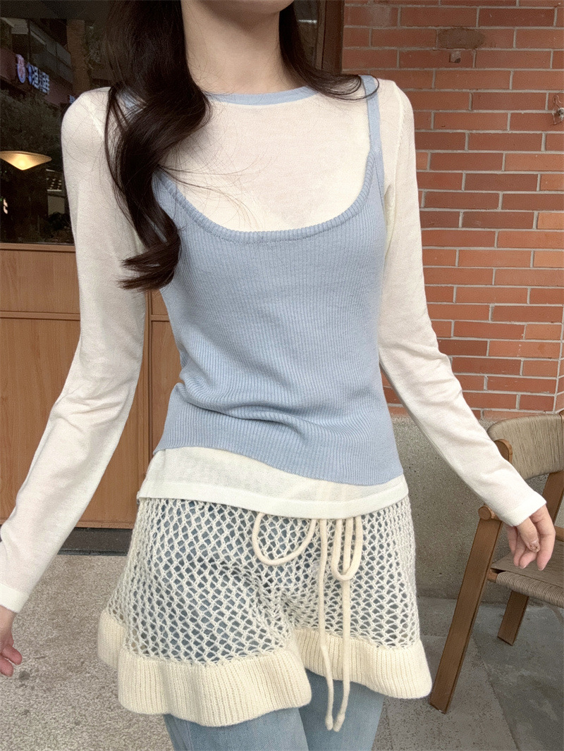 스위트 스타일 슈트 캐미솔 레이어드 라운드 넥 얇은 긴팔 티셔츠 자외선 차단 블라우스 여성 봄 투피스 세트