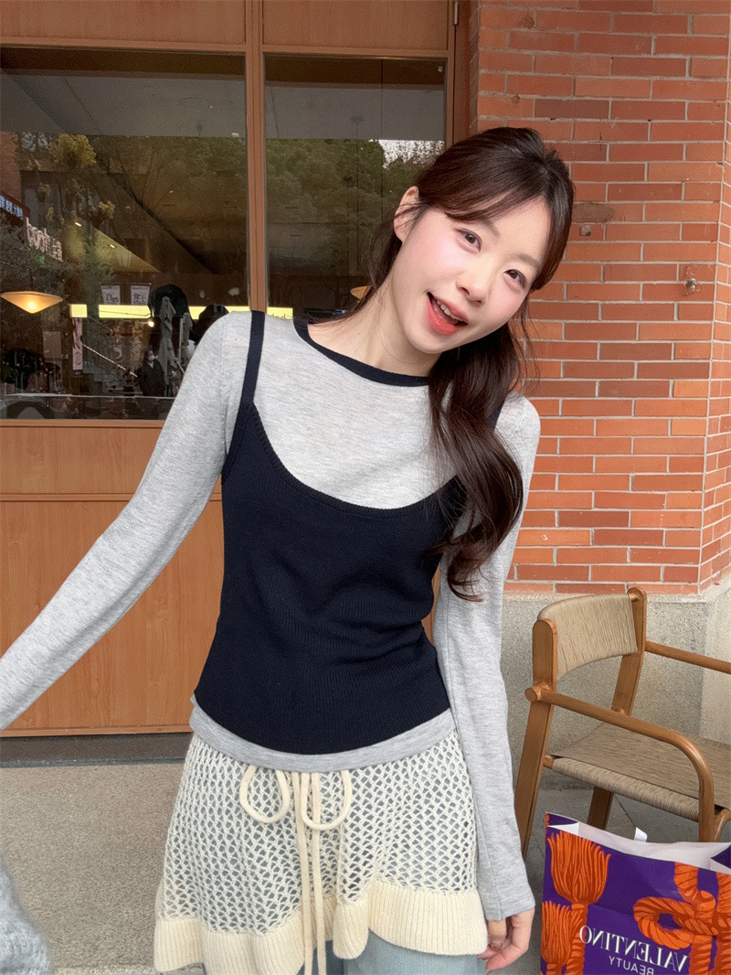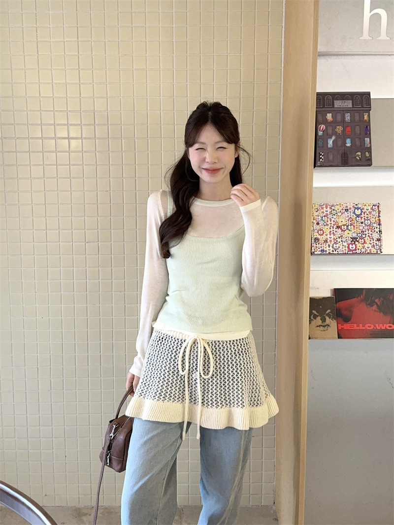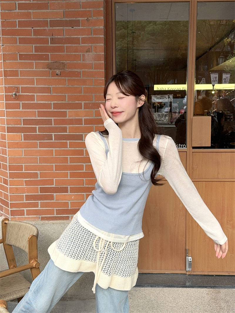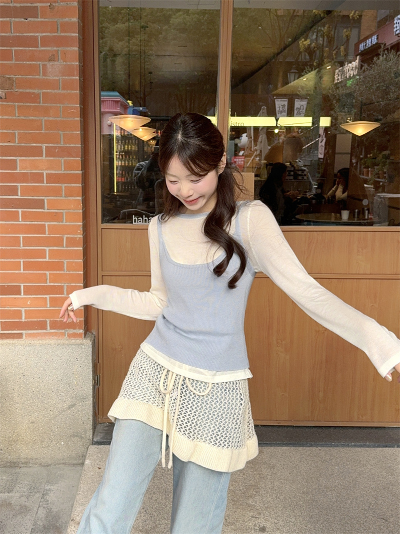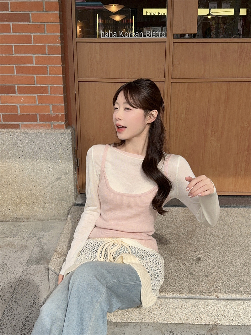 스위트 스타일 슈트 캐미솔 레이어드 라운드 넥 얇은 긴팔 티셔츠 자외선 차단 블라우스 여성 봄 투피스 세트스토어 가기