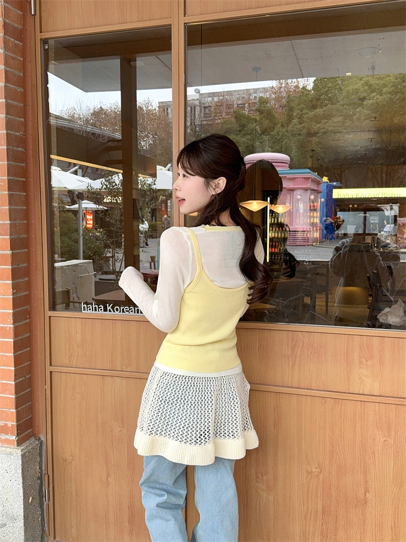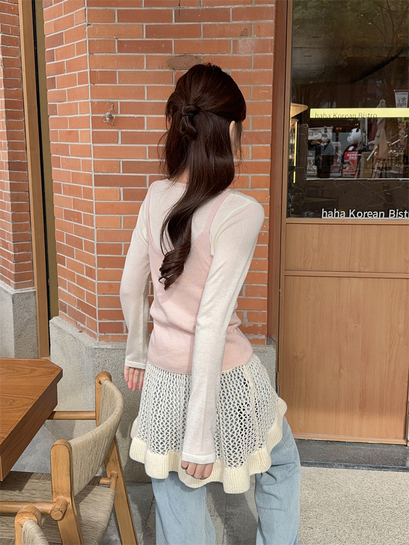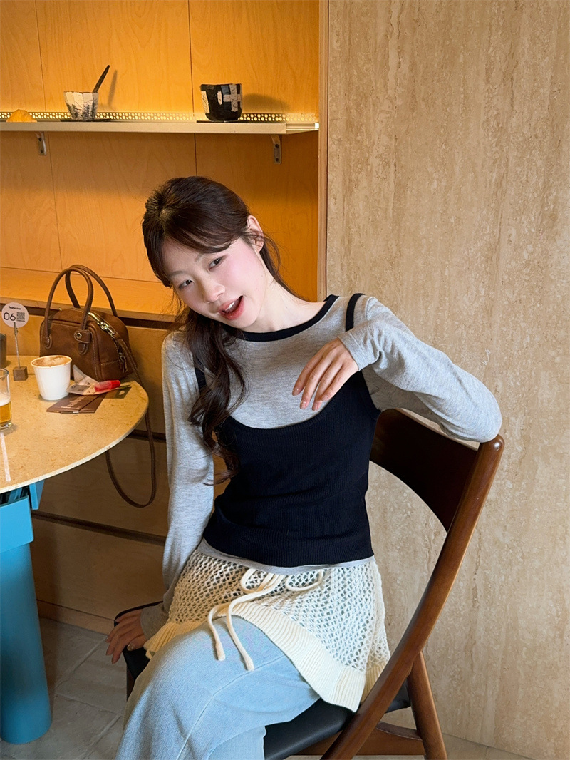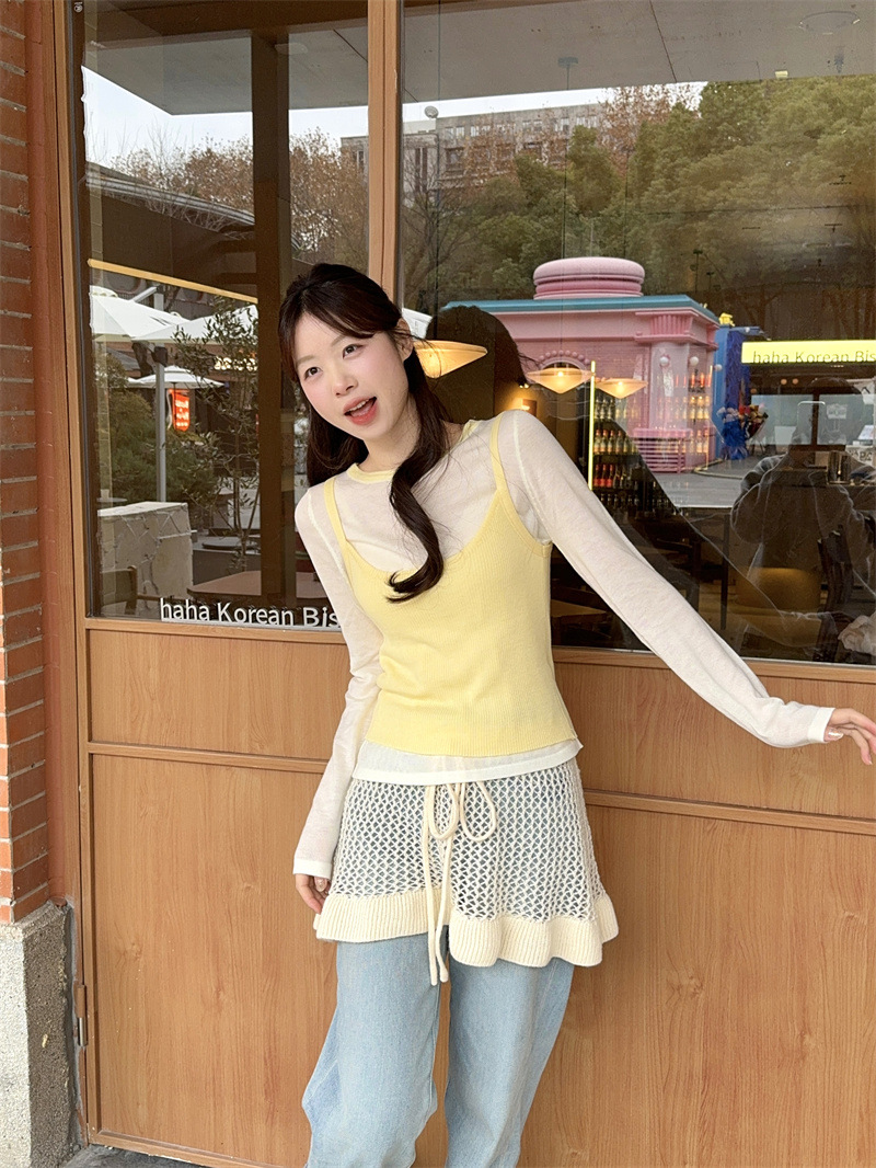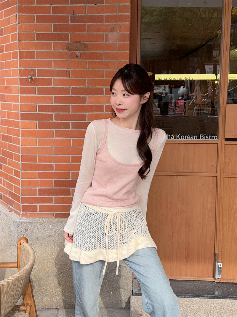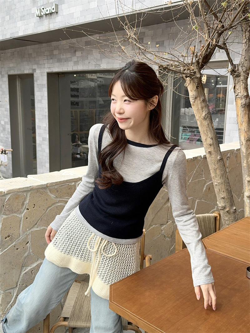 스위트 스타일 슈트 캐미솔 레이어드 라운드 넥 얇은 긴팔 티셔츠 자외선 차단 블라우스 여성 봄 투피스 세트스토어 가기