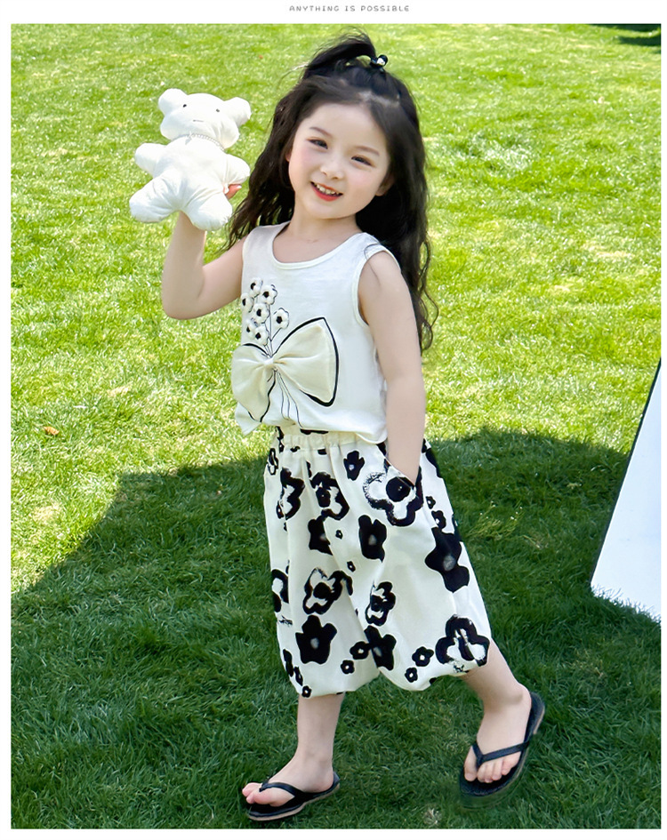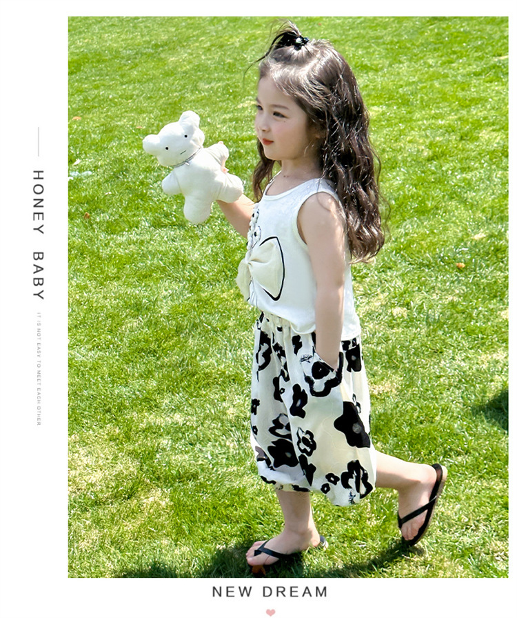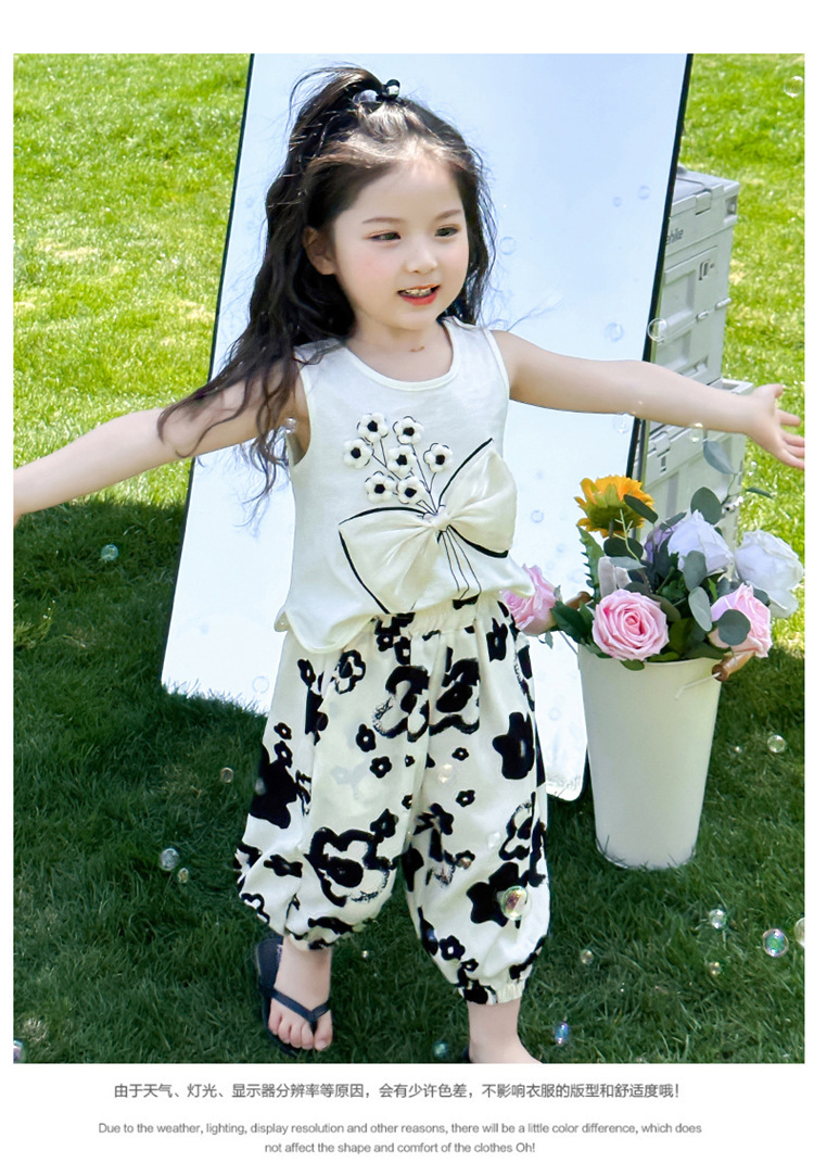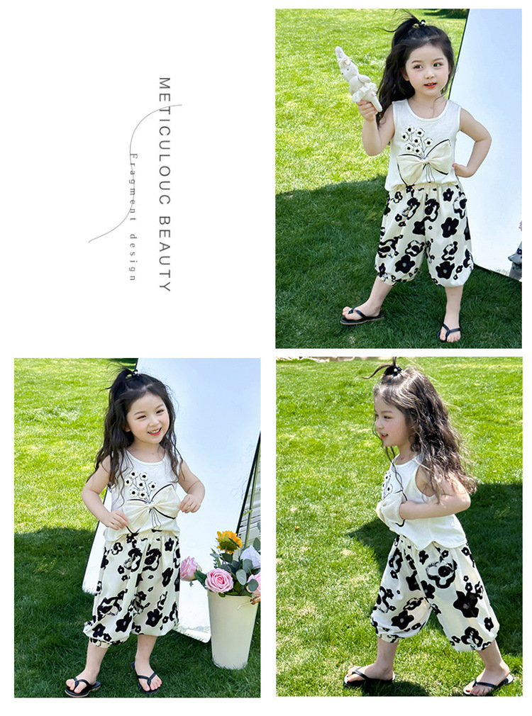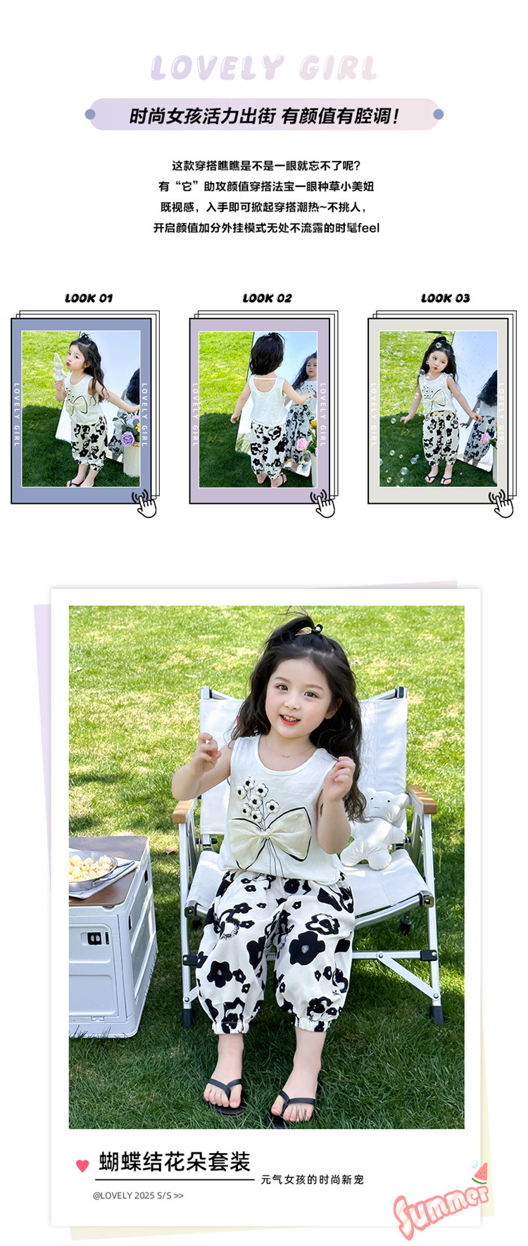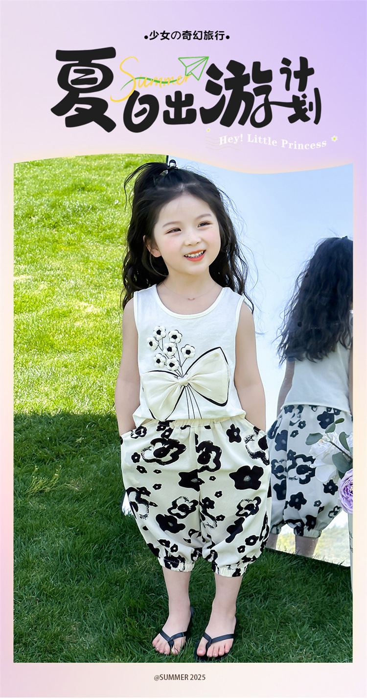 소녀의 활 꽃 세트 2025 여름 새로운 패션 소녀의 세련된 투피스 세트 어린이 여름 원피스스토어 가기