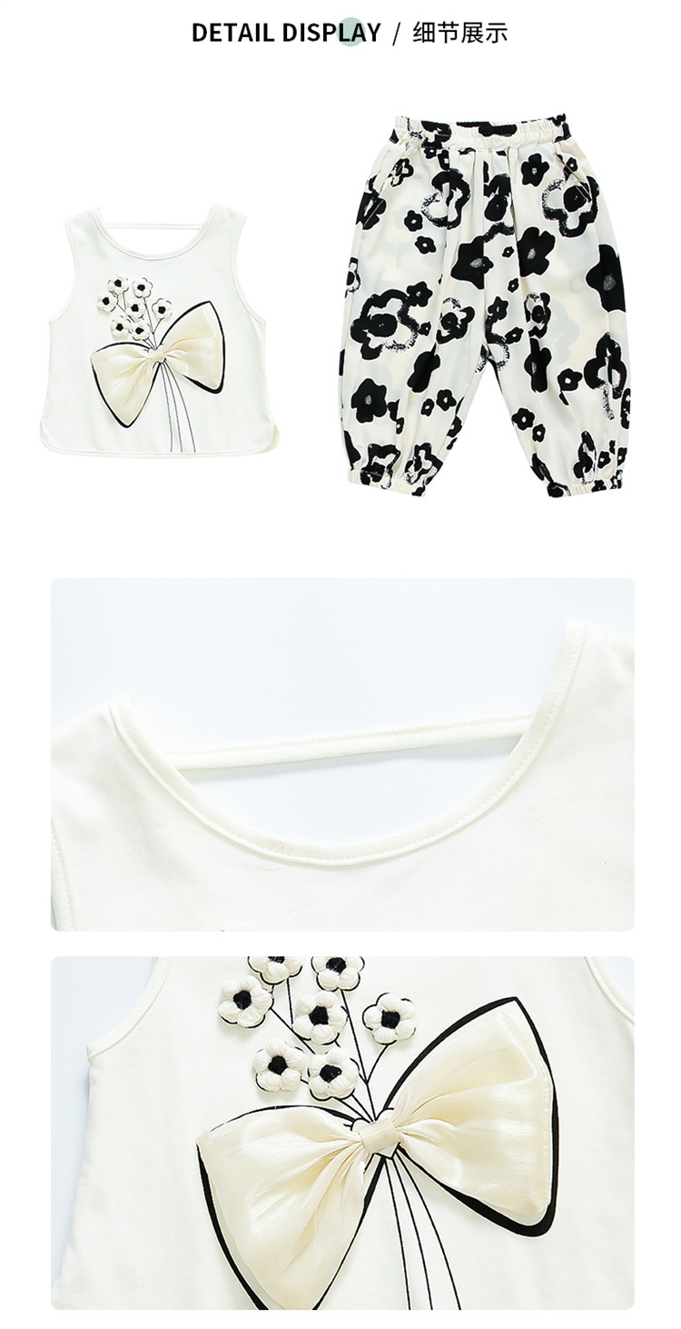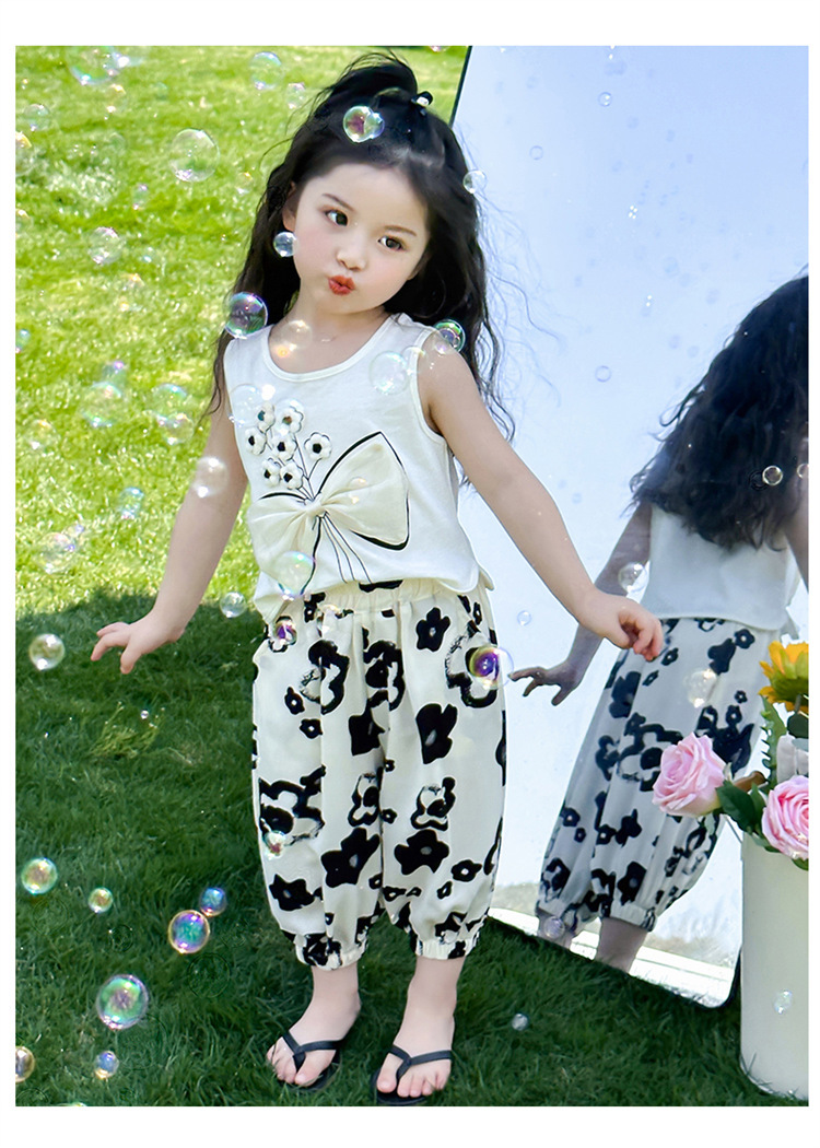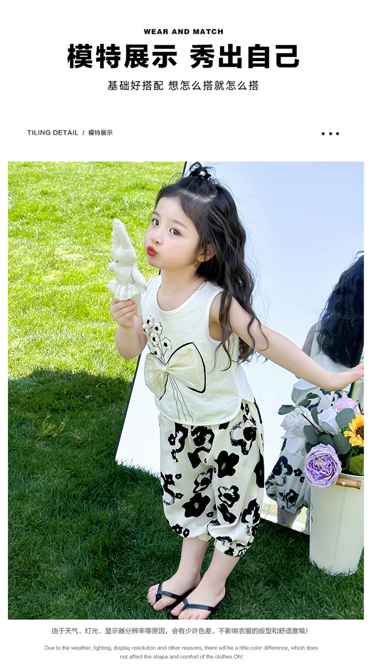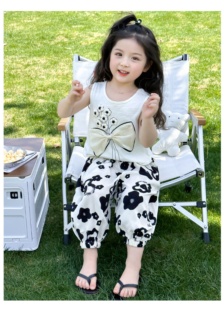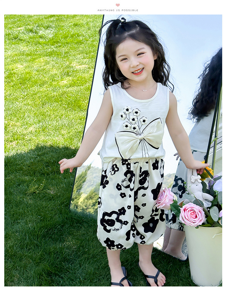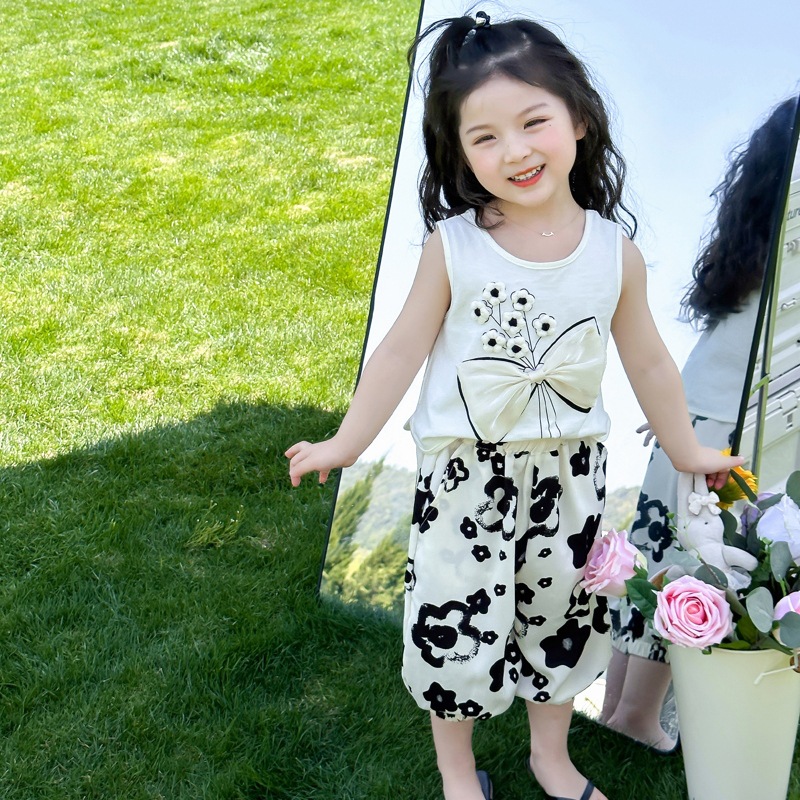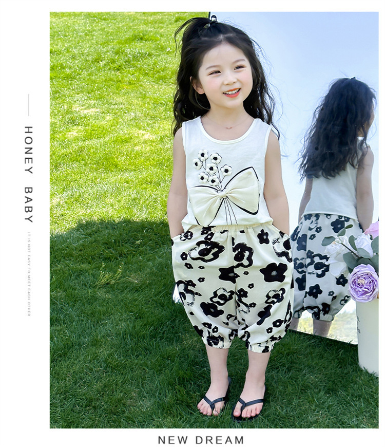 소녀의 활 꽃 세트 2025 여름 새로운 패션 소녀의 세련된 투피스 세트 어린이 여름 원피스스토어 가기