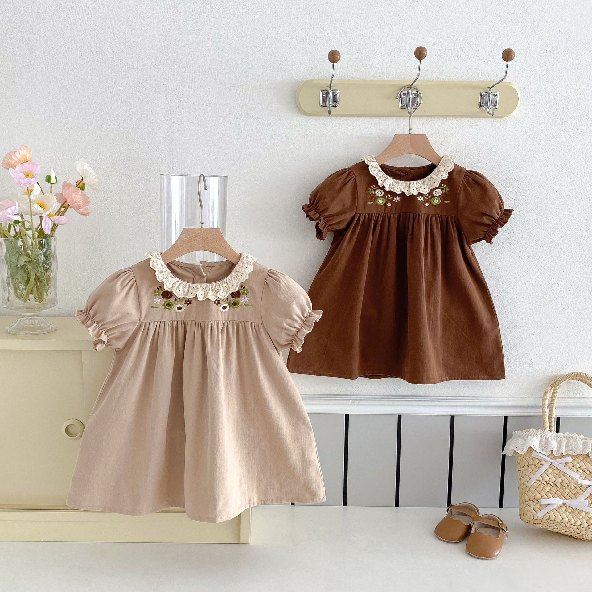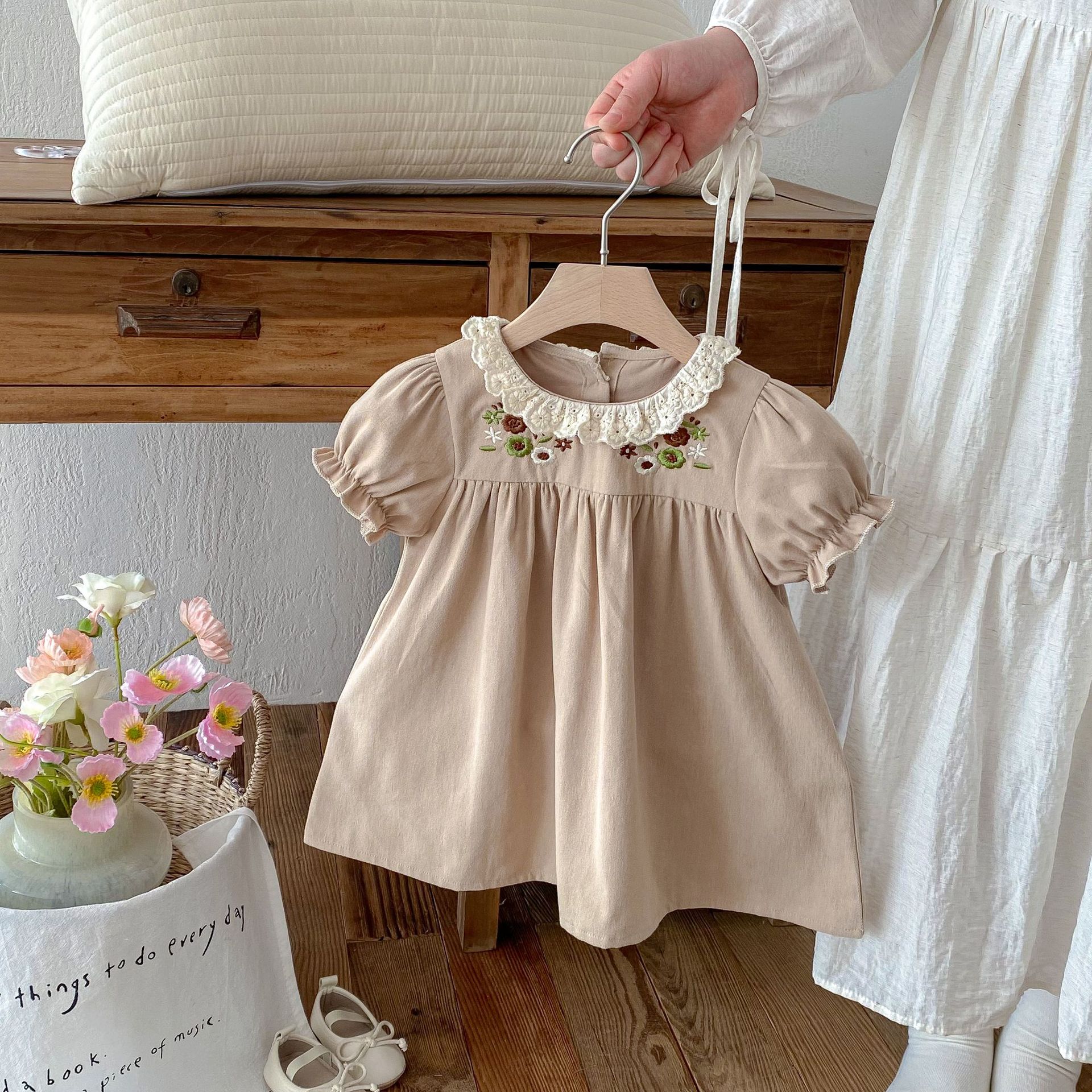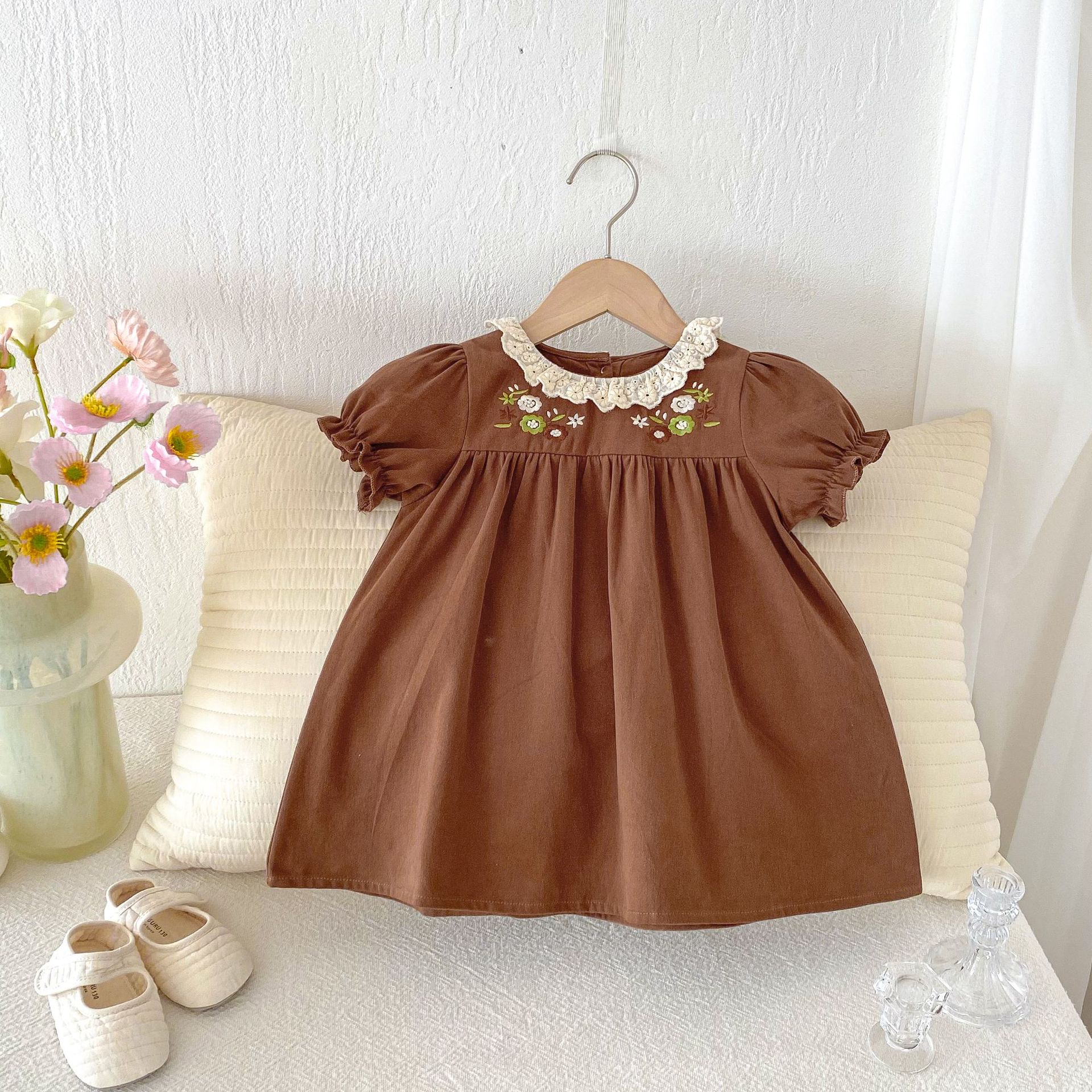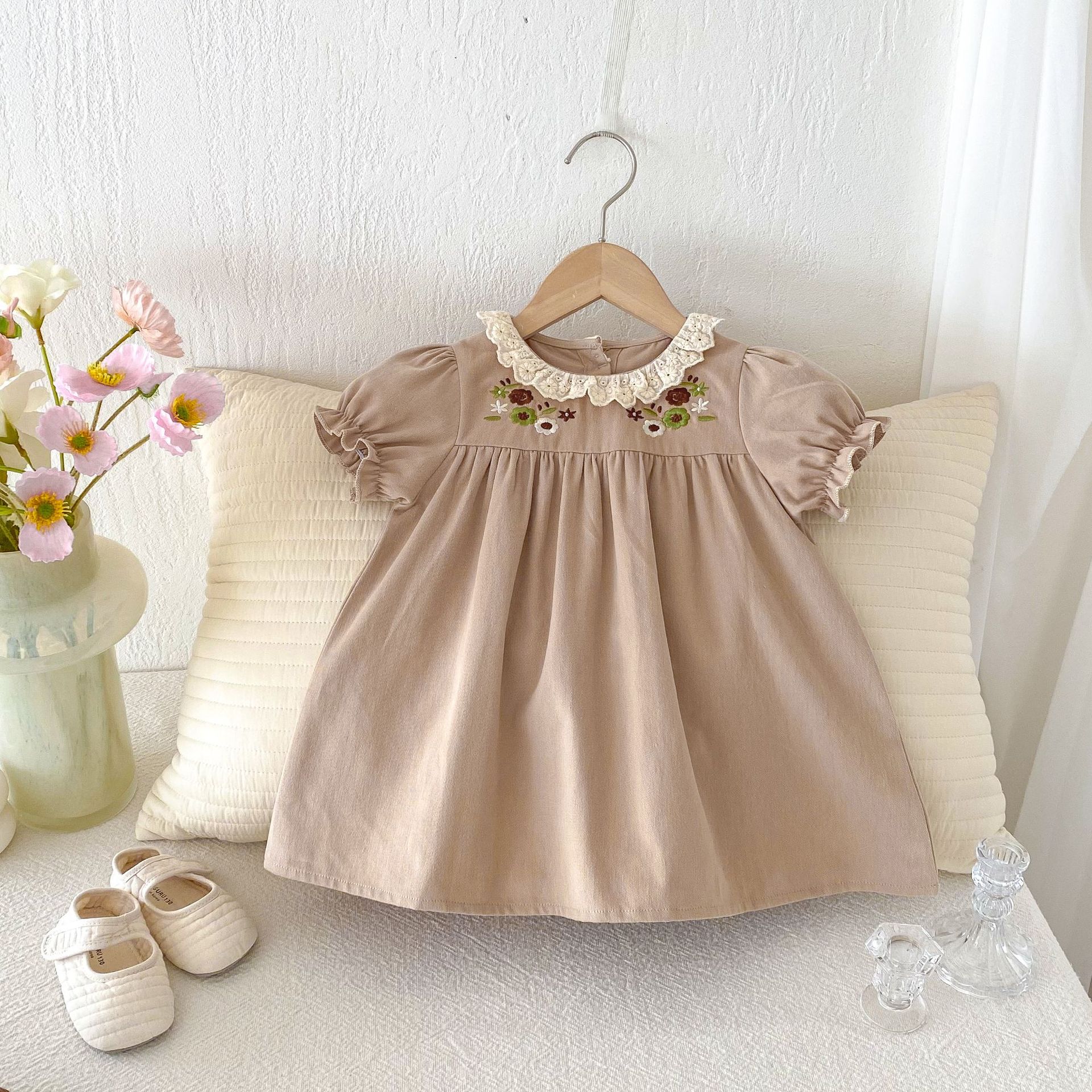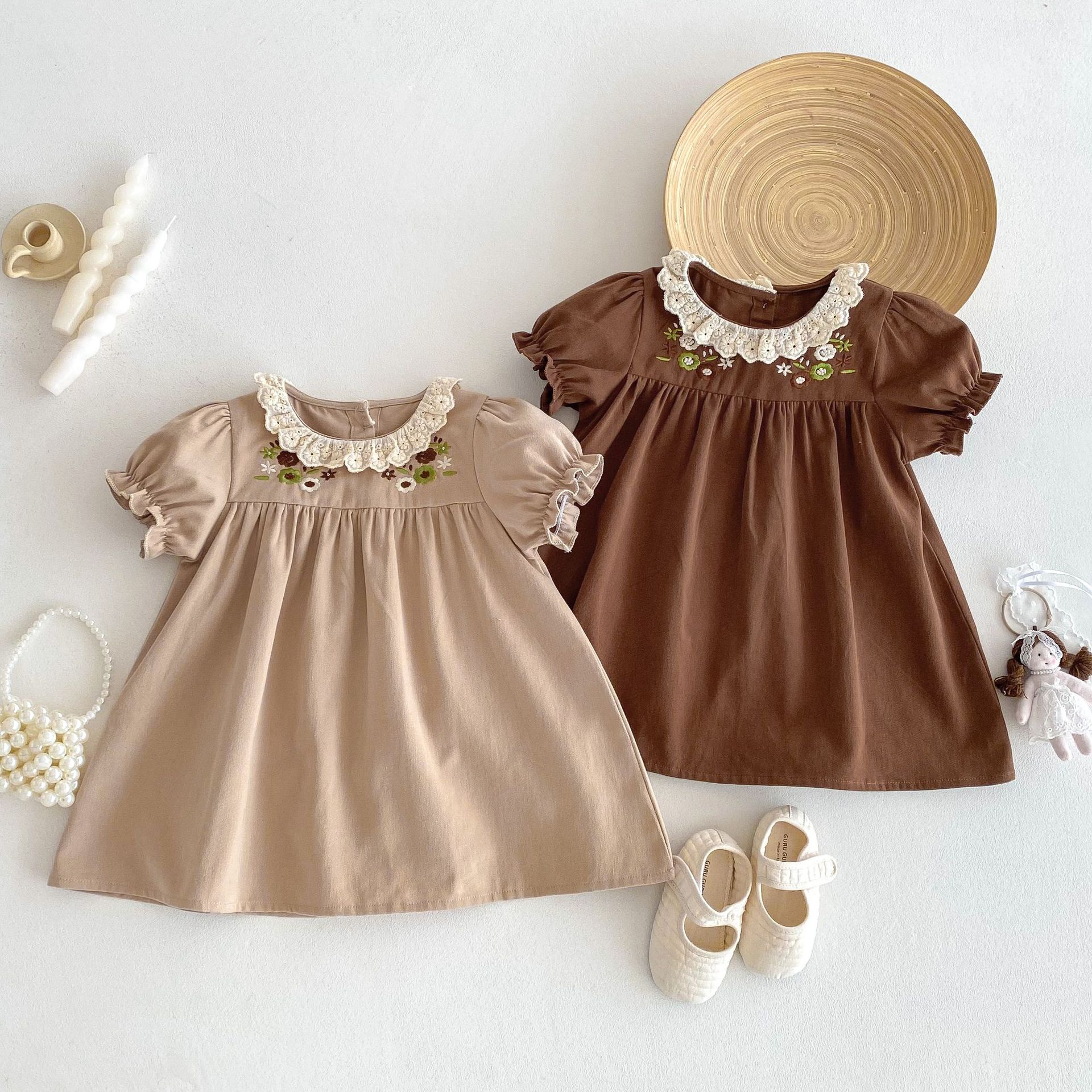 여자 여름 원피스 새 원피스 한국 스타일 어린이 레이스 칼라 외출을 위해 원피스 어린 소녀의 반팔 공주 자수스토어 가기