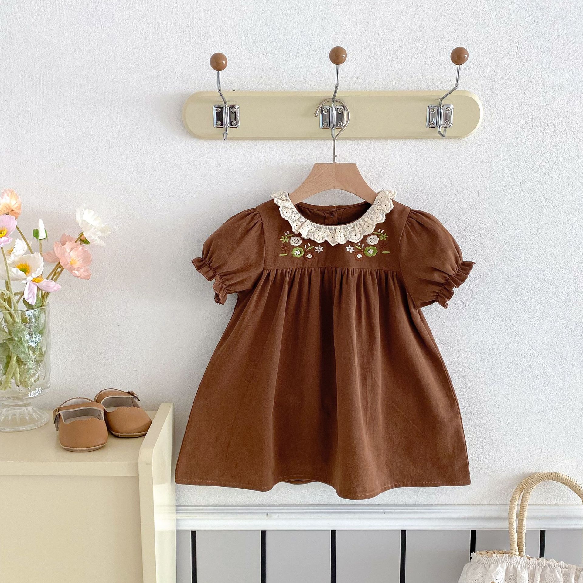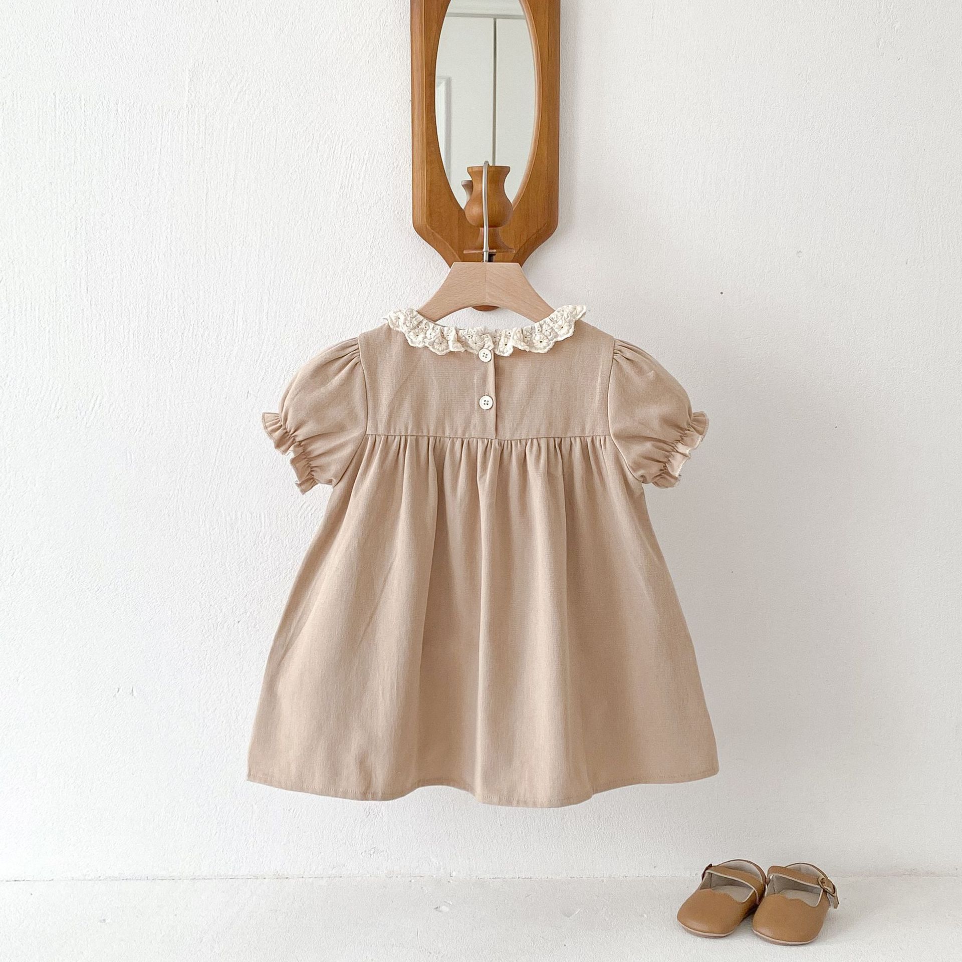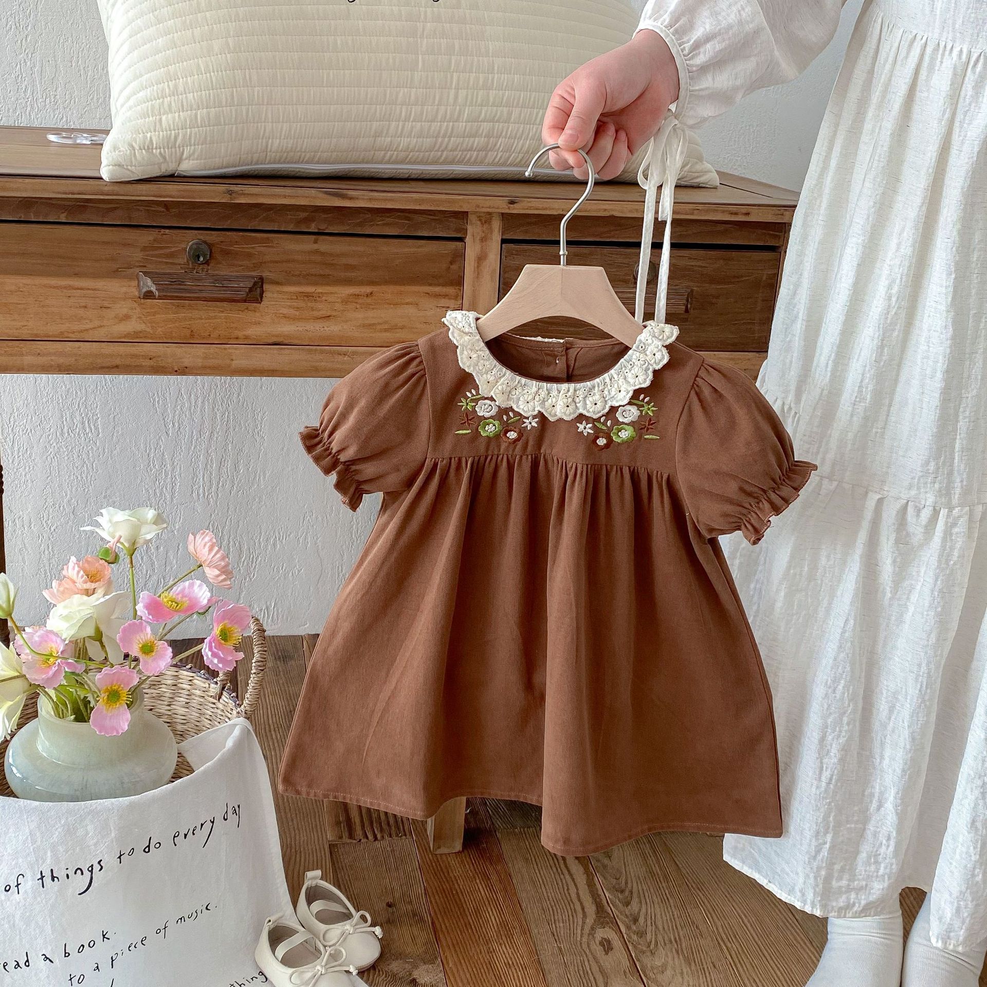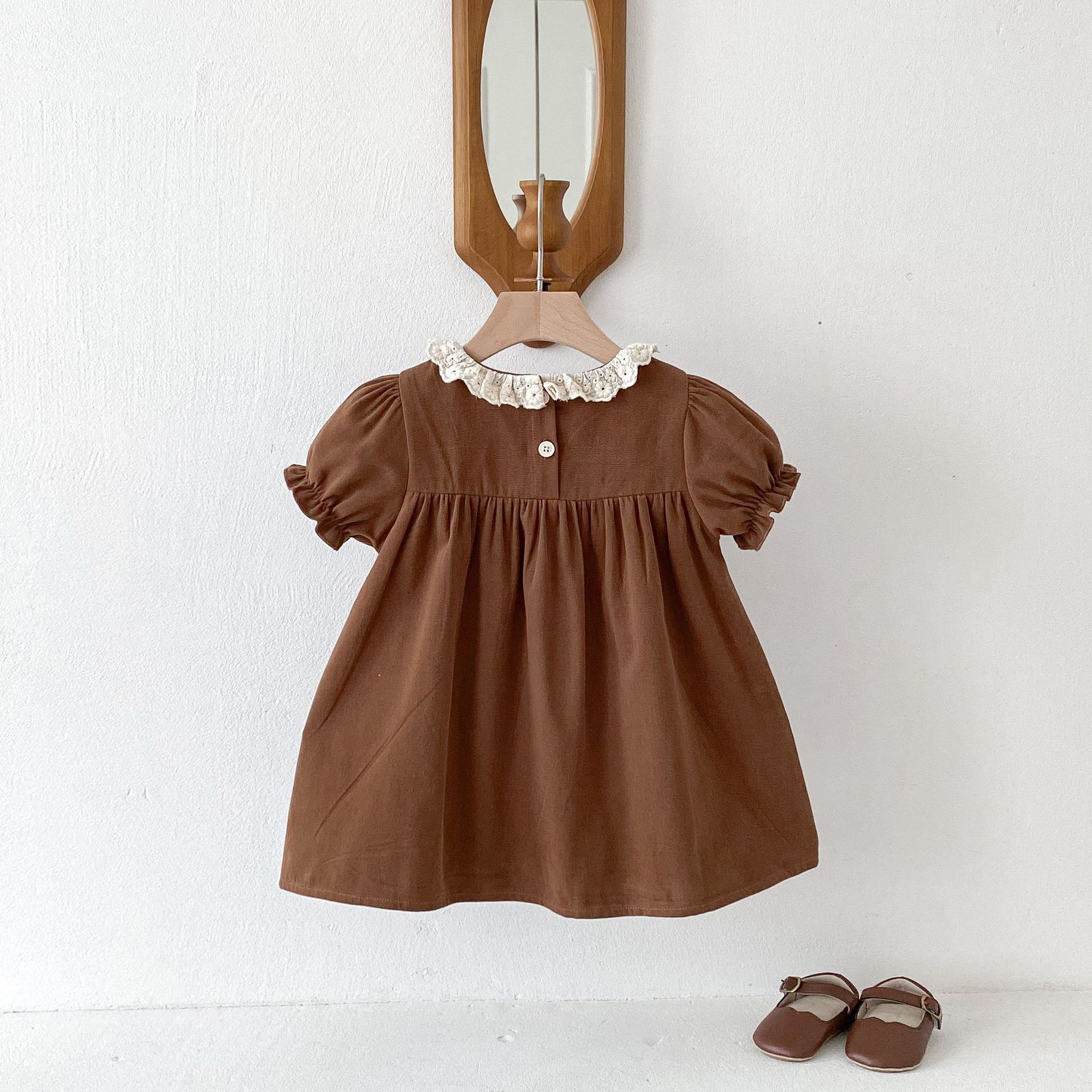여자 여름 원피스 새 원피스 한국 스타일 어린이 레이스 칼라 외출을 위해 원피스 어린 소녀의 반팔 공주 자수스토어 가기