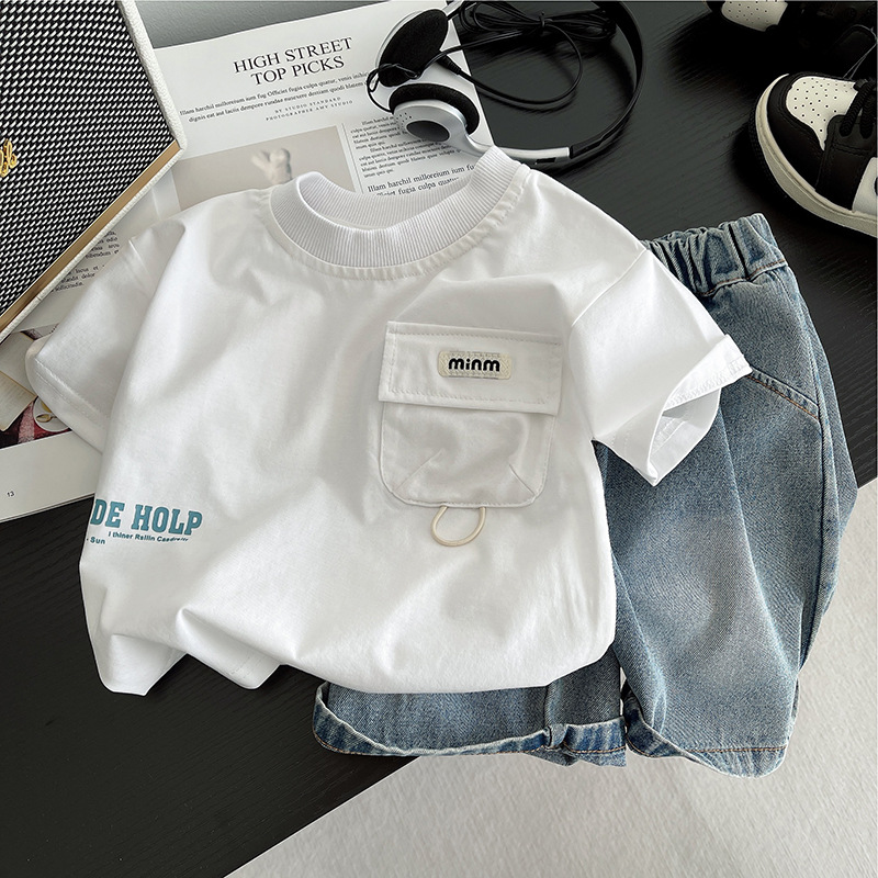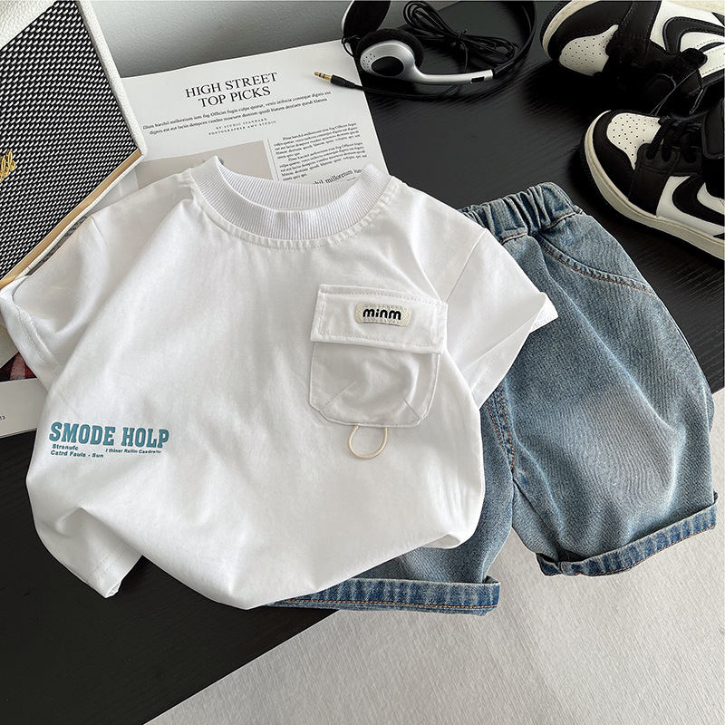 소년 여름 데님 반바지 2025 여름 느슨한 버전 젊은 소년을위한 얇은 유행 반팔 티셔츠 투피스 세트