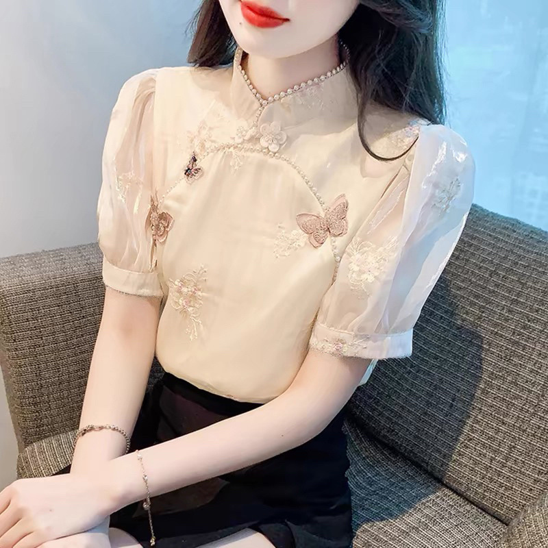 여성용 쉬폰 셔츠 여름 반팔 2025 새로운 디자인 틈새 프랑스 짧은 새로운 중국 스타일 버튼 탑스토어 가기