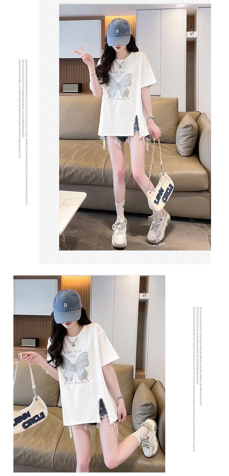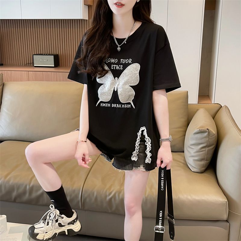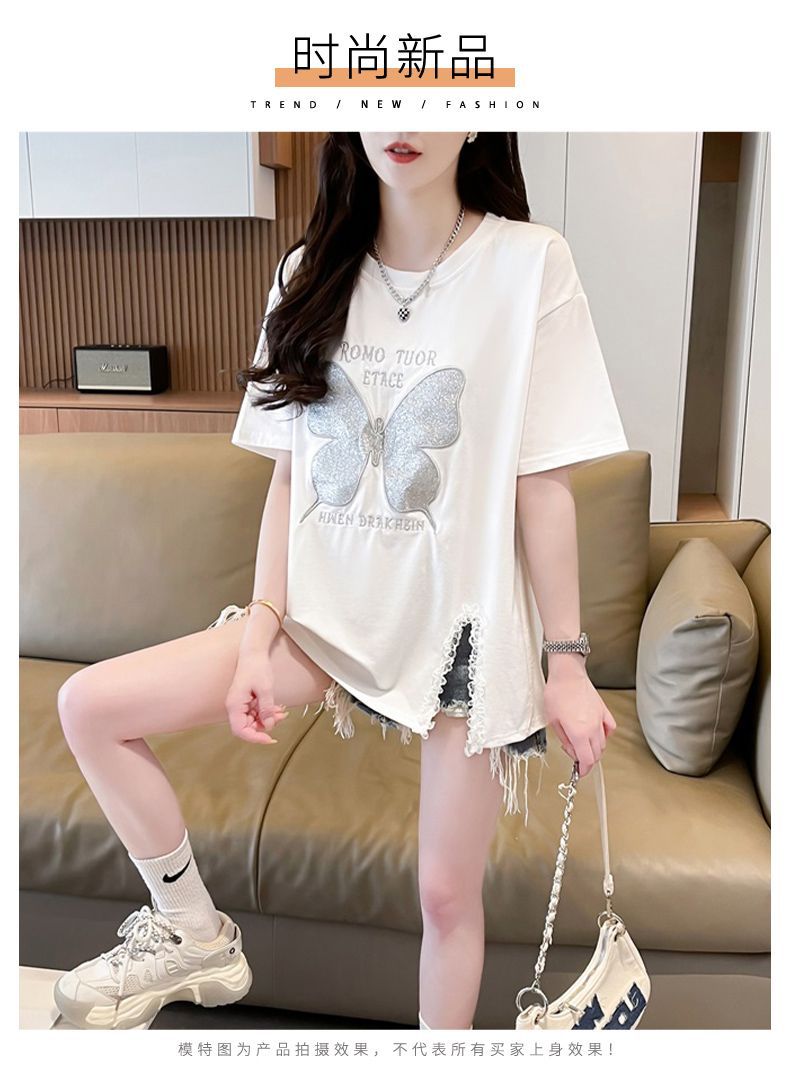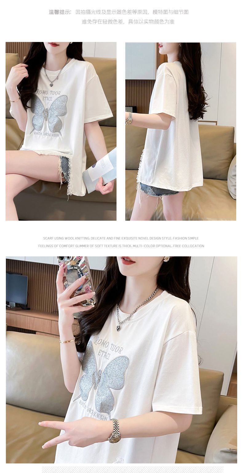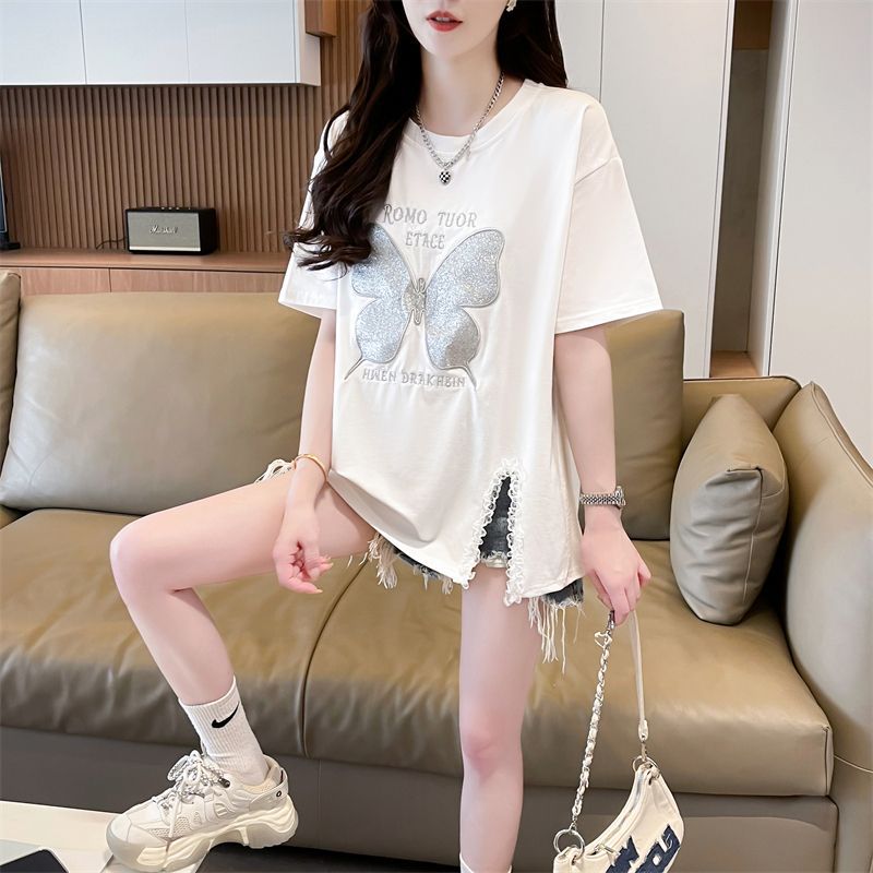 느슨한 여름 여성 반팔 티셔츠 나비 하이 엔드 유럽식 세련된 편지 반소매 스플릿 탑