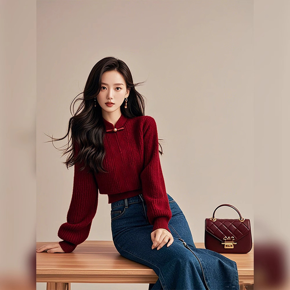 여성을 위한 새로운 중국 스타일 국립 스타일 버튼 레드 니트 바닥 셔츠, 봄 이너 레이어 바닥 셔츠, 도파민 웨어 탑스토어 가기