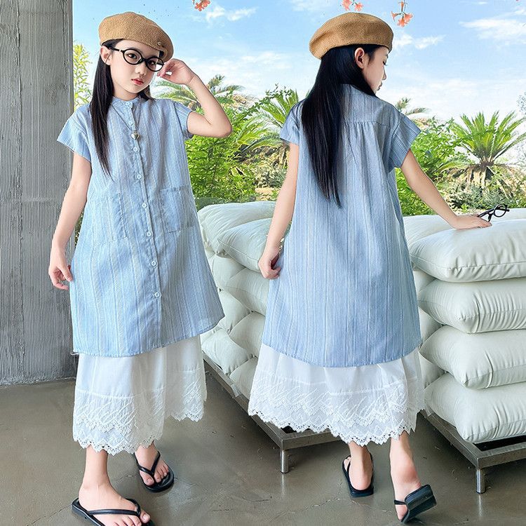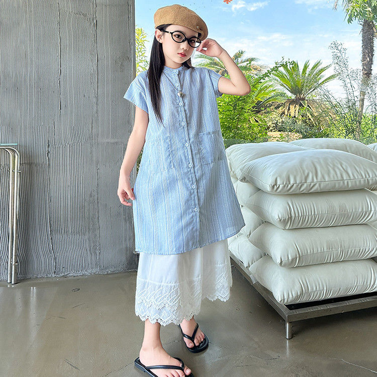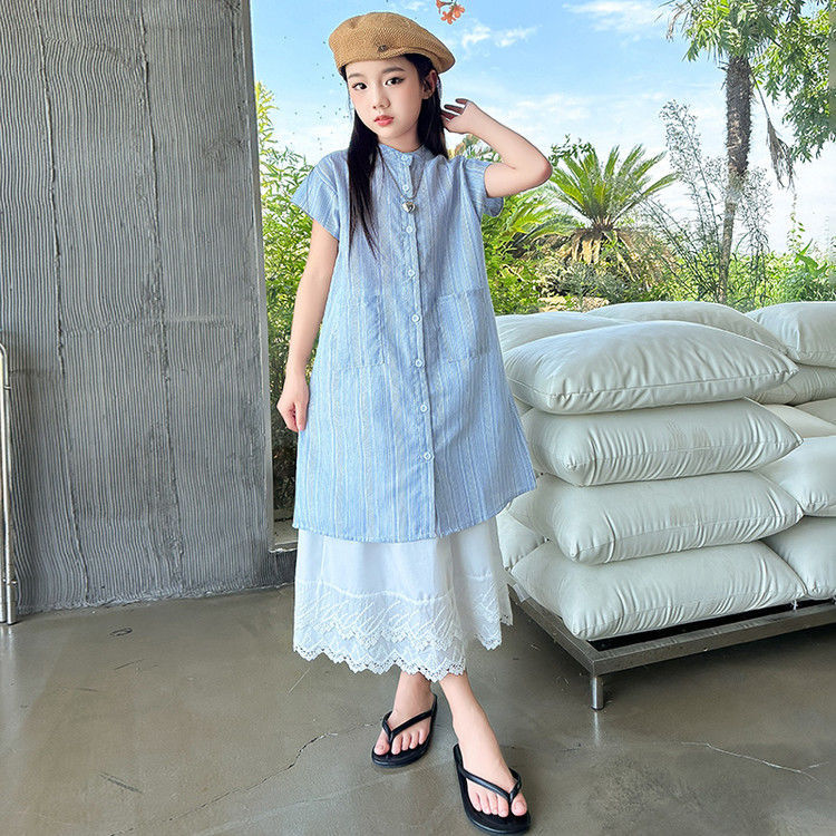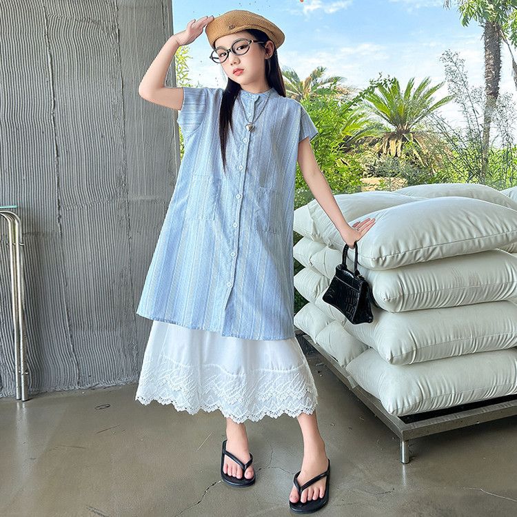 2025 여름 새로운 cuhk 어린이 휴가 스타일 투피스 소녀의 서양식 줄무늬 셔츠 긴 치마 세트 쌓아