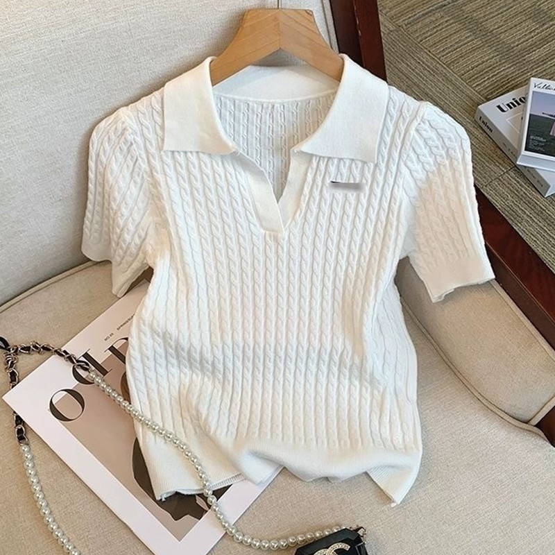 [40.00 kg-100.00 kg] 기질 옷깃 아이스 실크 니트 탑 여성 여름 플러스 사이즈 느슨한 얇은 트위스트 반팔 티셔츠