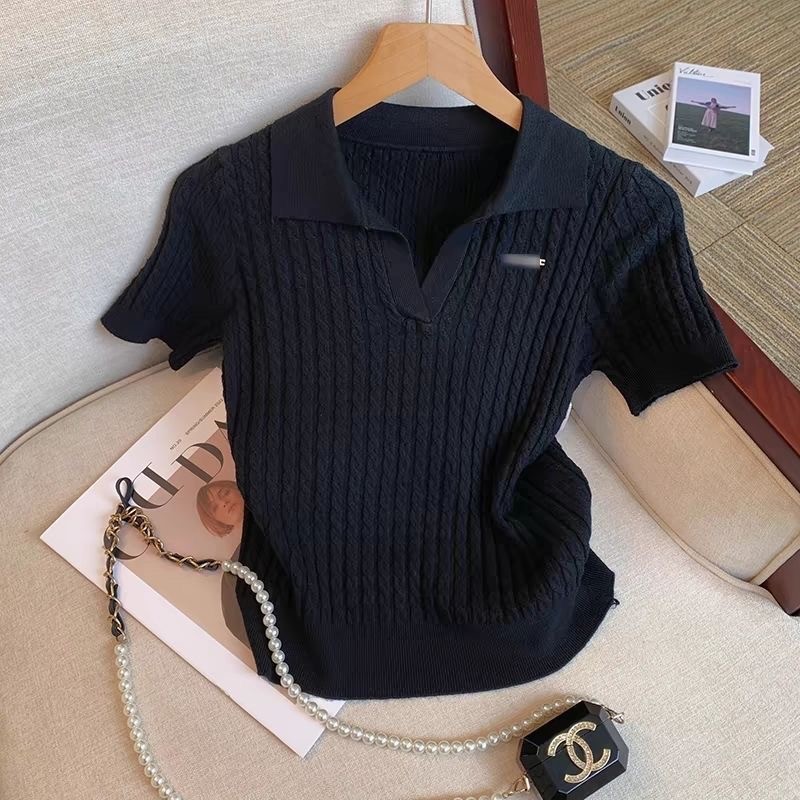 [40.00 kg-100.00 kg] 기질 옷깃 아이스 실크 니트 탑 여성 여름 플러스 사이즈 느슨한 얇은 트위스트 반팔 티셔츠스토어 가기