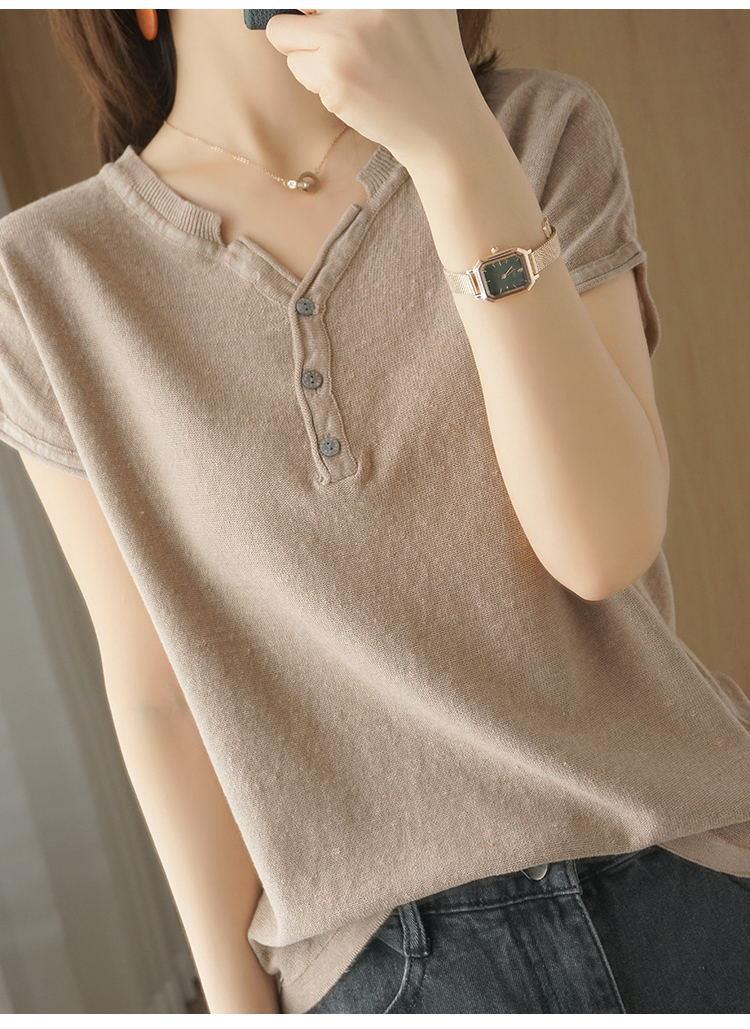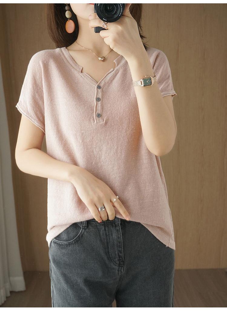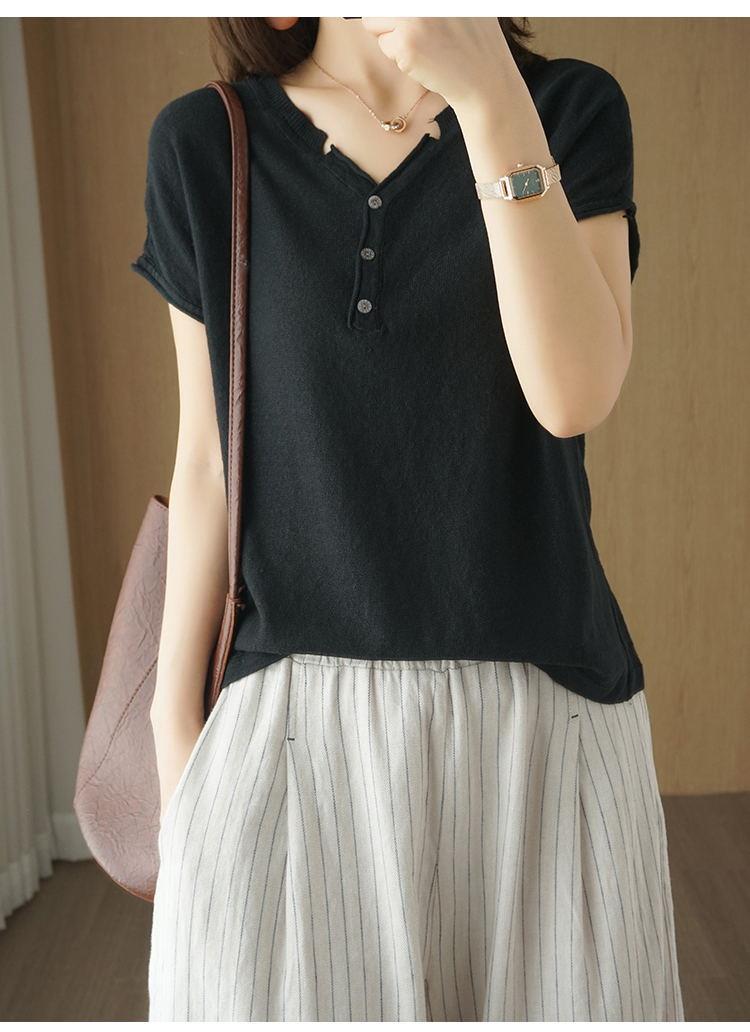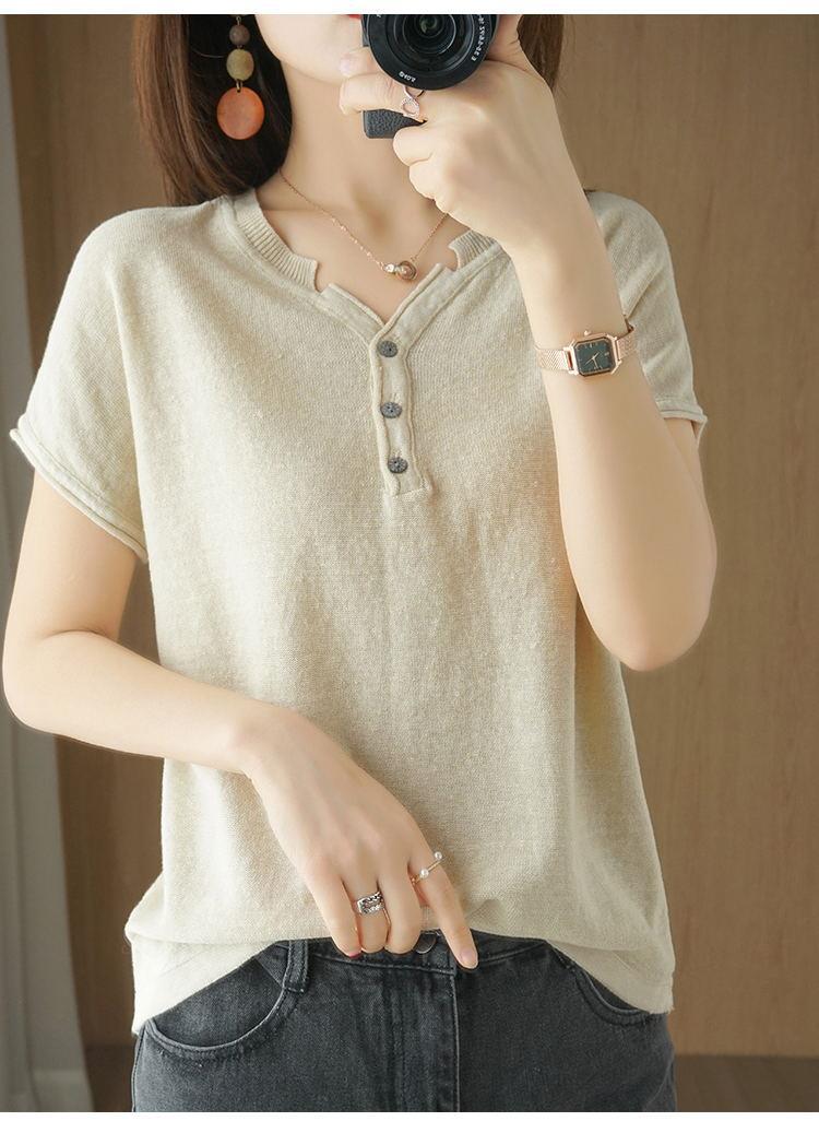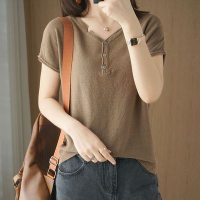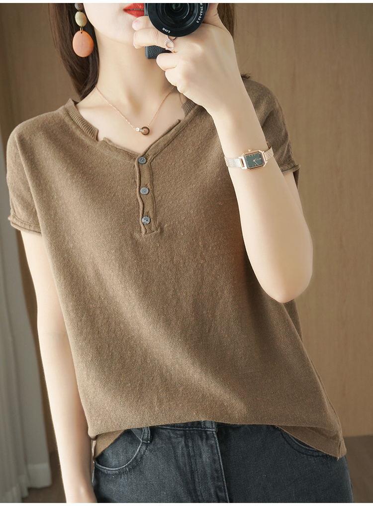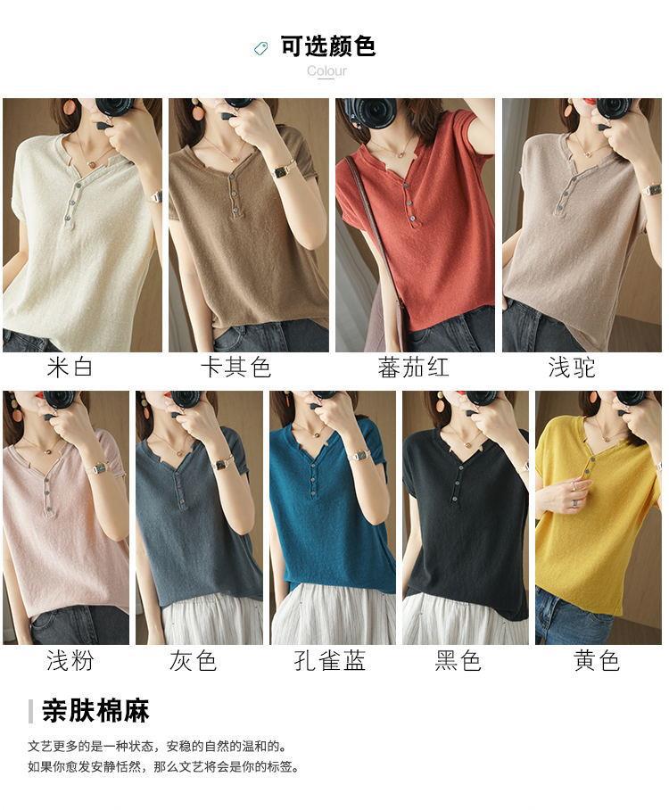 뉴 코튼 반팔 여성용 솔리드 컬러 니트 여성용 V 넥 코튼 앤 리넨 티셔츠 플러스 사이즈 한국식 보토밍 여름 반소매 탑스토어 가기
