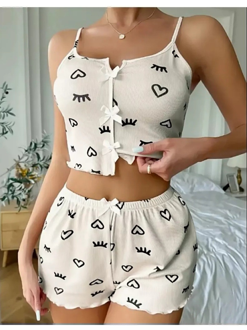 유럽과 미국의 2025 심장 모양의 속눈썹 인쇄 잠옷 세트 V-Neck 슬링 톱 반바지 여성 잠옷스토어 가기
