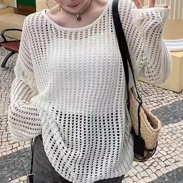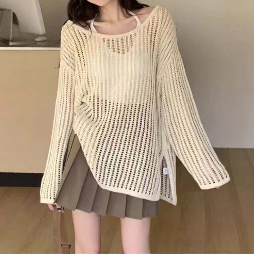 2025년 여름 캐주얼 스타일의 루즈핏 오프숄더 니트 셔츠, 슬림핏, 자외선 차단, 긴팔 여성용 탑스토어 가기