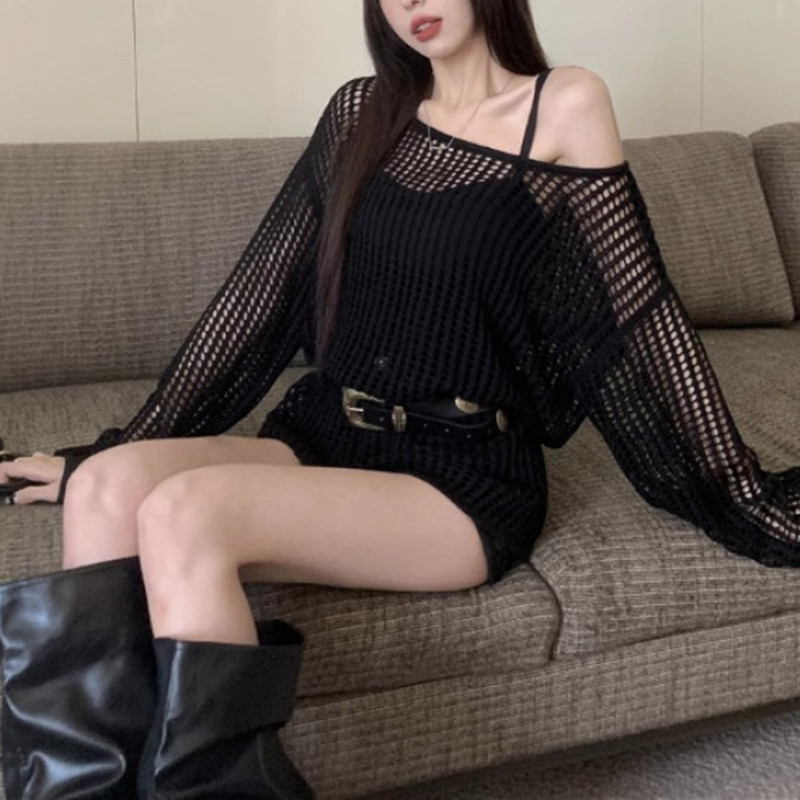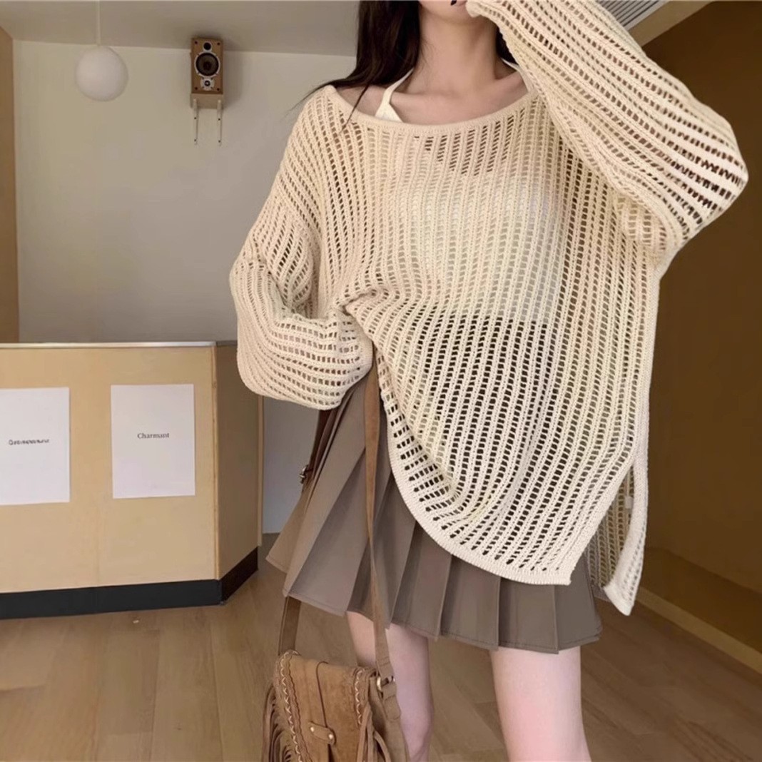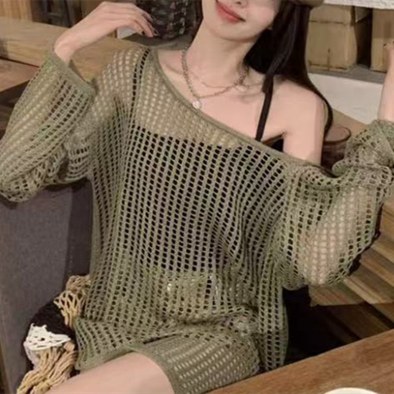 2025년 여름 캐주얼 스타일의 루즈핏 오프숄더 니트 셔츠, 슬림핏, 자외선 차단, 긴팔 여성용 탑