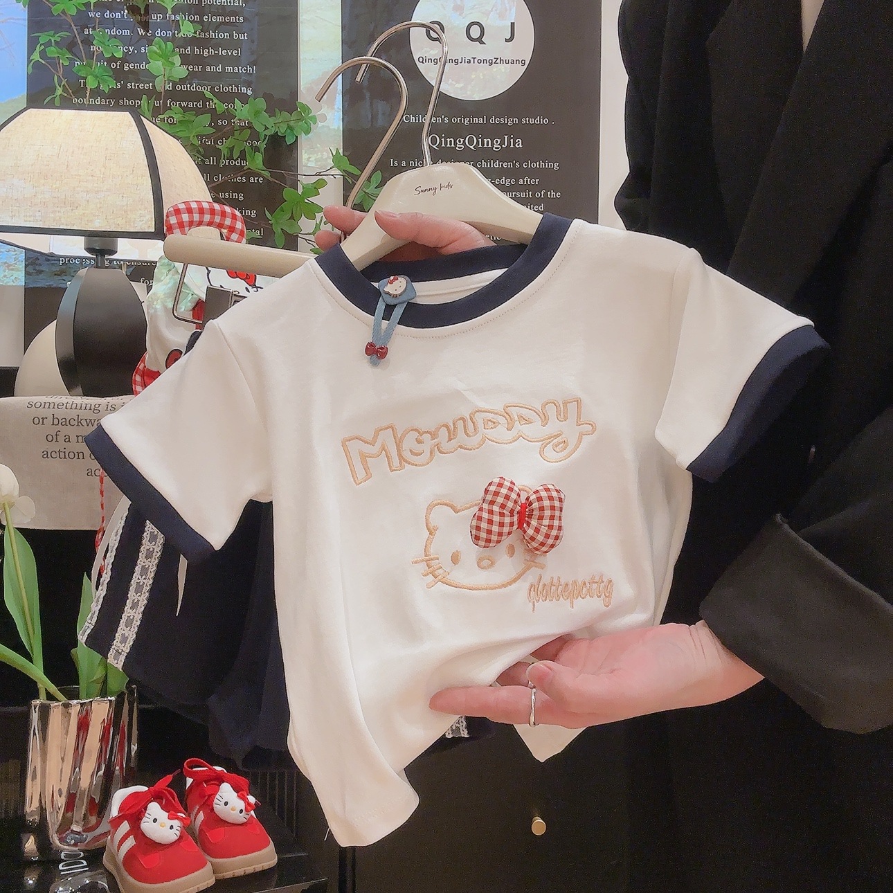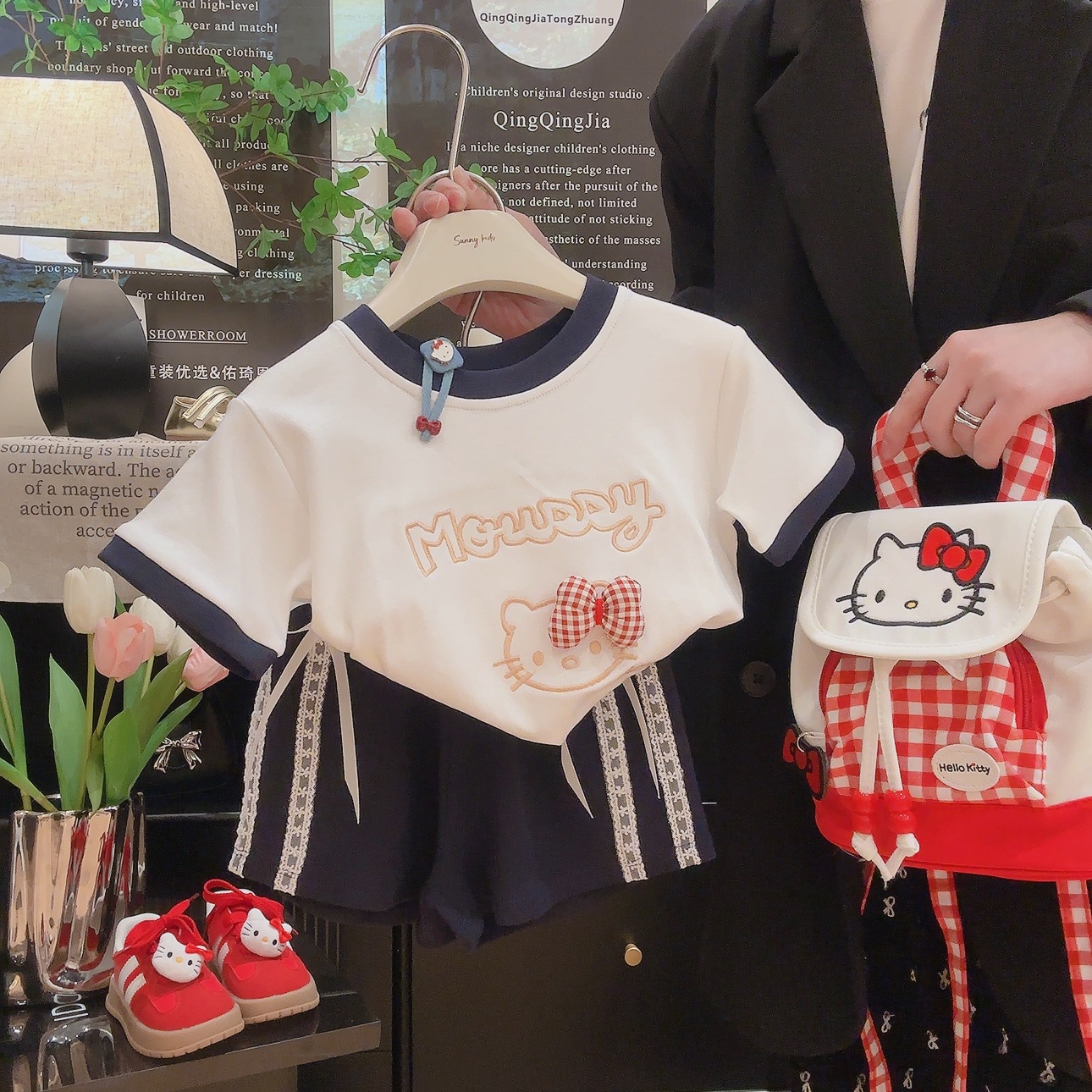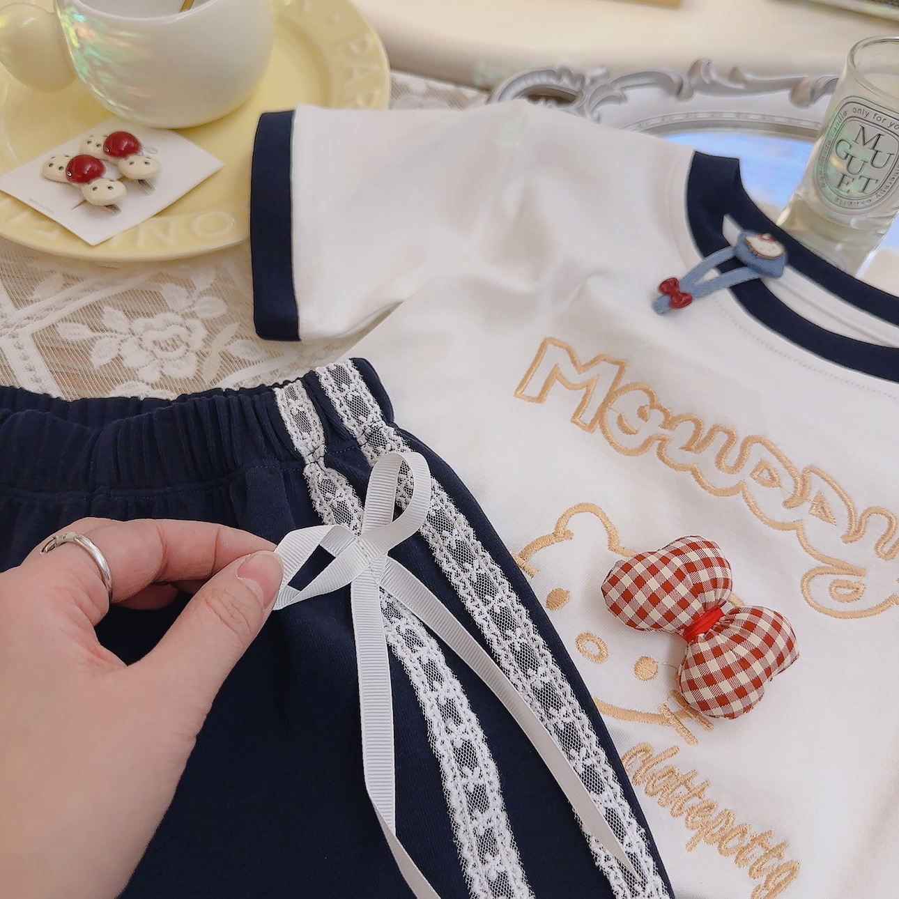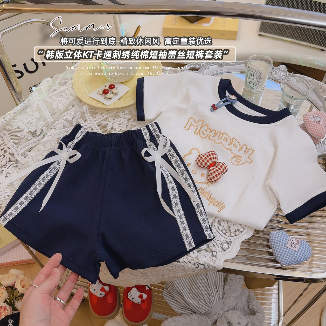 여자 정장 여름 새로운 입체 활 반팔 레이스 티셔츠 반바지 클래스 순수 코튼 달콤한 부모-자식 정장스토어 가기