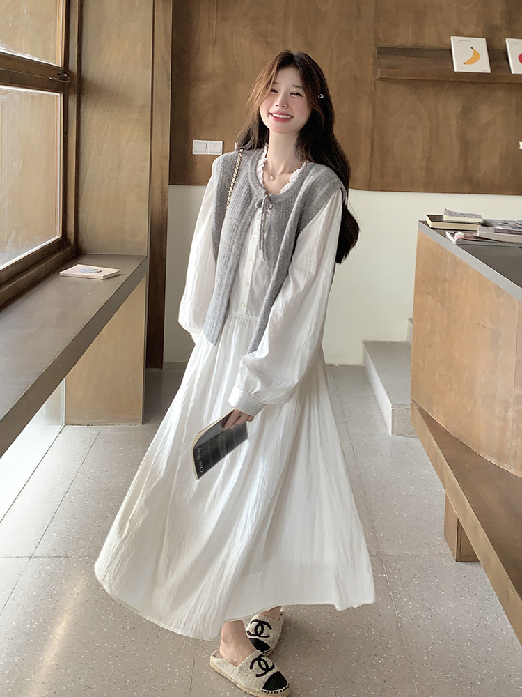 2025 봄과 여름 새로운 부드러운 스타일 화이트 원피스 세트 여성 한국식 그레이 니트 조끼 원피스 투피스 세트스토어 가기