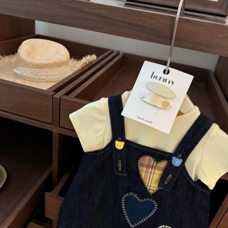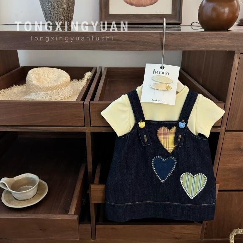 [동싱위안] 복숭아 복숭아의 마음! 여성 보물 거위 노란색 티셔츠 짧은 소매 사랑 천 부드러운 데님 스트랜드 스커트 세트
