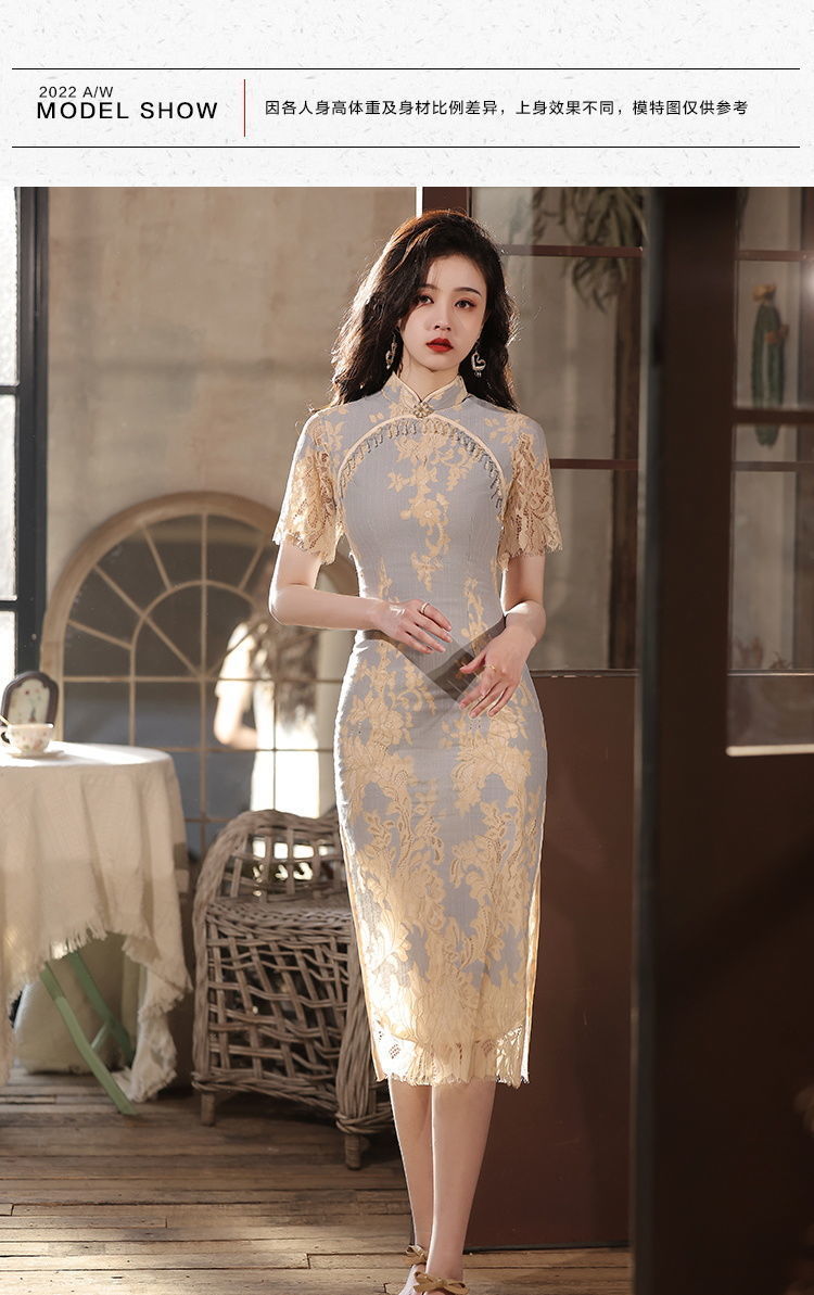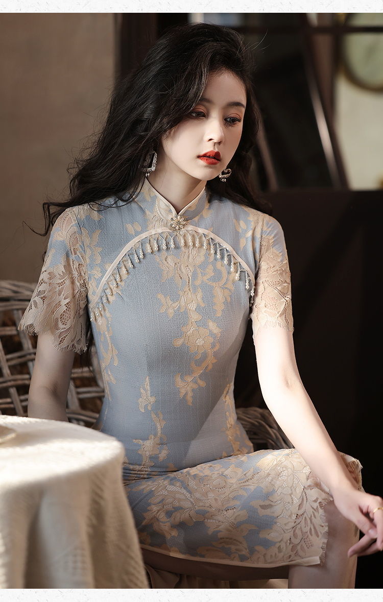 블루 할로우 레이스 어린 소녀 하이 엔드 기질 개선 청삼 원피스 2025 년 새 여름 소녀 봄