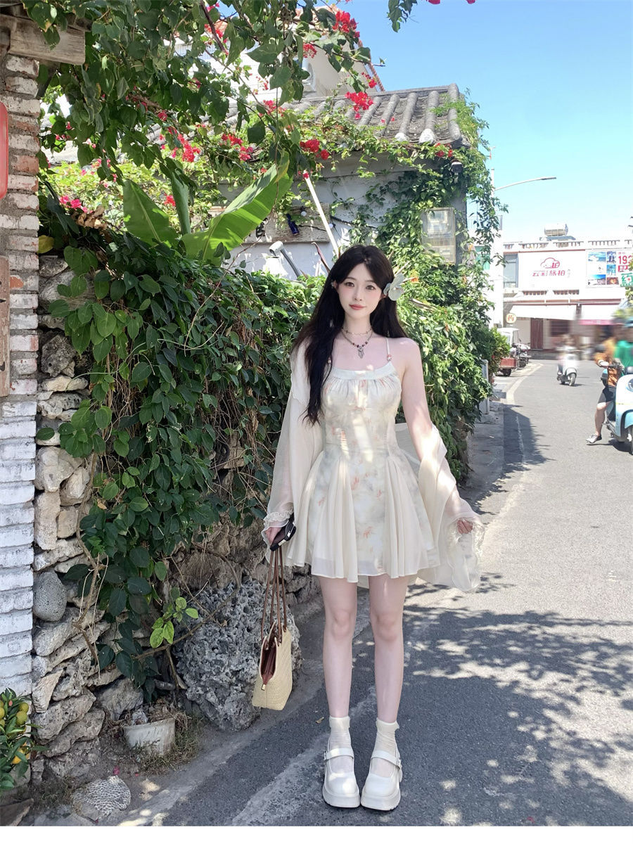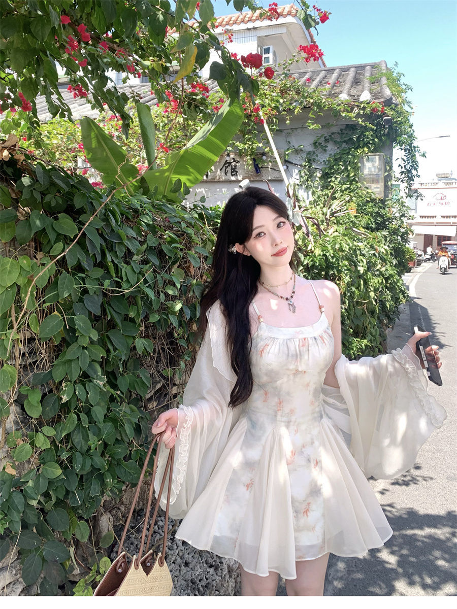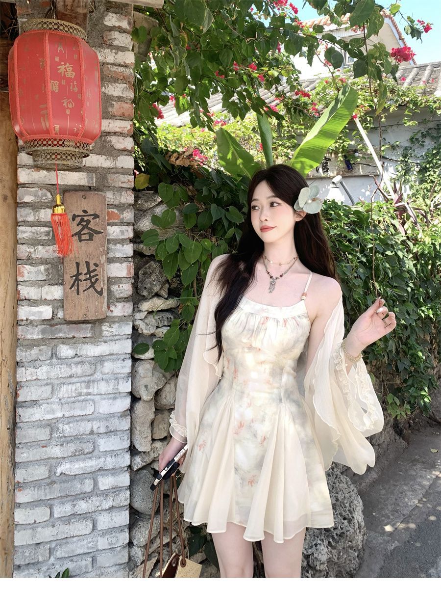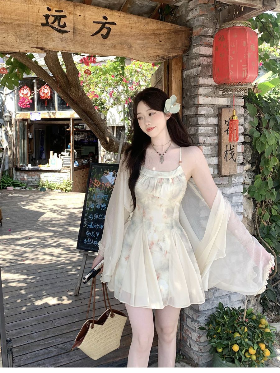 새로운 중국 스타일 국가 스타일 카디건 슬립 스커트 세트 여름 새로운 달콤하고 매운 틈새 귀여운 꽃 원피스 투피스 세트