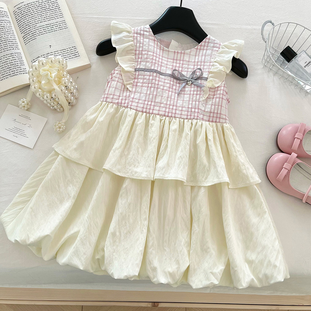 여성 아동복 여름 격자 무늬 패치 워크 버드 원피스 2025 새로운 어린이 활 작은 비행 소매 공주 원피스 트렌디스토어 가기