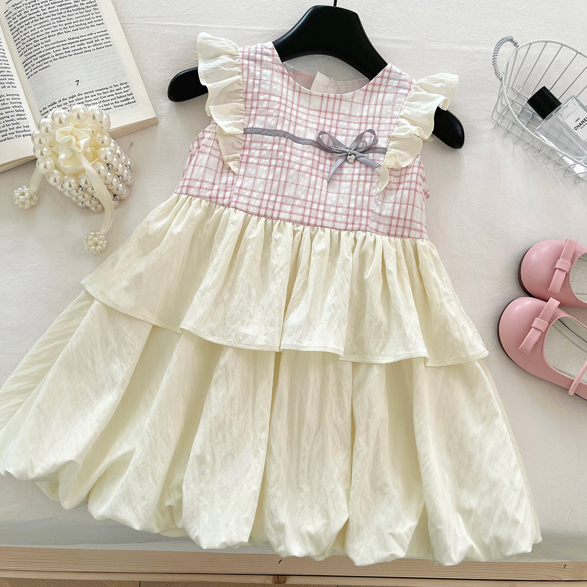 여성 아동복 여름 격자 무늬 패치 워크 버드 원피스 2025 새로운 어린이 활 작은 비행 소매 공주 원피스 트렌디