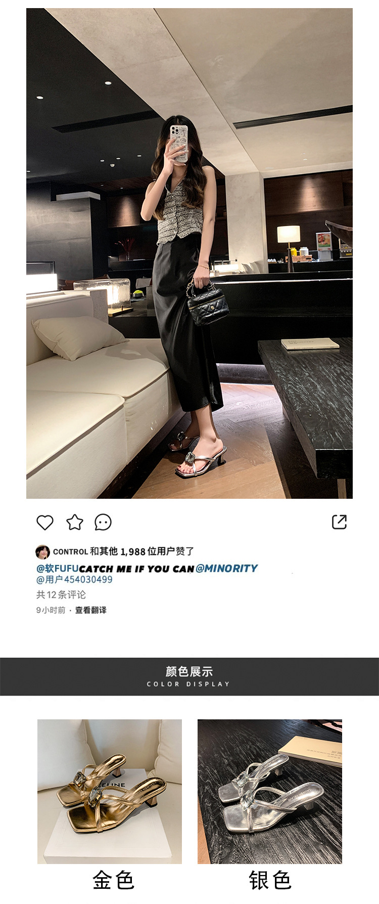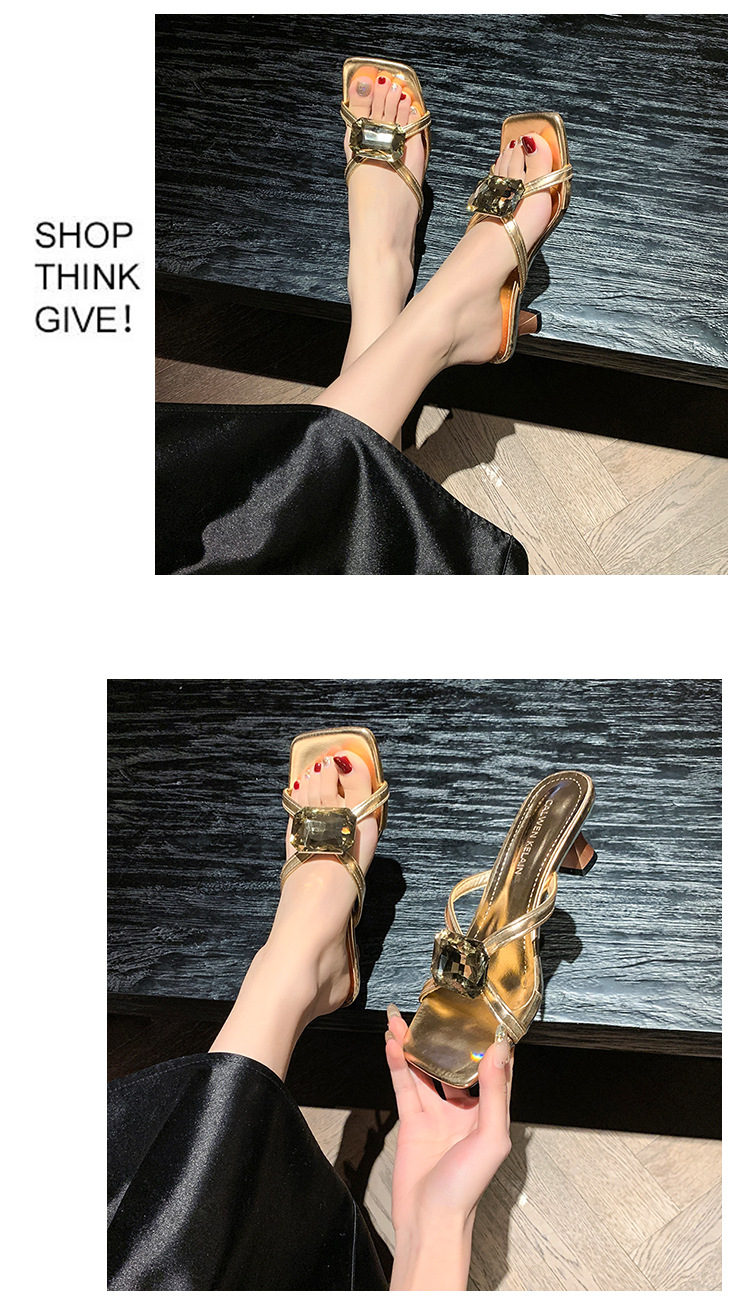 2025 여름 새로운 프랑스 스타일 라인 석 스퀘어 토 미드 힐 슬리퍼 여성 캐주얼 오픈 토우 두꺼운 힐 슬리퍼 패션 여성 신발스토어 가기