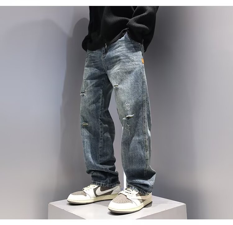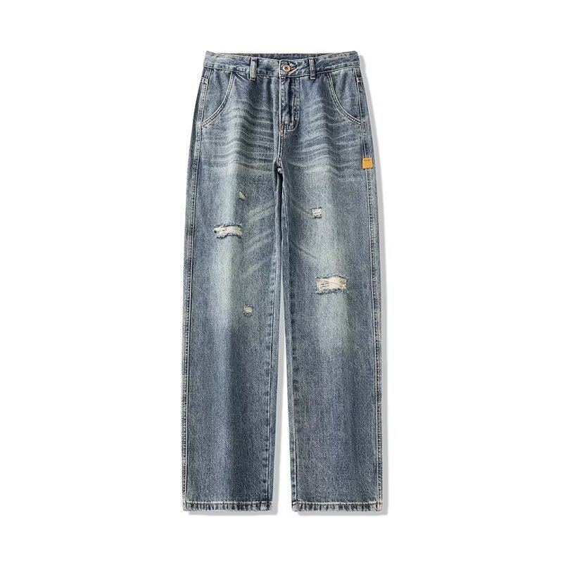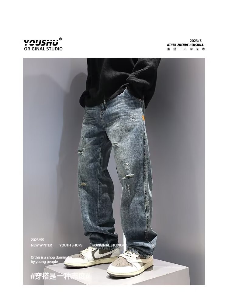 아메리칸 트렌디 브랜드 워싱 디스트레스드 찢어진 마이크로 플레어 팬츠 남성용 하이 스트리트 스트레이트 청바지…스토어 가기