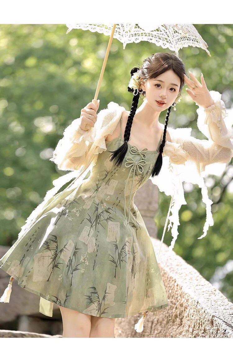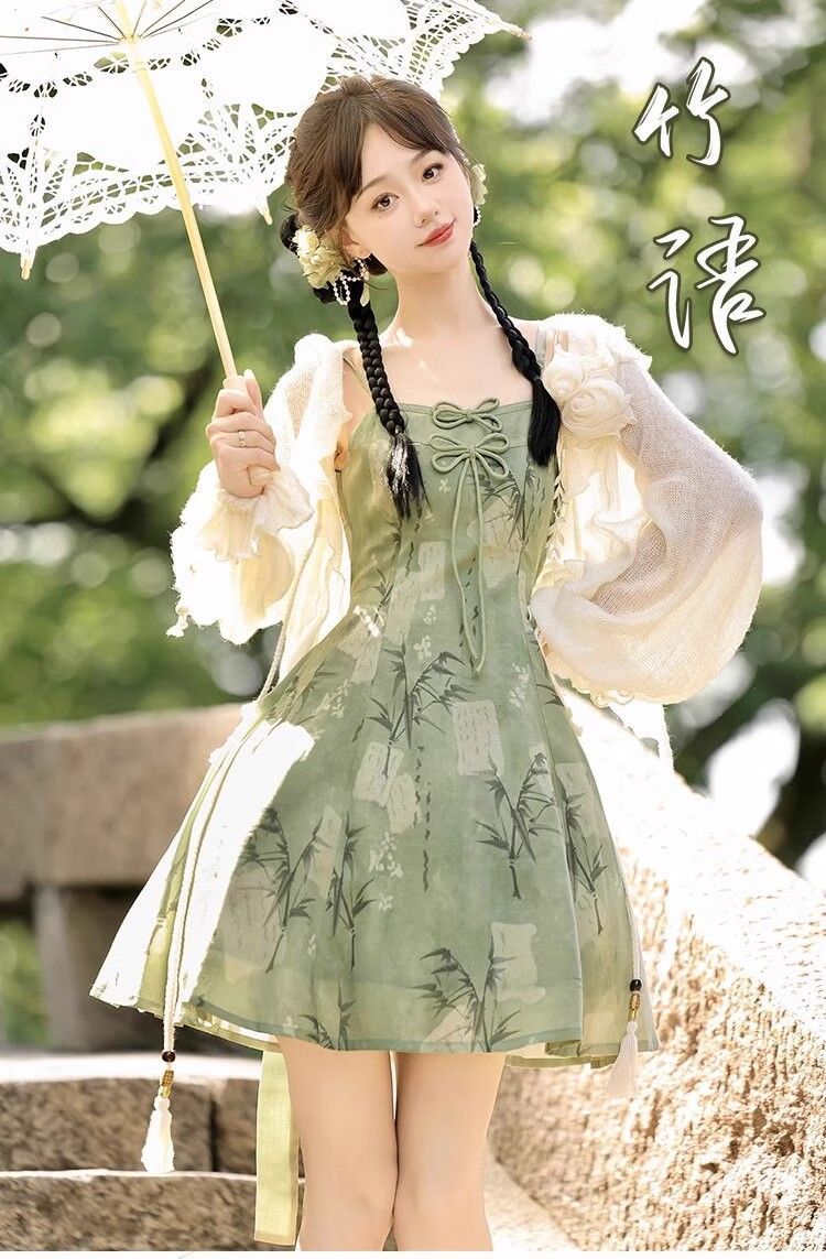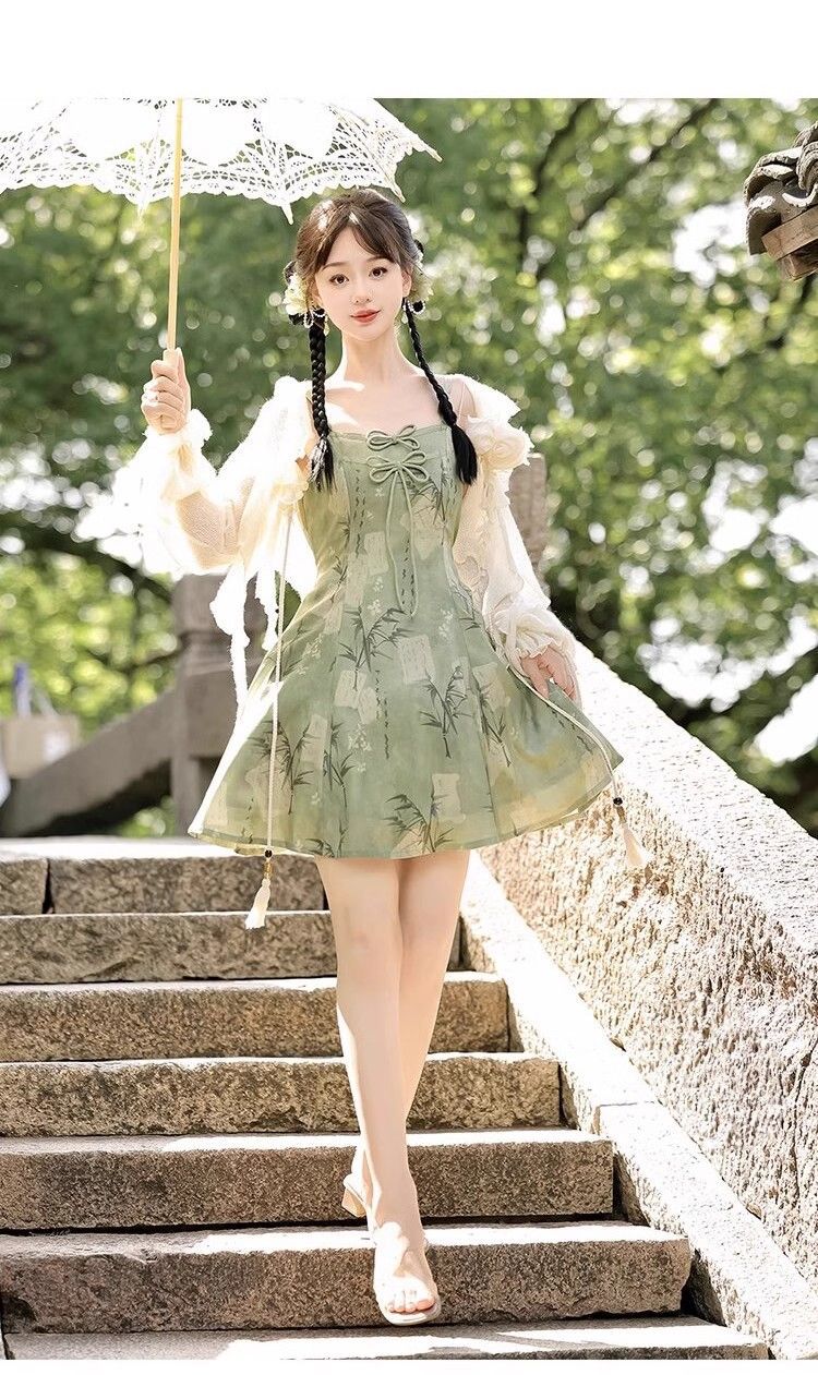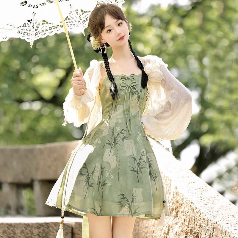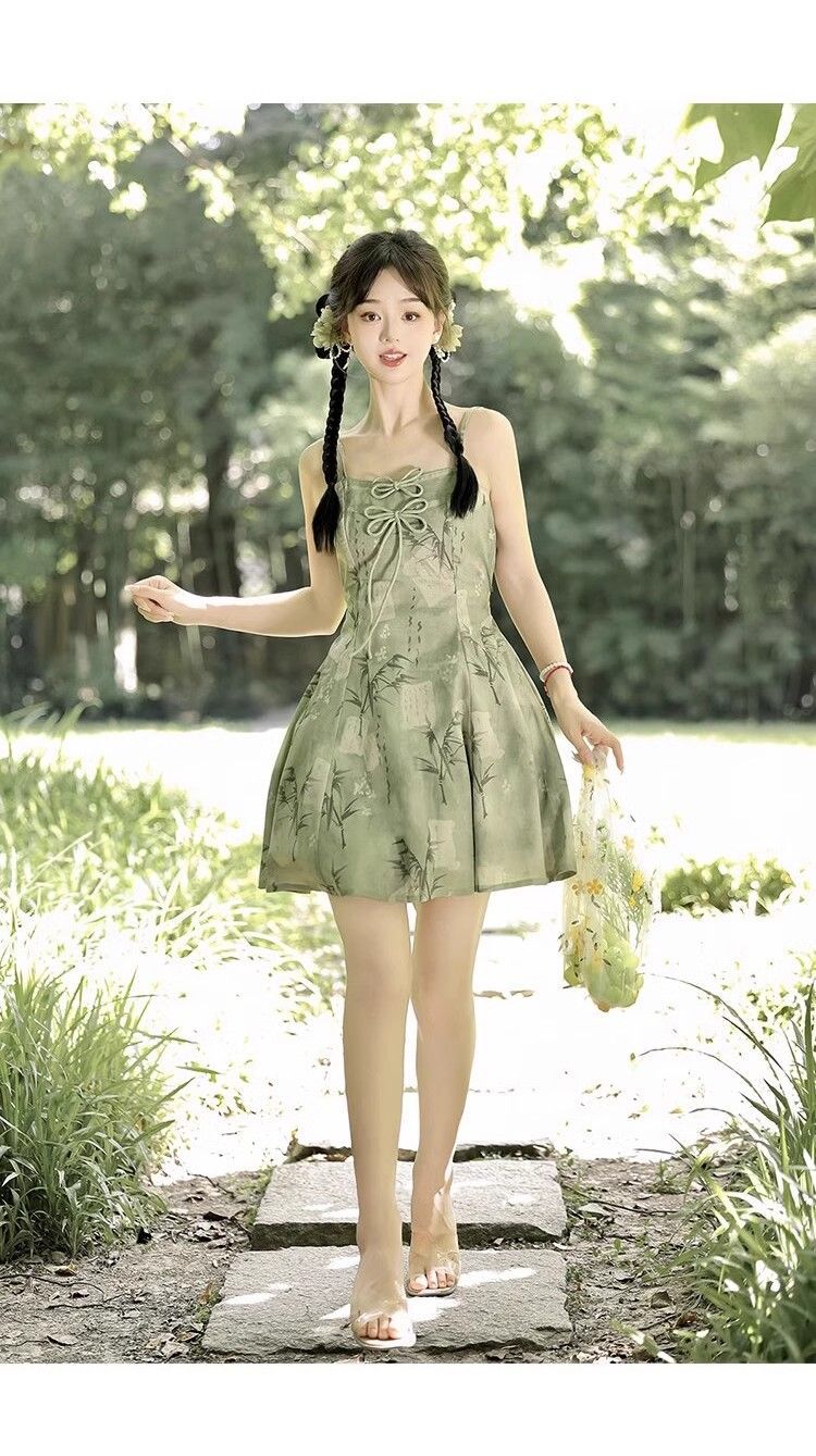 중국 스타일 원피스 여성의 2025 새로운 트렌드 여행 사진 매일 달콤한 소녀 녹색 치마 요정 그룹스토어 가기