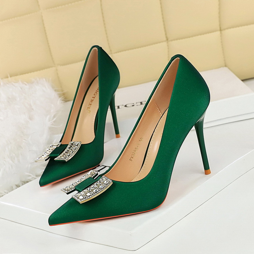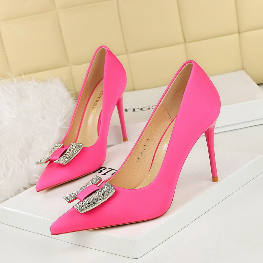 3265-K70 연회 원피스 하이힐 뾰족한 얕은 입 새틴 신발 금속 라인스톤 활 기질 여성 신발스토어 가기