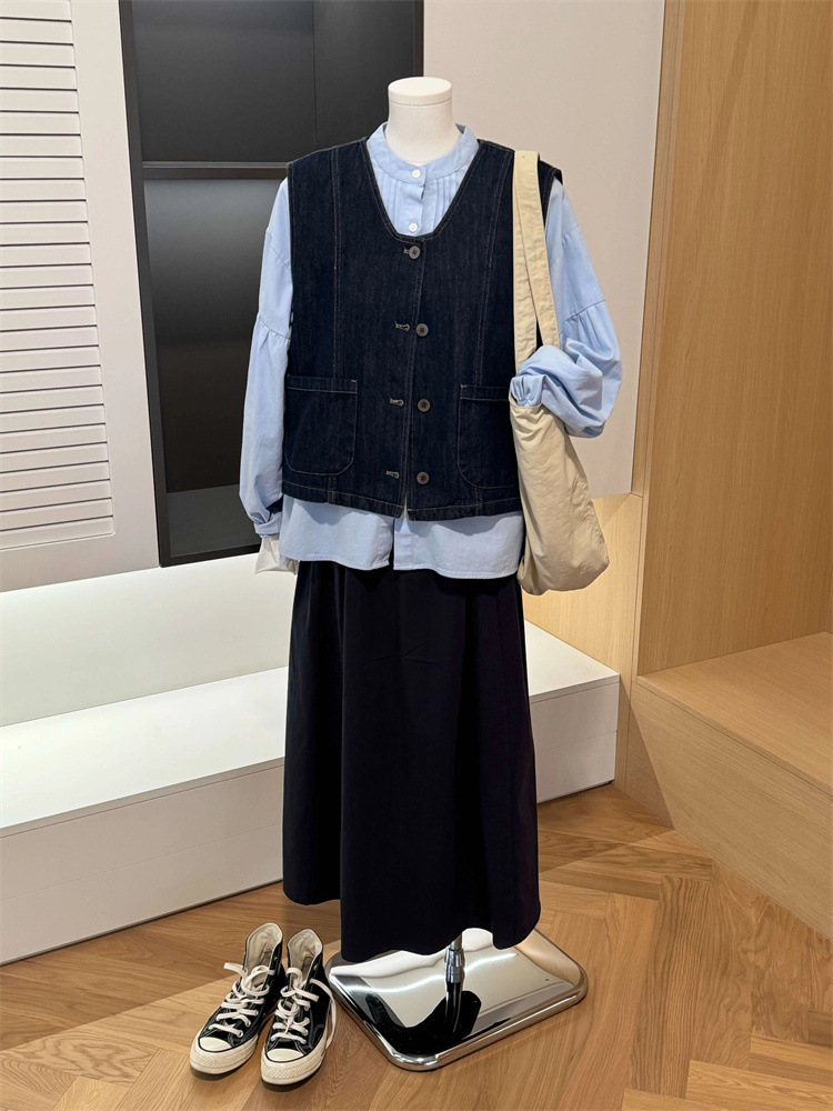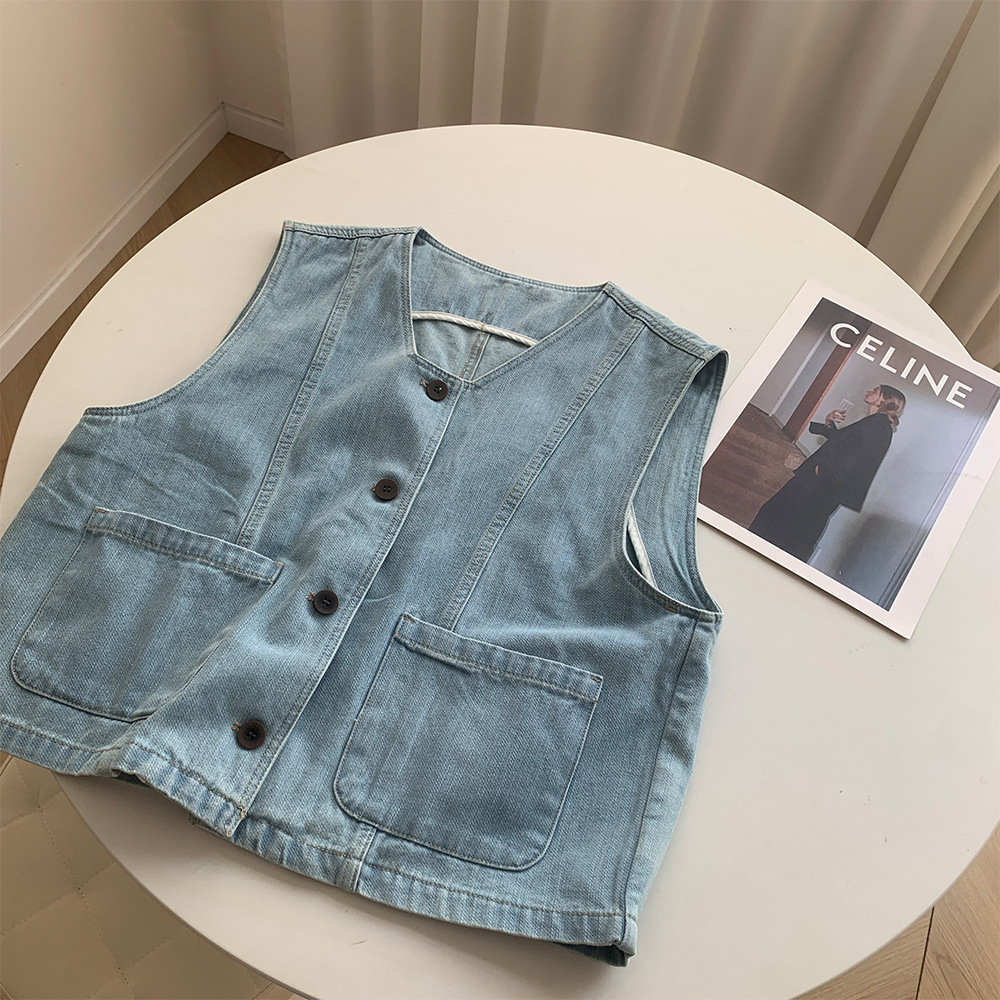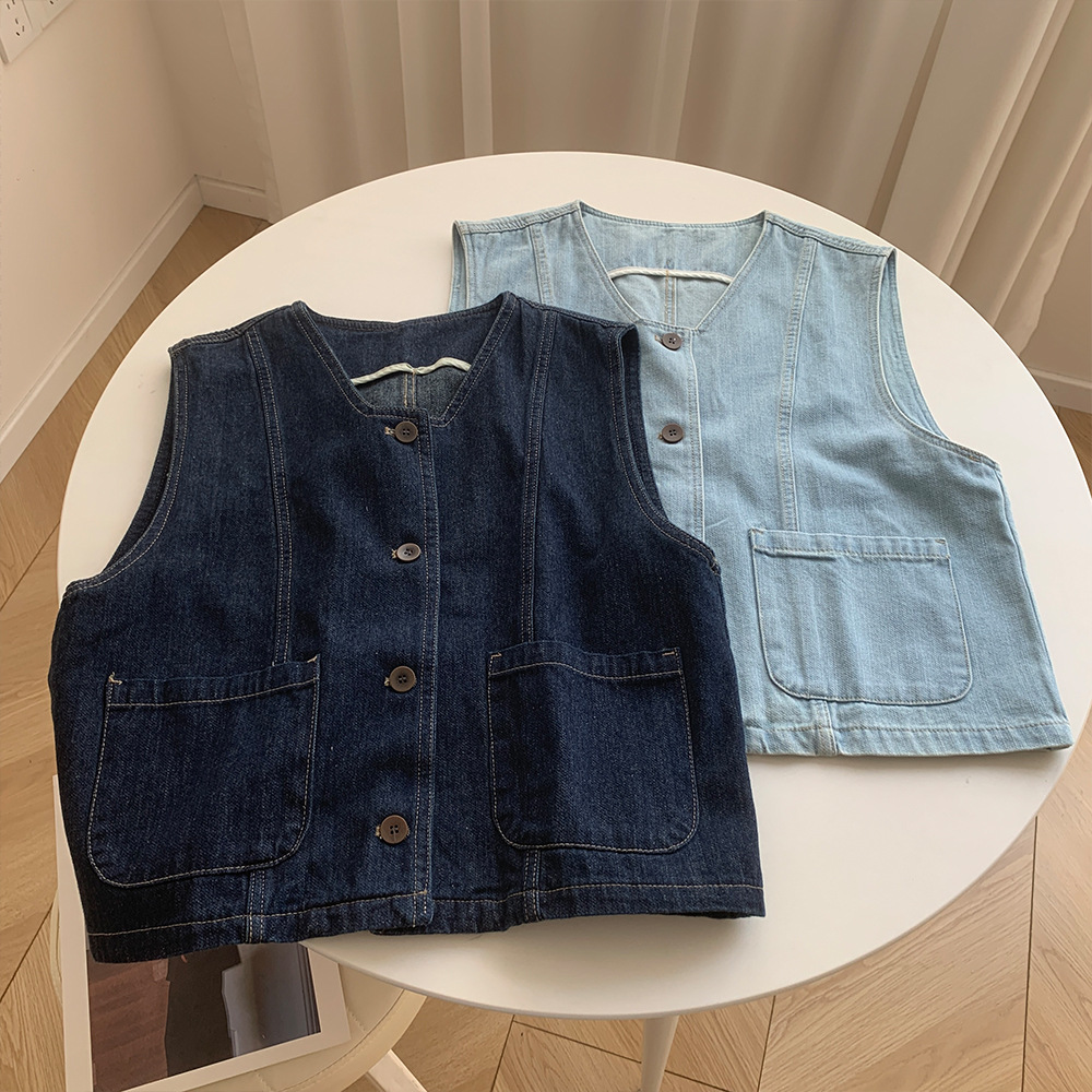 봄과 가을 쌓인 라운드 넥 패치 워크 포켓 일본 빈티지 세탁 라이트 블루 조끼 여성 조끼 어깨 재킷스토어 가기