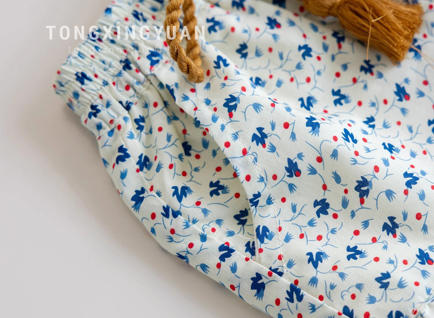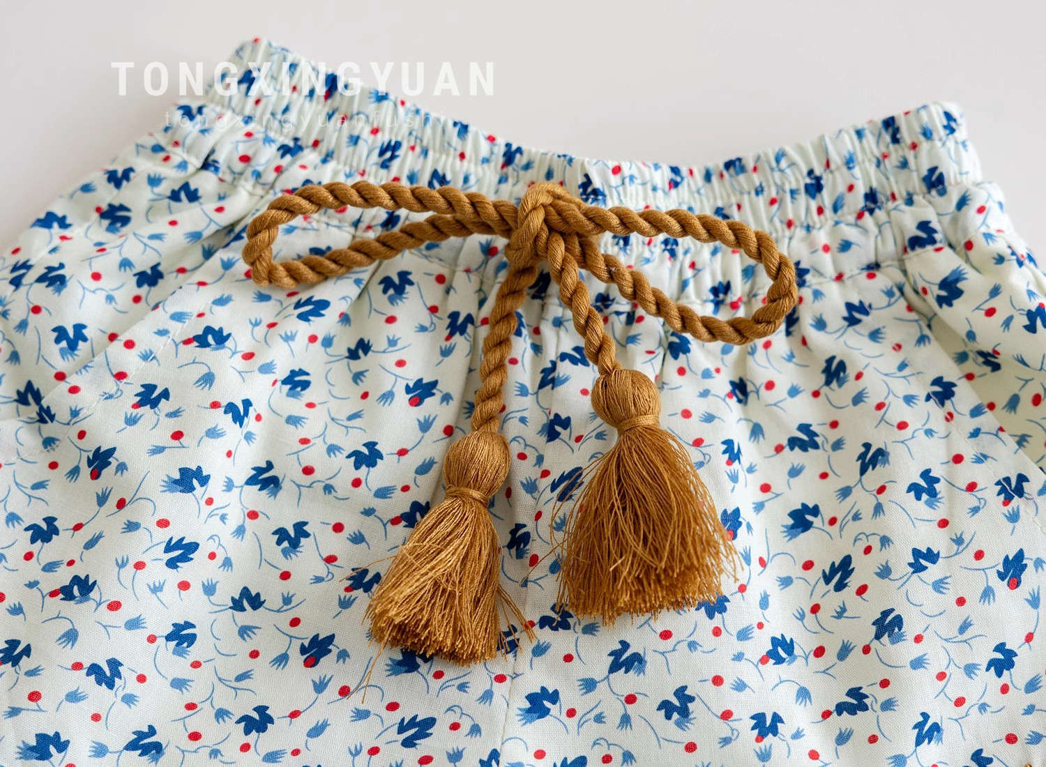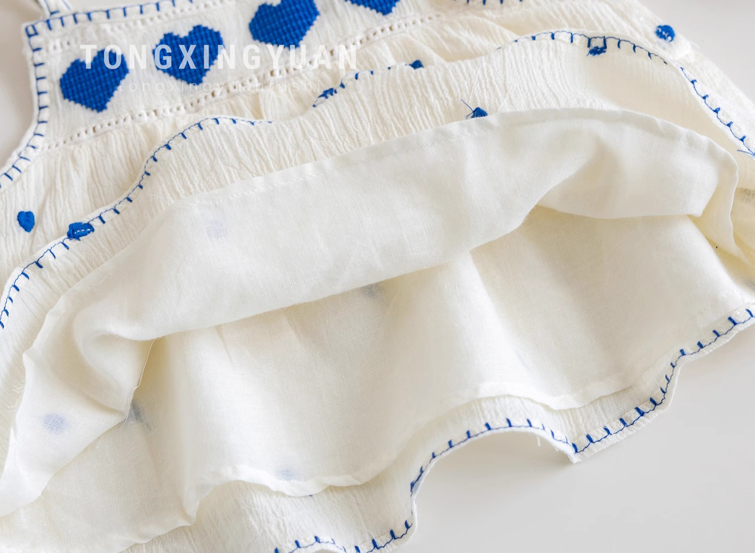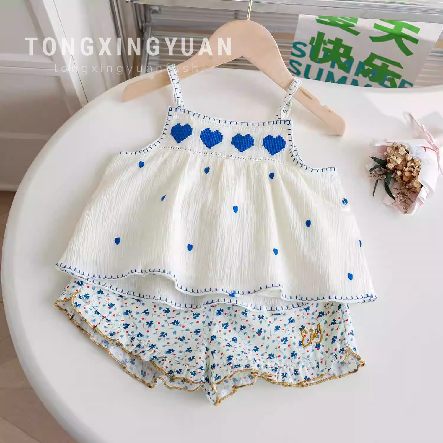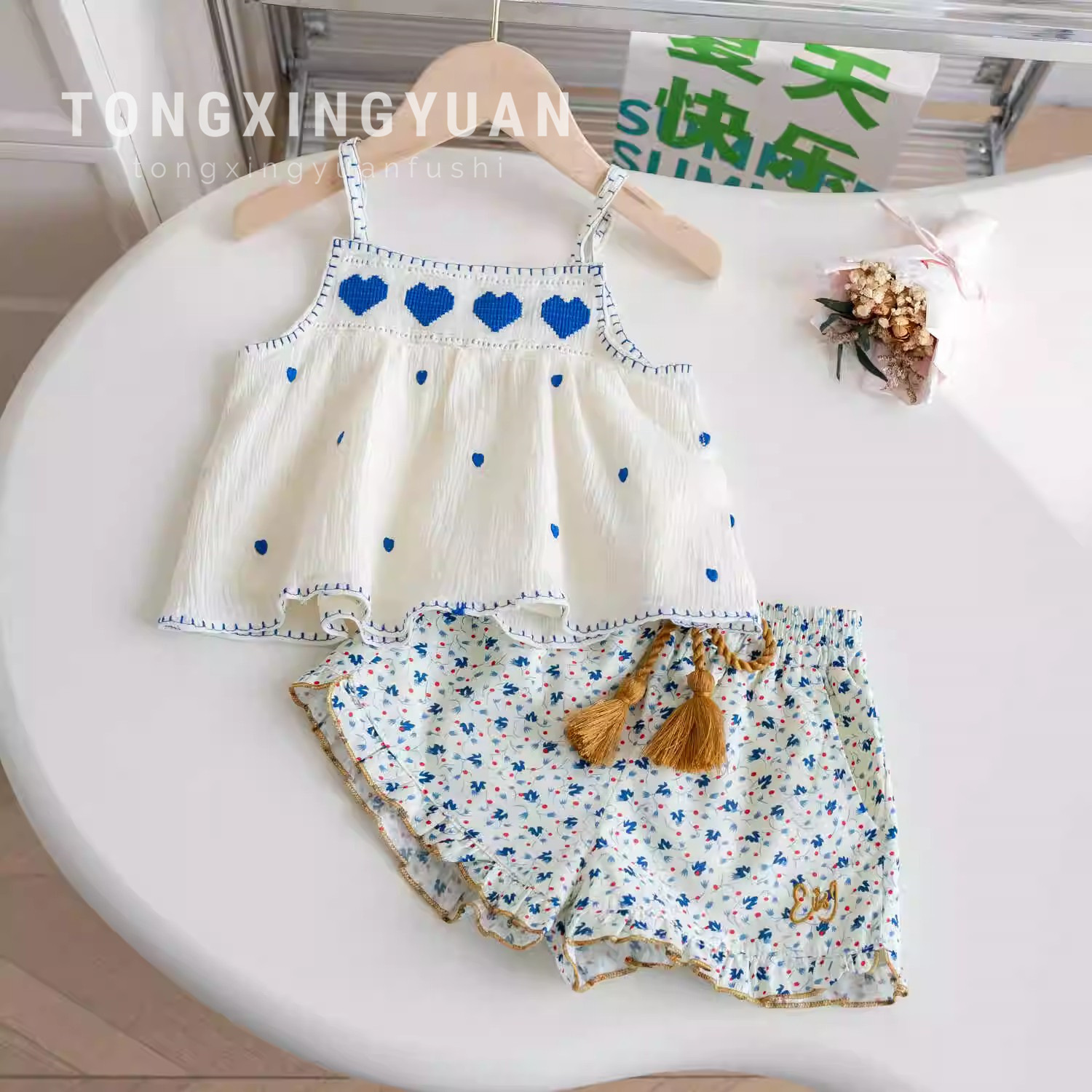Tongxingyuan 아기 한국식 어린이 자수 고삐 셔츠 여름 새로운 단색 조끼 서양식 꽃 무늬 치마 세트
