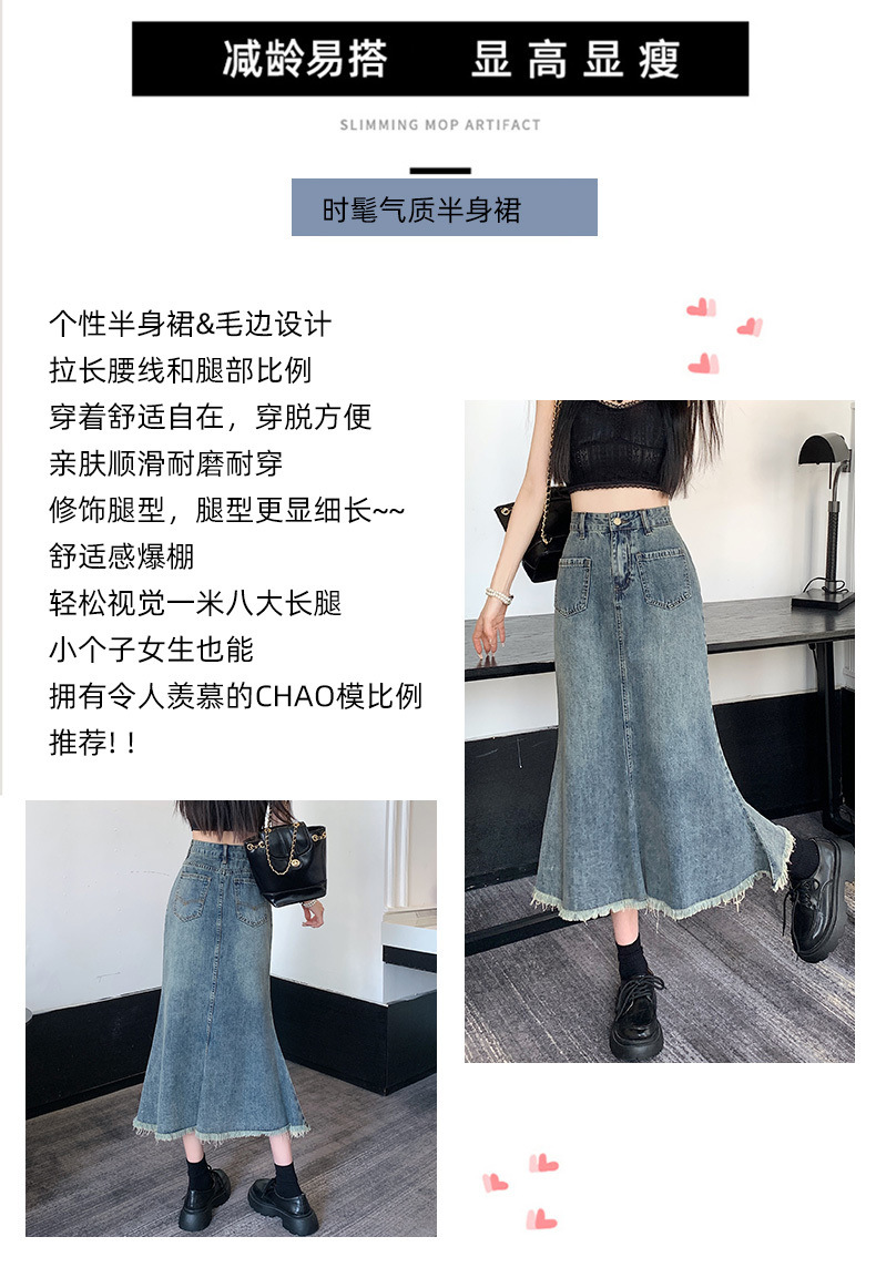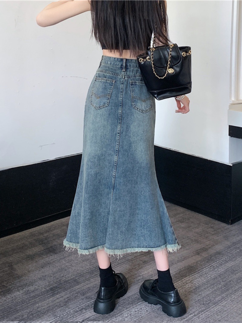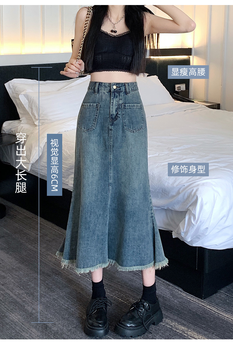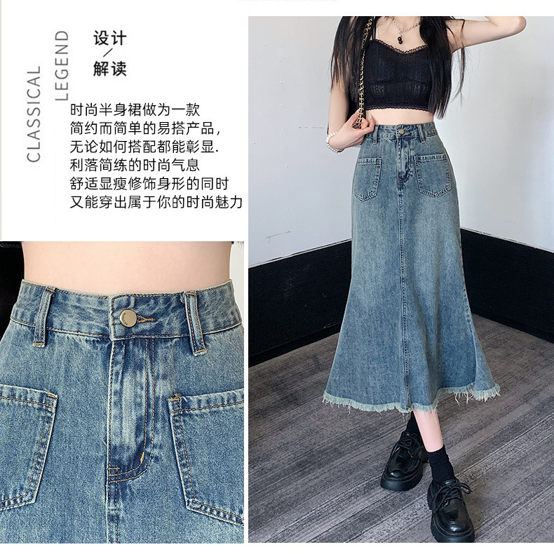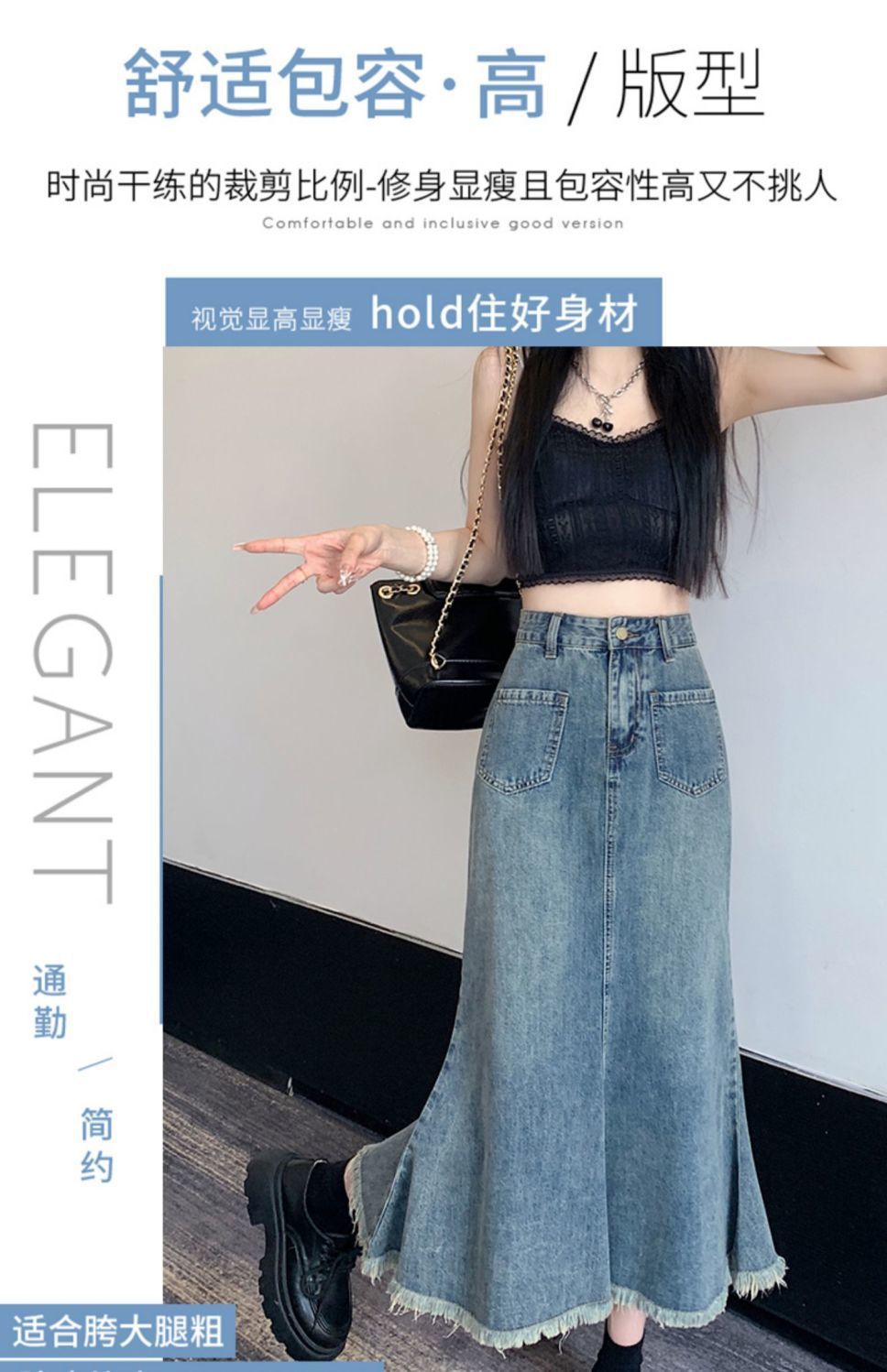 봄과 여름 2024 새로운 레트로 데님 스커트 여성 디자인 센스 니쉬 중간 길이의 피쉬 스커트스토어 가기