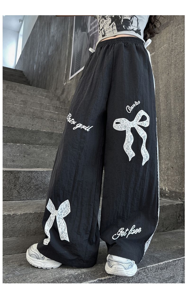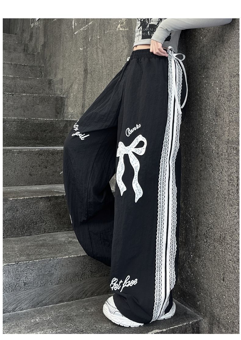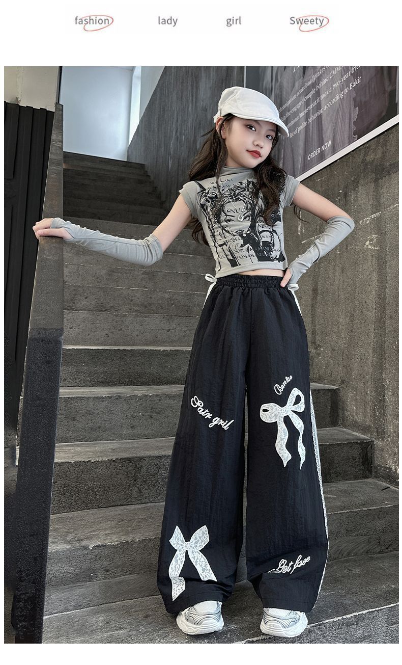 여자 봄, 가을 2025 새로운 여자 스트리트 댄스 바지 중대형 어린이 나비 넥타이 레이스 와이드 레그 캐주얼 바지