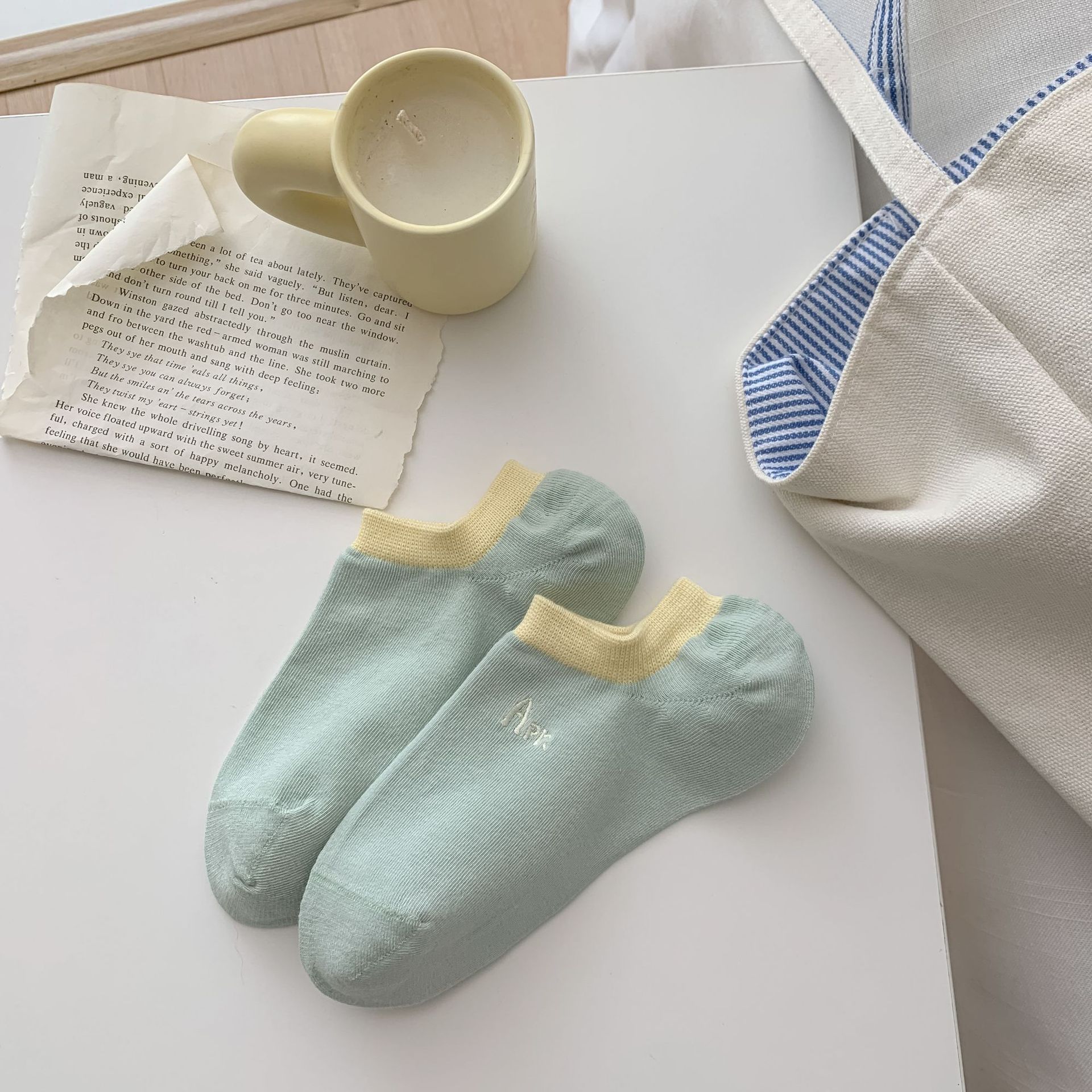 여성용 코튼 마카롱 캔디 컬러 배색 자수 보트 양말, 뒤꿈치가 떨어지지 않는 대형 힐 디자인의 실리콘 미끄럼 방지 주괴 양말스토어 가기