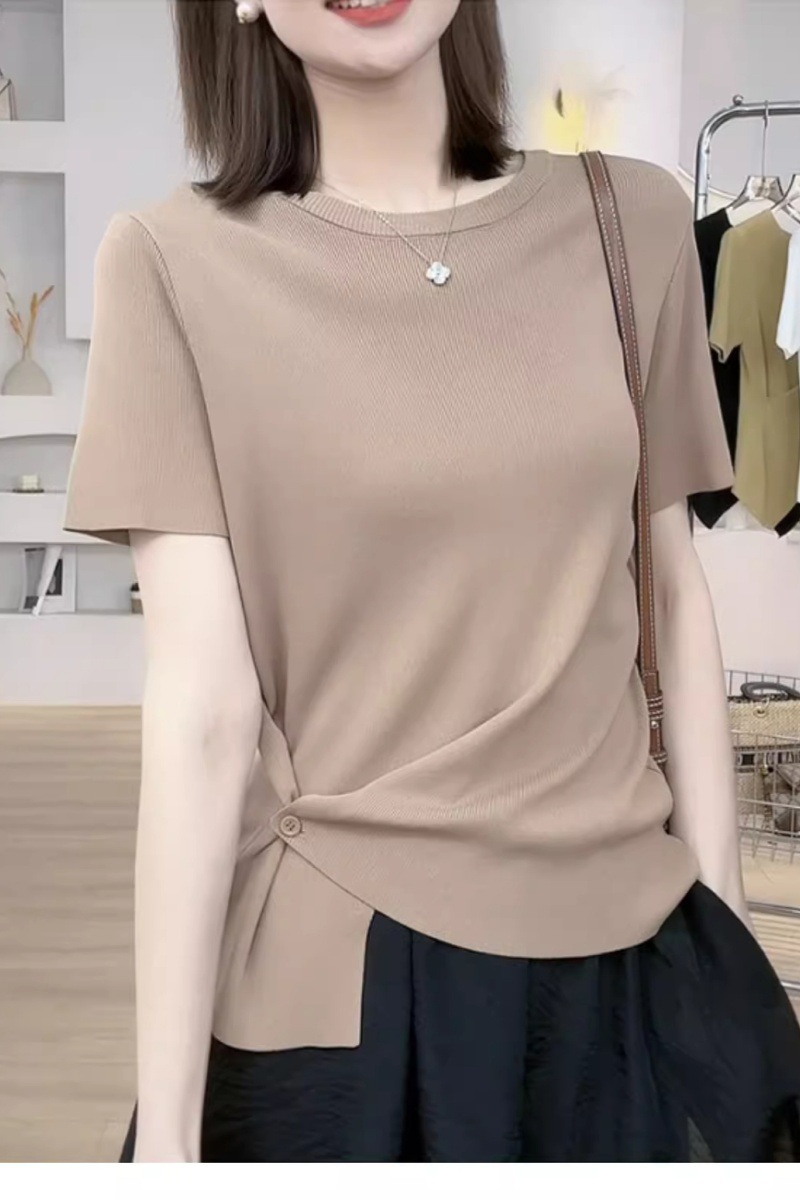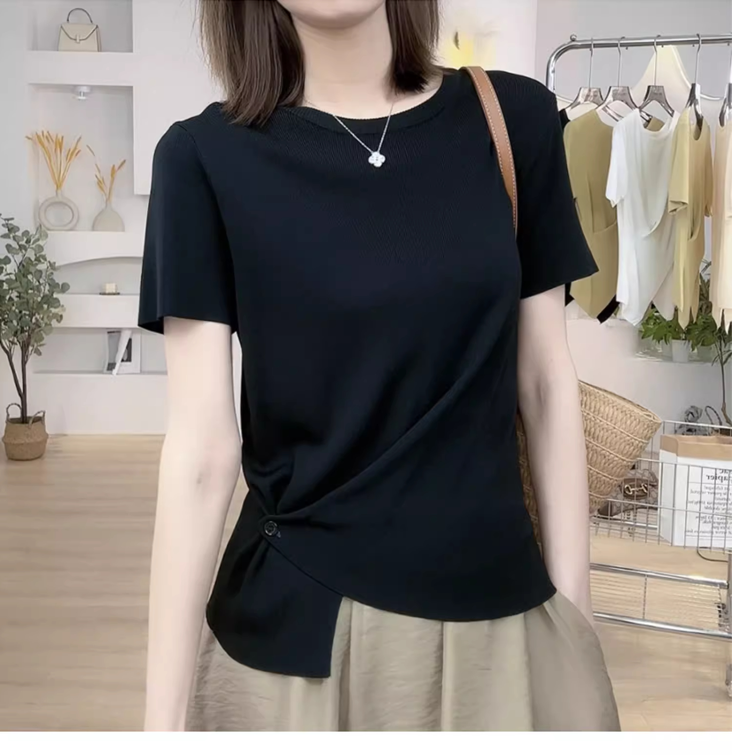 아이스 실크 어깨 반팔 티셔츠 여성용 2025 년 새 여름 루즈 슬리밍 헴 숨겨진 버클 칙칙한 셔츠스토어 가기
