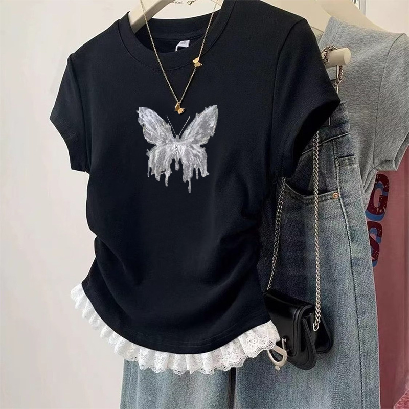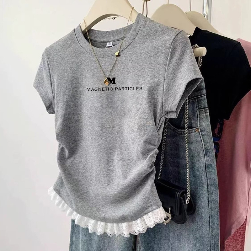 여름 어린이 캐주얼 반팔 소녀 패션 주름 짧은 티셔츠 중대형 어린이 다용도 레이스 바닥 셔츠 탑