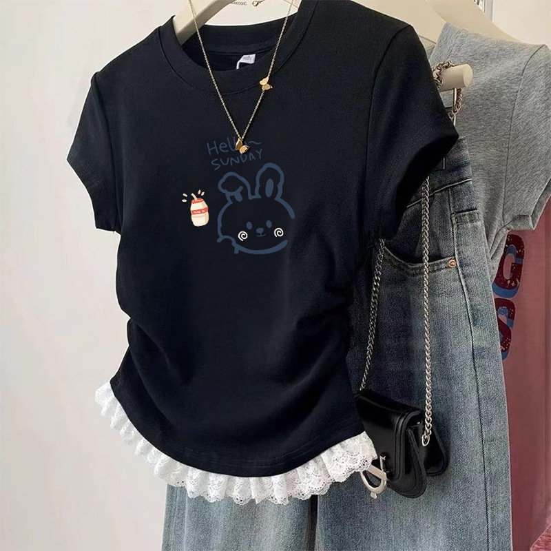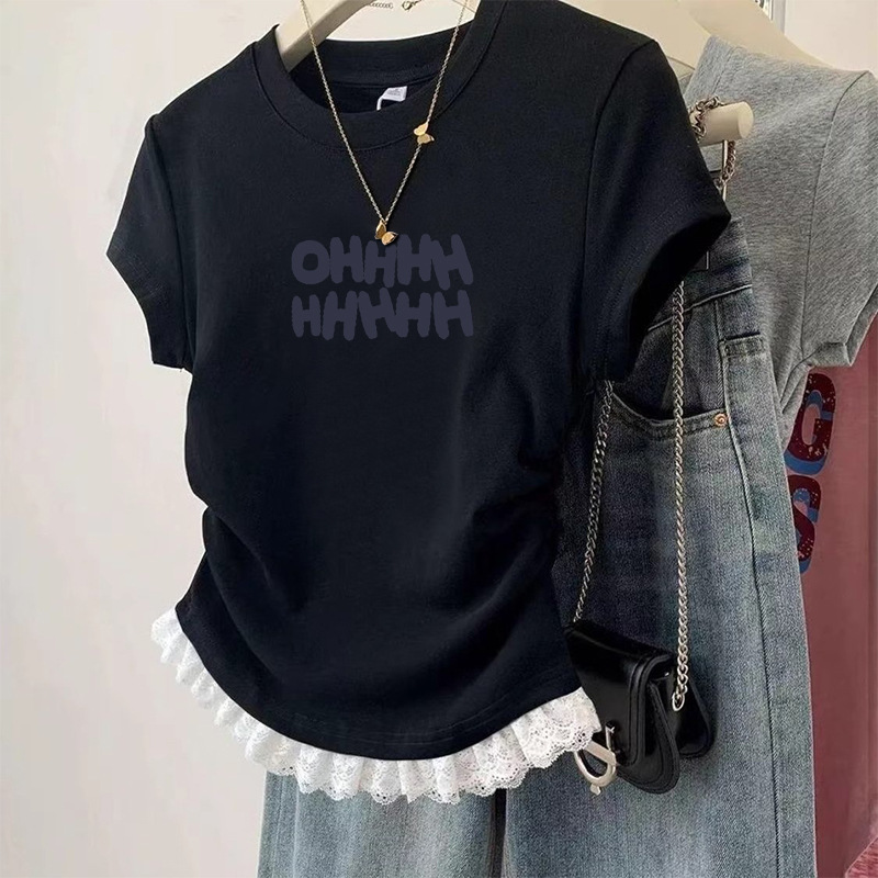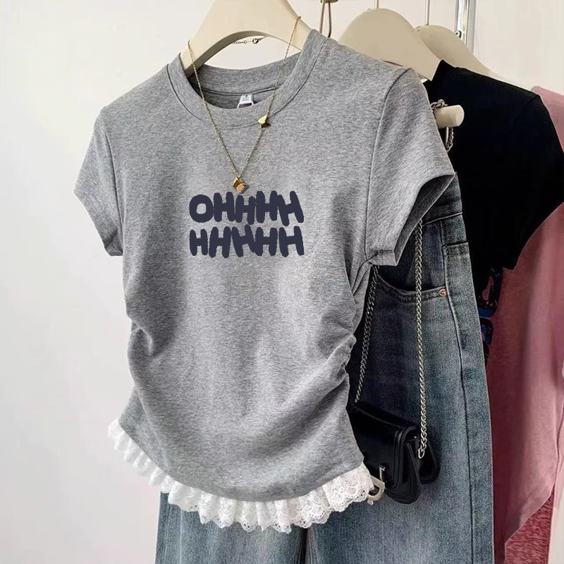 여름 어린이 캐주얼 반팔 소녀 패션 주름 짧은 티셔츠 중대형 어린이 다용도 레이스 바닥 셔츠 탑스토어 가기