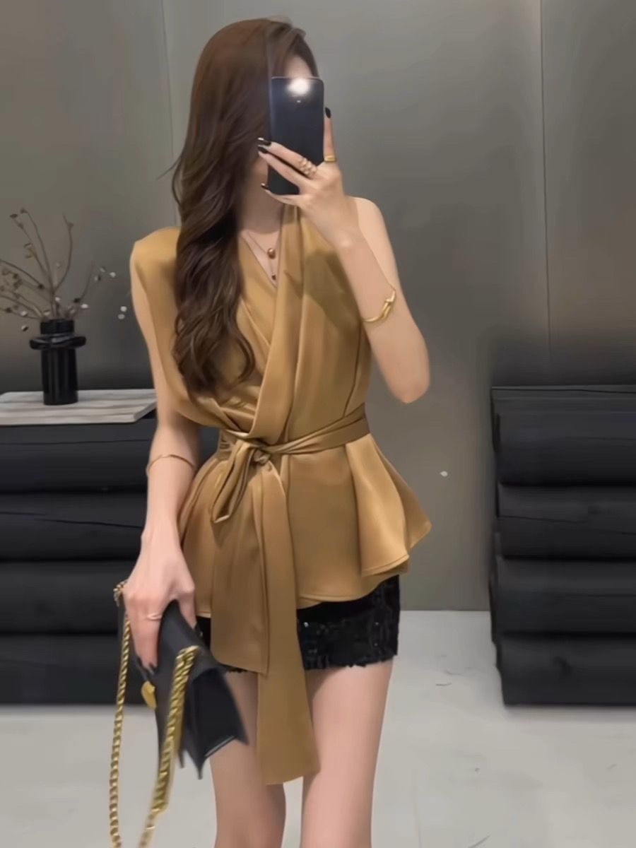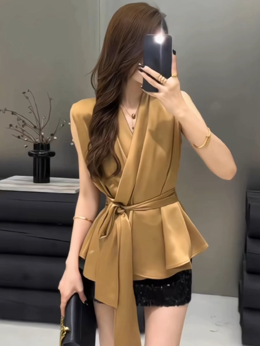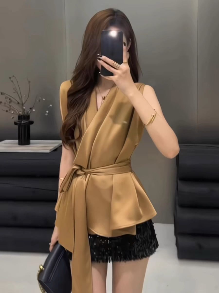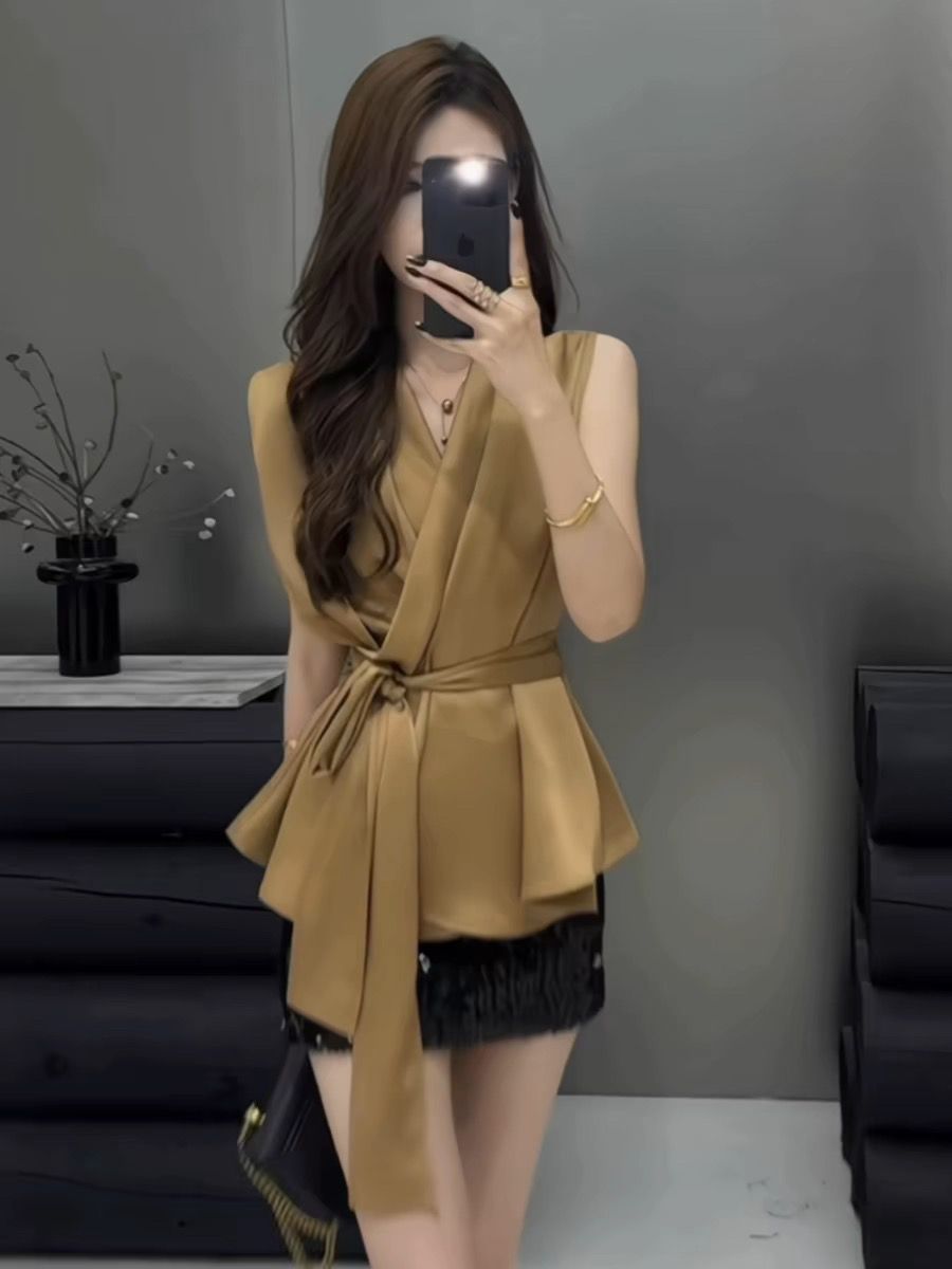 디자인 센스 V 넥 스트랩 허리 민소매 셔츠 여성의 여름 2025 새로운 슬림 핏 슬리밍 우아한 올 매치 탑스토어 가기